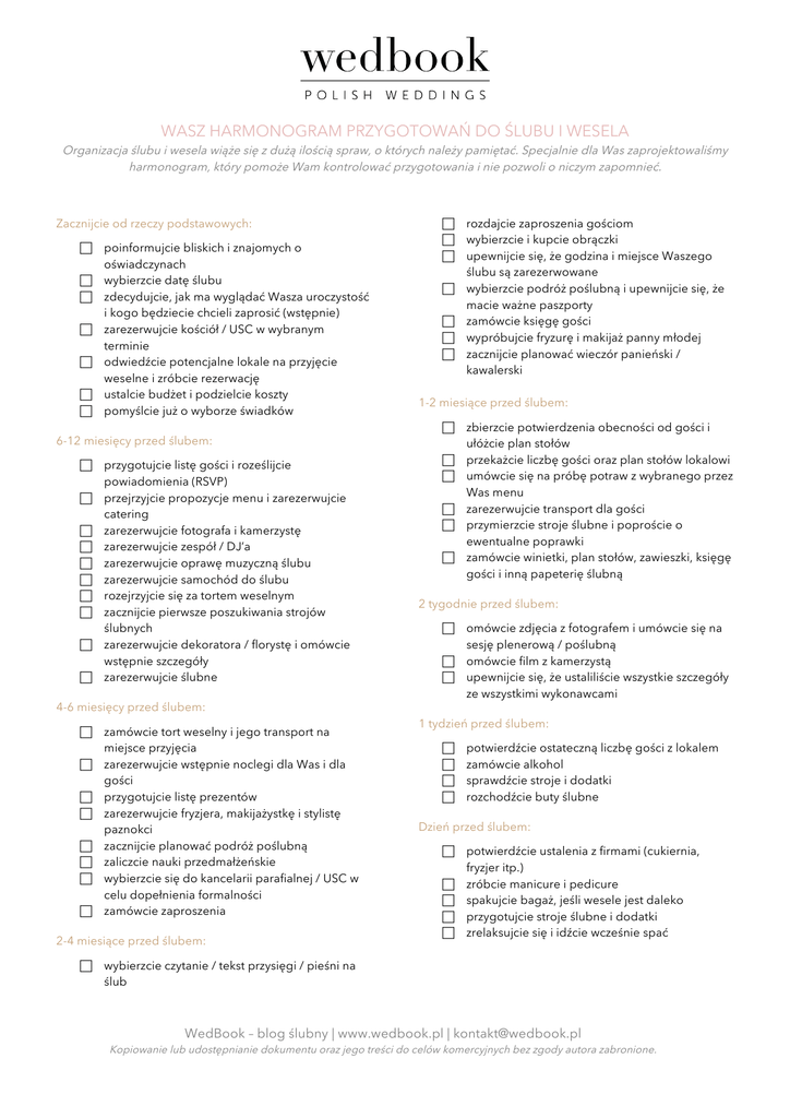WASZ HARMONOGRAM PRZYGOTOWAŃ DO ŚLUBU I WESELA Organizacja ślubu i wesela wiąże się z dużą ilością spraw, o których należy pamiętać. Specjalnie dla Was zaprojektowaliśmy harmonogram, który pomoże Wam kontrolować przygotowania i nie pozwoli o niczym zapomnieć. Zacznijcie od rzeczy podstawowych: ! ! ! ! ! ! ! poinformujcie bliskich i znajomych o oświadczynach wybierzcie datę ślubu zdecydujcie, jak ma wyglądać Wasza uroczystość i kogo będziecie chcieli zaprosić (wstępnie) zarezerwujcie kościół / USC w wybranym terminie odwiedźcie potencjalne lokale na przyjęcie weselne i zróbcie rezerwację ustalcie budżet i podzielcie koszty pomyślcie już o wyborze świadków 6-12 miesięcy przed ślubem: ! ! ! ! ! ! ! ! ! ! przygotujcie listę gości i roześlijcie powiadomienia (RSVP) przejrzyjcie propozycje menu i zarezerwujcie catering zarezerwujcie fotografa i kamerzystę zarezerwujcie zespół / DJ’a zarezerwujcie oprawę muzyczną ślubu zarezerwujcie samochód do ślubu rozejrzyjcie się za tortem weselnym zacznijcie pierwsze poszukiwania strojów ślubnych zarezerwujcie dekoratora / florystę i omówcie wstępnie szczegóły zarezerwujcie ślubne ! ! ! ! ! ! ! 1-2 miesiące przed ślubem: ! ! ! ! ! ! ! ! ! ! ! ! ! zamówcie tort weselny i jego transport na miejsce przyjęcia zarezerwujcie wstępnie noclegi dla Was i dla gości przygotujcie listę prezentów zarezerwujcie fryzjera, makijażystkę i stylistę paznokci zacznijcie planować podróż poślubną zaliczcie nauki przedmałżeńskie wybierzcie się do kancelarii parafialnej / USC w celu dopełnienia formalności zamówcie zaproszenia 2-4 miesiące przed ślubem: ! zbierzcie potwierdzenia obecności od gości i ułóżcie plan stołów przekażcie liczbę gości oraz plan stołów lokalowi umówcie się na próbę potraw z wybranego przez Was menu zarezerwujcie transport dla gości przymierzcie stroje ślubne i poproście o ewentualne poprawki zamówcie winietki, plan stołów, zawieszki, księgę gości i inną papeterię ślubną 2 tygodnie przed ślubem: ! ! ! 4-6 miesięcy przed ślubem: ! rozdajcie zaproszenia gościom wybierzcie i kupcie obrączki upewnijcie się, że godzina i miejsce Waszego ślubu są zarezerwowane wybierzcie podróż poślubną i upewnijcie się, że macie ważne paszporty zamówcie księgę gości wypróbujcie fryzurę i makijaż panny młodej zacznijcie planować wieczór panieński / kawalerski omówcie zdjęcia z fotografem i umówcie się na sesję plenerową / poślubną omówcie film z kamerzystą upewnijcie się, że ustaliliście wszystkie szczegóły ze wszystkimi wykonawcami 1 tydzień przed ślubem: ! ! ! ! potwierdźcie ostateczną liczbę gości z lokalem zamówcie alkohol sprawdźcie stroje i dodatki rozchodźcie buty ślubne Dzień przed ślubem: ! ! ! ! ! potwierdźcie ustalenia z firmami (cukiernia, fryzjer itp.) zróbcie manicure i pedicure spakujcie bagaż, jeśli wesele jest daleko przygotujcie stroje ślubne i dodatki zrelaksujcie się i idźcie wcześnie spać wybierzcie czytanie / tekst przysięgi / pieśni na ślub WedBook – blog ślubny | www.wedbook.pl | [email protected] Kopiowanie lub udostępnianie dokumentu oraz jego treści do celów komercyjnych bez zgody autora zabronione.