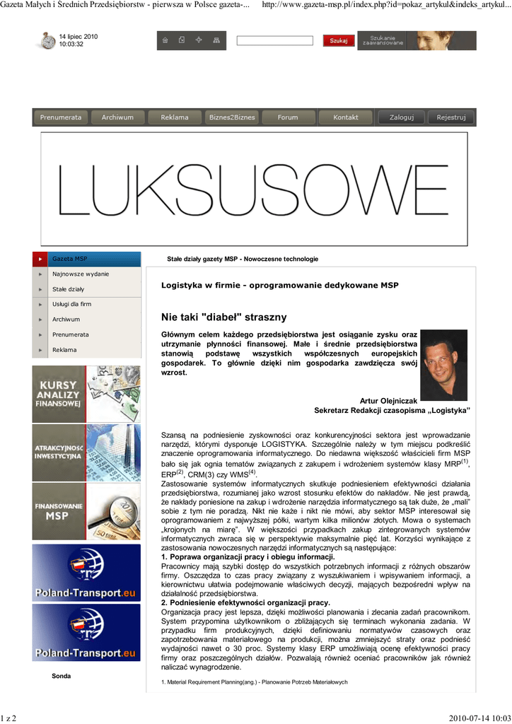 Gazeta Małych i Średnich Przedsiębiorstw - pierwsza w Polsce gazeta-... http://www.gazeta-msp.pl/index.php?id=pokaz_artykul&indeks_artykul... 14 lipiec 2010 10:03:32 Gazeta MSP Stałe działy gazety MSP - Nowoczesne technologie Najnowsze wydanie Stałe działy Logistyka w firmie - oprogramowanie dedykowane MSP Usługi dla firm Archiwum Nie taki "diabeł" straszny Prenumerata Głównym celem każdego przedsiębiorstwa jest osiąganie zysku oraz utrzymanie płynności finansowej. Małe i średnie przedsiębiorstwa stanowią podstawę wszystkich współczesnych europejskich gospodarek. To głównie dzięki nim gospodarka zawdzięcza swój wzrost. Reklama Artur Olejniczak Sekretarz Redakcji czasopisma „Logistyka” Szansą na podniesienie zyskowności oraz konkurencyjności sektora jest wprowadzanie narzędzi, którymi dysponuje LOGISTYKA. Szczególnie należy w tym miejscu podkreślić znaczenie oprogramowania informatycznego. Do niedawna większość właścicieli firm MSP (1) bało się jak ognia tematów związanych z zakupem i wdrożeniem systemów klasy MRP , (2) (4) ERP , CRM(3) czy WMS . Zastosowanie systemów informatycznych skutkuje podniesieniem efektywności działania przedsiębiorstwa, rozumianej jako wzrost stosunku efektów do nakładów. Nie jest prawdą, że nakłady poniesione na zakup i wdrożenie narzędzia informatycznego są tak duże, że „mali” sobie z tym nie poradzą. Nikt nie każe i nikt nie mówi, aby sektor MSP interesował się oprogramowaniem z najwyższej półki, wartym kilka milionów złotych. Mowa o systemach „krojonych na miarę”. W większości przypadkach zakup zintegrowanych systemów informatycznych zwraca się w perspektywie maksymalnie pięć lat. Korzyści wynikające z zastosowania nowoczesnych narzędzi informatycznych są następujące: 1. Poprawa organizacji pracy i obiegu informacji. Pracownicy mają szybki dostęp do wszystkich potrzebnych informacji z różnych obszarów firmy. Oszczędza to czas pracy związany z wyszukiwaniem i wpisywaniem informacji, a kierownictwu ułatwia podejmowanie właściwych decyzji, mających bezpośredni wpływ na działalność przedsiębiorstwa. 2. Podniesienie efektywności organizacji pracy. Organizacja pracy jest lepsza, dzięki możliwości planowania i zlecania zadań pracownikom. System przypomina użytkownikom o zbliżających się terminach wykonania zadania. W przypadku firm produkcyjnych, dzięki definiowaniu normatywów czasowych oraz zapotrzebowania materiałowego na produkcji, można zmniejszyć straty oraz podnieść wydajności nawet o 30 proc. Systemy klasy ERP umożliwiają ocenę efektywności pracy firmy oraz poszczególnych działów. Pozwalają również oceniać pracowników jak również naliczać wynagrodzenie. Sonda 1. Material Requirement Planning(ang.) - Planowanie Potrzeb Materiałowych 1z2 2010-07-14 10:03 Gazeta Małych i Średnich Przedsiębiorstw - pierwsza w Polsce gazeta-... Życzenia przedsiębiorców - co wpłynie na poprawę funkcjonowanie biznesu w Polsce? http://www.gazeta-msp.pl/index.php?id=pokaz_artykul&indeks_artykul... 2. Enterprise Resource Planning(ang.) - Planowanie Zasobów Przedsiębiorstwa 3. Customer Relationship Management (ang.) – Zarządzanie Relacjami z Klientem 4. Warehouse Management System (ang.) - Magazynowy System Informatyczny Mniej korupcji Mniej polityki w biznesie Rozwiązania dla firmy logistycznej Zmiana systemu podatkowego Zmniejszenie podatków Łatwiejszy dostęp do środków unijnych Łatwiejszy dostęp do kredytów Zmiana ekipy rządzącej Głosuj produkt, usługa Wybierz region Mariusz Partyka Dyrektor Działu Rozwiązań Indywidualnych MAP solutions Korzyści z wdrożenia nowoczesnego systemu informatycznego w firmach logistycznych są widoczne niemal od razu. Szybki dostęp do informacji, możliwość przeprowadzania analiz oraz poprawa komunikacji wewnątrz jednostki – to tylko niektóre zalety wymieniane przez użytkowników. Specyfika funkcjonowania firm, złożoność wykonywania w nich działań powoduje, że nie każde oprogramowanie spełni oczekiwania. Dlatego tak ważny jest wybór odpowiedniego sytemu, a następnie dostosowanie go do potrzeb indywidualnych stanowisk pracy, tak by korzyści z wdrożenia było jak najwięcej. Branża logistyczna jest szczególnie wymagająca, dlatego przed wyborem oprogramowania radziłbym przeprowadzenie szczegółowej Analizy Przedwdrożeniowej, która precyzyjnie wskaże obszary, które mają być wspierane przez system. Może się okazać, że dana firma nie potrzebuje rozbudowanego programu, wystarczą mniej zaawansowane moduły, które z czasem można rozwijać. Najważniejsze z nich dotyczą zarządzania flotą samochodową, planowania tras przejazdów i ich rozliczania, ale wszystko zależy od specyfiki konkretnej firmy. Wdrożenie systemu opierającego się tylko na standardowych funkcjonalnościach może nie wystarczyć. Innych funkcjonalności oczekują firmy logistyczne, innych typowo handlowe. Jeśli naprawdę zależy nam na usprawnieniu pracy, musimy pomyśleć o oprogramowaniu całej firmy, tak, aby każdy z jej obszarów był wspierany wedle potrzeb. Niezależnie od tego, są rozwiązania, które sprawdzą się w niemal każdym przedsiębiorstwie, któremu zależy na usprawnieniu i zautomatyzowaniu pracy. Klientom, którzy zwracają się do nas z takimi problemami radzę wdrożenie systemu, który pozwala na to, by każda wprowadzona przez użytkowników informacja była widoczna w wielu miejscach systemu. Niezbędne jest przede wszystkim usystematyzowanie obiegu dokumentów. Wszystkie wprowadzone do systemu informacje mają wpływ na późniejszą trafność podejmowanych decyzji, usprawniają pracę działów logistycznych. System pozwala na przeprowadzanie szczegółowych analiz i na ich podstawie zaplanowanie dalszej strategii. Firma MAP solutions Sp. z o.o. posiada 18-letnie doświadczenie we wdrażaniu systemów informatycznych. Jest Złotym Autoryzowanym 