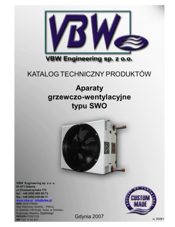 KATALOG TECHNICZNY PRODUKTÓW Aparaty grzewczo-wentylacyjne typu SWO VBW Engineering sp. z o. o. 81-571 Gdynia ul.Chwaszczyńska 172 tel.: +48 (058) 669-05-73 fax.: +48 (058) 629-66-11 www.vbw.pl [email protected] KRS 0000179959 Sąd Rejonowy Gdańsk - Północ w Gdańsku VIII Wydz. Gosp. w Gdańsku Krajowego Rejestru Sądowego REGON 472201129 NIP 725 17 40 637 Gdynia 2007 w. 2008/1 KATALOG PRODUKTÓW VBW Engineering sp. z o.o. 81-571 Gdynia ul. Chwaszczyńska 172 Aparaty grzewczo-wentylacyjne typu SWO Spis treści I. Przeznaczenie ................................................................................................................................................... 3 II. Budowa ............................................................................................................................................................ 3 III. Dane techniczne ............................................................................................................................................. 3 1. Zasięg strumienia aparatów ................................................................................................................ 3 2. Poziom dźwięku .................................................................................................................................. 3 IV. Wykonanie aparatów ...................................................................................................................................... 3 V. Wymiary gabarytowe aparatów ...................................................................................................................... 4 VI. Elementy dodatkowe ...................................................................................................................................... 4 1. Komora mieszania z filtrem - KWO ..................................................................................................... 4 2. Nawiewnik NWO.........................................................................................................................................4 3. Komora z filtrem - FWO.............................................................................................................................4 4.Charakterystyka cieplna standardowych nagrzewnic wodnych ( woda 90/70 ).........................................4 VII. Pozycje pracy ................................................................................................................................................ 4 VIII. Sposób mocowania ...................................................................................................................................... 5 IX. Eksploatacja .................................................................................................................................................... 5 1.Nagrzewnica wodna ........................................................................................................................5 2. Zabezpieczenie przeciwzamrożeniowe......................................................................................................5 3.Komora mieszania ......................................................................................................................................6 X. Uruchomienie ................................................................................................................................................... 6 1. Filtr................................................................................................................................................................6 2. Nagrzewnica...............................................................................................................................................6 3. Wentylator....................................................................................................................................................7 4.Wskazówki bezpieczeństwa.......................................................................................................................7 5.Okresowe przeglądy....................................................................................................................................7 XI. Automatyka...............................................................................................................................................7 XII. Obsługa i konserwacja .................................................................................................................................. 7 XIII. Transport i składowanie ............................................................................................................................... 7 XIV. Serwis ........................................................................................................................................................... 7 XV. Sposób zamawiania aparatu ........................................................................................................................ 8 strona 2 Katalog produktów VBW Engineering 2008 / 1 KATALOG PRODUKTÓW VBW Engineering sp. z o.o. 81-571 Gdynia ul. Chwaszczyńska 172 Aparaty grzewczo-wentylacyjne typu SWO I. Przeznaczenie Aparaty grzewczo wentylacyjne SWO z wentylatorem osiowym przeznaczone są do ogrzewania pomieszczeń takich jak: hale przemysłowe, warsztaty, magazyny, pawilony itp. Pracują zwykle na powietrzu obiegowym. Istnieje możliwość zamontowania dodatkowej komory mieszającej i wówczas mogą mieszać powietrze obiegowe i zewnętrzne lub czerpać tylko powietrze zewnętrzne. W ofercie producenta VBW Engineering dostępne są również aparaty SW nie wyposażone w nagrzewnicę, służące do wentylacji pomieszczeń. II. Budowa Aparaty wykonane są jako konstrukcja samonośna z blachy stalowej malowanej. Obudowa jest nieizolowana. W skład każdego urządzenia wchodzi wentylator osiowy i nagrzewnica wodna. Standardowo nagrzewnica dostosowana j