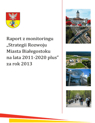 Raport z monitoringu „Strategii Rozwoju Miasta Białegostoku na lata 2011-2020 plus” za rok 2013 Spis treści Wykaz skrótów: .................................................................................................................................................................. 8 ANALIZA WSKAŹNIKOWA REALIZACJI STRATEGII ROZWOJU MIASTA BIAŁEGOSTOKU NA LATA 2011-2020 PLUS ......... 10 Cel strategiczny A Przestrzeń Miasta – zharmonizowane, przyjazne środowisko do życia i rozwoju ........................ 14 A. 1. Kreowanie prawidłowej i racjonalnej struktury funkcjonalno-przestrzennej z uwzględnieniem wartości kulturowych i przyrodniczych ............................................................................................................................. 14 A. 2. Tworzenie efektywnego systemu komunikacyjnego Miasta z dużym udziałem transportu zbiorowego oraz ruchu rowerowego ............................................................................................................................................. 16 A. 3. Zapewnienie dostępności nowoczesnych, efektywnych i niezawodnych systemów infrastruktury technicznej19 A. 4. Poprawa stanu środowiska przyrodniczego przy wzroście udziału urządzonych terenów zieleni miejskiej ...... 20 Cel strategiczny B Wysoka jakość kapitału ludzkiego i bezpieczeństwo społeczne mieszkańców ............................... 27 B.1. Wspieranie rozwoju tożsamości i aktywności lokalnej ........................................................................................ 27 B.2. Rozwój osobowy i zawodowy mieszkańców ........................................................................................................ 28 B.3. Wzrost jakości i innowacyjności kształcenia ........................................................................................................ 30 B.4. Poprawa bezpieczeństwa publicznego ................................................................................................................ 32 B.5. Wspieranie rodzin ................................................................................................................................................ 33 B.6. Wspomaganie postaw prozdrowotnych i zdrowego trybu życia mieszkańców ................................................... 35 B.7. Poprawa skuteczności działań w zakresie pomocy społecznej i integracji .......................................................... 36 Cel strategiczny C Długofalowy wzrost gospodarki opartej na wiedzy i w konsekwencji większa liczba jakościowo lepszych miejsc pracy ..................................................................................................................................................... 51 C.1. Wzmocnienie ponadlokalnej konkurencyjności firm sektora MSP ...................................................................... 51 C.2. Rozwój innowacyjnej gospodarki ......................................................................................................................... 51 C.3. Pozyskanie inwestorów zewnętrznych krajowych oraz zagranicznych ................................................................ 51 C.4. Rozwój powiązań gospodarczych ze wschodnimi sąsiadami Polski i UE – Białystok liderem współpracy wschodniej .......................................................................................................................................................... 52 Cel strategiczny D Atrakcyjność i dostępność oferty kulturalnej, sportowej, turystycznej i rekreacyjnej................. 56 D.1. Wspieranie środowisk twórczych w Mieście i rozwój infrastruktury kulturalnej ................................................ 56 D.2. Kreowanie przedsięwzięć kulturalnych o prestiżowym znaczeniu krajowym i międzynarodowym .................... 56 D.3. Tworzenie regionalnego centrum turystycznego ................................................................................................ 57 D.4. Wspieranie przedsiębiorczości w sferze turystyki i działalności kulturalnej........................................................ 57 D.5. Promowanie aktywnych stylów życia i rozwój infrastruktury rekreacyjnej ......................................................... 57 D.6. Tworzenie sportowego centrum o znaczeniu ponadregionalnym ...................................................................... 58 Cel strategiczny E Rozwój powiązań białegostoku z bliższym i dalszym otoczeniem .................................................. 64 E.1. Integracja planistyczna obszaru metropolitalnego .............................................................................................. 64 E.2. Usprawnienie powiązań infrastrukturalnych obszaru metropolitalnego ............................................................. 64 E.3. Wzrost dostępności do usług sfery społecznej w obszarze metropolitalnym ...................................................... 64 E.4. Tworzenie wysokiej atrakcyjności inwestycyjnej obszaru metropolitalnego ....................................................... 65 E.5. Rozwój zewnętrznych powiązań obszaru metropolitalnego ze szczególnym uwzględnieniem Białegostoku ..... 65 PODSUMOWANIE DZIAŁAŃ PODEJMOWANYCH W 2012 ROKU W MIEŚCIE BIAŁYSTOK ................................................. 70 A. Przestrzeń Miasta – zharomonizowane przyjazne środowisko do życia i rozwoju .................................................. 70 A.1. Kreowanie prawidłowej i racjonalnej struktury funkcjonalno-przestrzennej z uwzględnieniem wartości kulturowych i przyrodniczych ............................................................................................................................. 70 3 A.2. Tworzenie efektywnego systemu komunikacyjnego Miasta z dużym udziałem transportu zbiorowego oraz ruchu rowerowego ...........................................................