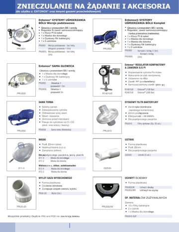 ZNIECZULANIE NA ŻĄDANIE I AKCESORIA (do użytku z: ENTONOX® oraz innymi gazami przeciwbólowymi) PRU001 Entonox® SYSTEMY UŚMIERZANIA BÓLU Wersja podstawowa Entonox® SYSTEMY UŚMIERZANIA BÓLU Komplet • Głowica z przewodem BS i sondą • Regulator & zawór samouszczelniający • 1 x Klucz PI & kabel • 1 x Maska dla dorosłego • 1 x Dyskowy filtr bakteryjny • 1 x 5 ustników • Głowica z przewodem BS i sondą • Regulator, zawór samouszczelniający PRU001 Wersja podstawowa - bez torby (długość przewodu 1.5m) PRU001L Wersja podstawowa - bez torby (3m) i torba przenośna (niebieska) PRU002 • Dopasowanie cylindra Pin-Index • Wykonanie ze stali nierdzewnej • Ustawione na 4Bar • Zawór HP (podświetlany) • Samouszczelniany zawór gazu BS • • • PRU003L PRU003 R14015/E 011-4 R14015/E R24015/E Entonox® (138 Bar) Entonox® (200 Bar) SAMA TORBA DYSKOWY FILTR BAKTERYJNY • Solidny zamek • Zabezpieczenie cylindra • Odblaskowe szwy zewn. • Wewn. kieszenie • Ochrona przed mikrobami • Pasuje do cylindrow roz D i CD • Zamknięta membrana zapobiega kontaminacji • 22mm podłączenia • Efektywność >99.9999% • Dla pojedynczego pacjenta PRU010 (dost. inne kolory i fasony) PRU050 Komplet z torbą (1.5m) Kompet z torbą (3m) Entonox® REGULATOR KOMPAKTOWY & ZAWOREK S/S PI Głowica z przewodem BS i sondą 1 x Maska dla dorosłego 1 x Dyskowy filtr bakteryjny 1 x 5 ustników Głowica + przewód 1.5m Głowica + przewód 3m PRU002 PRU002L Entonox® SAMA GŁOWICA PRU003 • 1 x Klucz PI & kabel • 1 x Maska dla dorosłego • 1 x Maska dla dziecka • 1 x Dyskowy filtr bakteryjny • 1 z 5 ustników PRU050 Sama torba (Niebieska) Filtry dyskowe (Op. 50 szt.) PRU010 MASKI USTNIKI • Podł. 22mm (obie) • Nadmuchiwana (s.p.u) • Zamykana (silikon) • Forma plastikowa • Podł. 22mm • Dla pojedynczego pacjenta Dla pojedynczego pacjenta, jasny plastik 011-4 Maska dla dorosłego 011-2 Maska dla dziecka 332555 Wielorazowa, silikon, autoklawowalne 012-4 Maska dla dorosłego Maska dla dziecka 012-2 Ustniki (5 szt.) 332555 WYLOT GAZU WYDECHOWEGO UCHWYT ŚCIENNY • Forma plastikowa • Działanie obrotowe • Zastępuje czopek zaworu wylotu • Forma plastikowa PRU0-20 PRU003/W PRU003/WR Uchwyt i śruby Uchwyt na szynę Wylot (Szt.) OP. MATERIAŁÓW ZUŻYWALNYCH PRU0-20 Wszystkie produkty Oxylitre PRU and POD nie zawierają lateksu PRU003/W Zawiera: 10 x Filtry bakteryjne 2 x Ustniki 1 x Maska dla dorosłego • • • PRU010-SUP