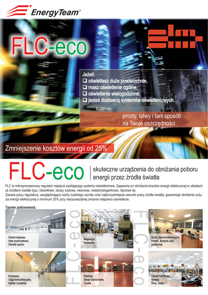 EnergyTeam FLC--eco FLC Jeżeli: oświetlasz duże powierzchnie, masz oświetlenie ogólne, oświetlenie wielogodzinne, jesteś dostawcą systemów oświetleniowych. to istnieje prosty, łatwy i tani sposób na Twoje oszczędności Zmniejszenie kosztów energii od 25% FLC--eco skuteczne urządzenia do obniżania poboru energii przez źródła światła FLC to mikroprocesorowy regulator napięcia zasilającego systemy oświetleniowe. Zapewnia on obniżenie kosztów energii elektrycznej w układach ze źródłami światła typu: (świetlówki, lampy sodowe, neonowe, metalohalogenkowe, rtęciowe itp. Zasada pracy regulatora, uwzględniająca cechy ludzkiego wzroku oraz najkorzystniejsze warunki pracy źródła światła, gwarantuje obniżenie zużycia energii elektrycznej o minimum 25% przy niezauważalnej zmianie natężenia oświetlenia. Korytarze, Ciągi komunikacyjne, Szkoły i uczelnie Magazyny, Hurtownie Parkingi, Stacje benzynowe, Tunele FLC-eco Centra targowe, Hale przemysłowe, Ośrodki sportu FLC-eco Typowe zastosowania: Biura, Sale konferencyjne, Hotele, Budynki użyt. publicznej Centra handlowe, Sklepy, Kina, Teatry Regulator, który programowo można dostosować do współpracy z odpowiednimi źródłami światła, dostosowuje parametry pracy do odpowiedniej lampy. Podstawowy wymóg poprawnej i długotrwałej pracy źródła światła jest początkowy cykl pracy - nagrzewanie. Każde załączenie oświetlenia powoduje zasilenie lampy napięciem znamionowym. Po czasie, typowym dla danej lampy, regulator przechodzi w cykl energooszczędny. Podczas funkcji oszczędzania energii (Energy Saving) jeżeli złączona zostanie kolejna lampa (minimalny wzrost poboru prądu 0,5A), urządzenie automatycznie rozpozna zmianę w układzie i poda pełne napięcie w celu rozgrzania nowo załączonej lampy. Po upływie określonego czasu system powraca do trybu oszczędzania energii. ZMNIEJSZ ZENIE KOSZTÓW OD 25%... Dane techniczne: Zasilanie 230 V jednofazowe, wyjście 190 V w trybie oszczędzania energii. Dostępne są trzy tryby obniżania napięcia w przypadku różnej jakości napięcia zasilania. Wyświetlacz LCD w formacie 2x16 do informowania o poborze energii, zdarzeniach. Możliwość podłączenia do sieci LAN. Możliwość ustawienia automatycznych zadań: · kontrola obciążenia, · czas przejścia od stanu pełnego napięcia (100%) do stanu oszczędnościowego (Energy Saving), · Stałe lub chwilowe (od 10 do 600 sekund) obejście systemu w celu podania pełnego napięcia w układzie, · Wykrywanie załączenia kolejnej lampy (grupy lamp) od 0,5 A do 5 A w celu podania pełnego napięcia i rozgrzania lamp, · Przejście z trybu oszczędzania w tryb pełnego napięcia w przypadku zmniejszenia poziomu napięcia na przyłączu głównym. Przykład: Test wykonany z 11 lampami metalohalogenkowymi, moc znamionowa lampy – 250W. Start Tryb oszczędzania V 225 225 Pobierany prąd A 13,18 8,12 Pobierana moc VA 2966 1827 Napięcie zasilania Oszczędność energii 38% Przyjęto, że lampy świecą przez 12 godzin dziennie przez 240 dni w roku (2900 godzin rocznie). Dla uproszczenia testu przyjęto pobieraną moc w VA. Zestawienie roczne: 11 lamp o mocy znamionowej 250W Pobór bez FLC = 2966 VA x 2900 = 8601 KWh rocznie Pobór z FLC = 1827 VA x 2900 = 5298 kWh → ROCZNA OSZCZĘDNOŚĆ ENERGII 3303 kWh ROCZNA OSZCZĘDNOŚĆ ENERGII 3303 kWh Informacje o luminescencji Normy polskie podobnie jak normy europejskie określają minimalne wartości natężenia oświetlenia w danych pomieszczeniach i przestrzeniach otwartych (biura, korytarze, magazyny, parkingi). Natężenie (lux) Wymagania wzrokowe, miejsca oświetlane 20-50 Obszary zewnętrzne przyległe do wejść 50-100 Drogi transportowe i miejsca krótkiego postoju 100-200 Nieregularne miejsca pracy, nadzór, depozyty, korytarze 150-300 Tymczasowe miejsce pracy w obszarach zautomatyzowanych 200-500 Praca w miejscach normalnego oświetlenia, sale konferencyjne 300-750 Praca w miejscach zwiększonych wymagań oświetleniowych, kontrola jakości 500-1000 Praca w jeszcze wyższych wymaganiach oświetleniowych, kontrola wizualna Połączenie (nie wymaga dużych zmian w istniejącej instalacji) Grupa 1 Grupa 2 Zabezpieczenie odpływu Zasilanie główne Strefa instalacji 1 Strefa instalacji 2 NIE WYMAGA DUŻYCH ZMIAN W ISTNIEJĄCEJ INSTALACJI. Regulator FLC nie jest źródłem zakłóceń. REGULATOR FLC NIE JEST ŹRÓDŁEM Ź Ó ZAKŁÓCEŃ. Ó Ń Żeby zapewnić stawiane wymagania, na etapie projektu budowlanego instalacji oświetleniowej, w większości projektów źródła światła dobiera się z dużym zapasem. Powoduje to wzrost kosztów zarówno elementów instalacji jak i jej późniejszej eksploatacji. Dlatego zastosowanie regulatora FLC prowadzi do ograniczenia zużycia energii elektrycznej utrzymując warunki oświetlenia zgodne z normami. W przypadku standardowych żarówek lub lamp halogenowych, strumień światła bardzo zależy od napięcia, np. dwukrotny spadek napięcia powoduje czterokrotny spadek strumienia świetlnego. Wynika to ze wzoru P=U2/R. Lampy wyładowcze działają na innej zasadzie, przez co obniżenie napięcia powoduje, przy stabilnej pracy źródeł światła, zmianę natężenia światła proporcjonalną do obniżenia poboru energii. Dostępne modele: Typ Moc Prąd Wymiar FLC 10 2 kVA 10 A 250 x 156 x 190 FLC 15 3 kVA 15 A 270 x 166 x 190 FLC 25 5 kVA 25 A 270 x 186 x 190 FLC 45 10 kVA 45 A 270 x 206 x 190 FLC 60 15 kVA 60 A 270 x 220 x 200 Mierząc natężenie oświetlenia za pomocą przyrządu pomiarowego (luksomierza), po zmianie napięcia zasilania, zmieni się też natężenie. Jednak oko ludzkie nie dostrzega tej niewielkiej zmiany, przez co można bezpiecznie obniżyć napięcie. Efekty wizualne pozostają praktycznie takie same. Właściwości urządzenia Urządzenie rozpoznaje załączenie nowego obciążenia (kolejnych lamp). Można ustawić czułość od 0,5 do 5 A w zależności od spodziewanych zmian.