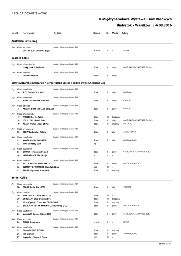 Katalog powystawowy: X Międzynarodowa Wystawa Psów Rasowych Białystok - Wasilków, 3-4.09.2016 Nr kat. Nazwa psa Sędzia Ocena Lok. Medal Tytuły Australian Cattle Dog Suki Klasa szczeniąt 1 DESERT ROSE Zbójecka Saga Sędzia: Katarzyna Fiszdon (PL) w.obiec I - NSZwR, dosk. I złoty CACIB, CWC/CAC, NDP/NDS, Zw.Rasy, dosk. I złoty dosk. I złoty Zw.Młodz., dosk. I złoty CWC/CAC, dosk. I złoty CWC/CAC, Bearded Collie Psy Klasa championów 2 Lucky Luck El'Bridorado Suki Klasa otwarta 3 Cudna Buhlbino Sędzia: Katarzyna Fiszdon (PL) Sędzia: Katarzyna Fiszdon (PL) Biały owczarek szwajcarski / Berger Blanc Suisse / White Swiss Shepherd Dog Psy Psy Psy Psy Klasa młodzieży 4 ASTI Zeichen Von Wolf Sędzia: Katarzyna Fiszdon (PL) Klasa pośrednia 5 FIRST DIEGO Biała Wiedźma Sędzia: Katarzyna Fiszdon (PL) Sędzia: Katarzyna Fiszdon (PL) Klasa otwarta 6 Atlayn's DUKE IZ BELOY BRIGADY Klasa championów 7 FRISECCO of Ice Wine Sędzia: Katarzyna Fiszdon (PL) dosk. III brązowy 8 LORD LEXUS Domi Pearl dosk. I złoty CACIB, CWC/CAC, NDP/NDS, Zw.Rasy, 9 MIZAR Whiter Shade of Pale dosk. II srebrny Res-CACIB, dosk. I złoty Zw.WET, NWwR, dosk. I złoty Zw.Młodz., NJwR, nb - - dosk. I złoty nb - - dosk. I złoty Klasa weteranów 10 BLOW Fortunatus Poland Sędzia: Katarzyna Fiszdon (PL) Suki Klasa młodzieży 11 KONTRA Biała Pasja (FCI) Sędzia: Katarzyna Fiszdon (PL) Psy 12 Whisky Dobry Duch Suki Klasa pośrednia 13 GLORIA Fortunatus Poland 14 Sędzia: Katarzyna Fiszdon (PL) JASMINE-JADE Biała Pasja Sędzia: Katarzyna Fiszdon (PL) Suki Klasa otwarta 15 BALTIC BEAUTY MADE MY DAY 16 ELEMENT OF SURPRISE Biała Wiedźma bdb III - 17 SZAGA Jagodowe Bory (FCI) dosk. II srebrny dosk. I złoty dosk. IV - dosk. III brązowy CACIB, CWC/CAC, NDP/NDS, BOS, Res-CACIB, CWC/CAC, Border Collie Psy Psy Klasa pośrednia 18 FRODO Buffy Stars (FCI) Sędzia: Katarzyna Fiszdon (PL) Klasa otwarta 19 AMAZING BOY Blue Bricassart Sędzia: Katarzyna Fiszdon (PL) 20 Psy BROOKLYN Blue Bricassart FCI CWC/CAC, 21 Nice of you to Come Bye ONE BY ONE dosk. II srebrny 22 STARLIGHT IN SAN MARINO Clan Fair Play (FCI) dosk. I złoty Res-CACIB, CWC/CAC, dosk. I złoty CACIB, CWC/CAC, NDP/NDS, BOS, w.obiec I - NSZwR, Klasa użytkowa 23 Vermouth Double Vision (FCI) Sędzia: Katarzyna Fiszdon (PL) Suki Klasa szczeniąt 24 DIANA Komarowo Sędzia: Katarzyna Fiszdon (PL) Suki Klasa młodzieży 25 Demssin WILD FLOWER Sędzia: Katarzyna Fiszdon (PL) dosk. II srebrny 26 IZIS Zejman dosk. I złoty 27 Legendary Stardust Puma bdb III - Zw.Młodz., NJwR, Strona 1 z 47 Nr kat. Suki Klasa pośrednia 28 Best One for Xmas 29 Lok. Medal Tytuły db - - dosk. I złoty CACIB, CWC/CAC, NDP/NDS, Zw.Rasy, dosk. I złoty Res-CACIB, CWC/CAC, dosk. II srebrny dosk. I złoty CWC/CAC, Sędzia: Katarzyna Fiszdon (PL) SURI FROM Vertical Limit Suki Klasa championów 32 VANILA Double Vision (FCI) Ocena Sędzia: Katarzyna Fiszdon (PL) INANA Zejman Suki Klasa otwarta 30 PIPPI L. Double Vision FCI 31 Sędzia Nazwa psa Sędzia: Katarzyna Fiszdon (PL) Bouvier des Flandres / Vlaamse Koehond / Bouvier des Flandres Psy Klasa championów 33 Don Corleone Bouvi-Buzi 34 Sędzia: Mariola Agata Semik (PL) WAR BOUVIATOR HIT TATTU'S SAMMUEL Suki Klasa młodzieży 35 LARA Bouviery z Regla dosk. II srebrny Res-CACIB, dosk. I złoty CACIB, CWC/CAC, NDP/NDS, Zw.Rasy, dosk. I złoty Zw.Młodz., bdb I - dosk. I złoty Zw.Młodz., NJwR, dosk. I złoty CWC/CAC, dosk. I złoty CACIB, CWC/CAC, NDP/NDS, Zw.Rasy, dosk. I złoty CACIB, CWC/CAC, NDP/NDS, Zw.Rasy, Sędzia: Mariola Agata Semik (PL) Sędzia: Mariola Agata Semik (PL) Suki Klasa pośrednia 36 GEORGIA Z GRODU KSIĄŻĄT POMORSKICH Ceskoslovenský Vlciak / Ceskoslovenský Vlciak / Czechoslovakian Wolfdog Psy Psy Klasa młodzieży 37 NYJA II z Peronówki Sędzia: Katarzyna Fiszdon (PL) Klasa championów 38 ARGENTUM VOLF IZ VITAIRII Sędzia: Katarzyna Fiszdon (PL) Suki Klasa championów 39 CALINECZKA Wilk z Baśni Sędzia: Katarzyna Fiszdon (PL) Owczarek australijski - Kelpie / Australian Kelpie Psy Sędzia: Katarzyna Fiszdon (PL) Klasa użytkowa 40 STRONG EXCALIBUR Red Radimus Owczarek australijski (typ amerykański) / Australian Shepherd Psy Sędzia: Katarzyna Fiszdon (PL) Klasa pośrednia 41 AT HEXENHAUS PORTOS Sfora z Krasnego Boru dosk. II srebrny Res-CACIB, 42 CARLOS ZULAJO Różany Gaj (FCI) dosk. I złoty CACIB, CWC/CAC, NDP/NDS, BOS, 43 UNLOCK THE FIRE Moto Pies dosk. III brązowy brązowy Suki Klasa młodzieży 44 COOKIE MONSTER Nescaland Sędzia: Katarzyna Fiszdon (PL) dosk. III 45 HEY THERE DELILAH Labakan Slovakia dosk. II srebrny 46 UP IN FLAMES Moto Pies dosk. I złoty dosk. I złoty dosk. I złoty Suki Klasa pośrednia 47 BONA Kiwi Tasmański Diabeł Zw.Młodz., NJwR, Sędzia: Katarzyna Fiszdon (PL) Sędzia: Katarzyna Fiszdon (PL) Suki Klasa otwarta 48 Saussurea ROCK N ROLL BABY CACIB, CWC/CAC, NDP/NDS, Zw.Rasy, Owczarek belgijski - Groenendael / Chien de Berger Belge Groenendael / Belgian Shepherd Dog Psy Klasa otwarta 49 EL CHUPACABRA Polaris 50 Sędzia: Mariola Agata Semik (PL) HOT HIT ALIAS DAKOTA Suki Klasa młodzieży 51 MAMMA MIA Polaris Sędzia: Mariola Agata Semik (PL) Suki Klasa otwarta 52 SU MEILE BRASILIA Sędzia: Mariola Agata Semik (PL) dosk. II srebrny dosk. I złoty CACIB, CWC/CAC, NDP/NDS, Zw.Rasy, dosk. I złoty Zw.Młodz., dosk. I złoty CACIB, CWC/CAC, NDP/NDS, Strona 2 z 47 Nr kat. Sędzia Nazwa psa Ocena Lok. Medal Tytuły Owczarek belgijski - Malinois / Chien de Berger Belge Malinois / Belgian Shepherd Dog Suki Klasa młodzieży 53 CORTINA Maligold 54 Sędzia: Mariola Agata Semik (PL) Eli z Krywlan dosk. I złoty dosk. II srebrny Zw.Młodz., NJwR, Owczarek belgijski - Tervueren / Chien de Berger Belge Tervueren / Belgian Shepherd Dog Suki Klasa pośrednia 55 Ketunpolun Kiss me Kate Sędzia: Mariola Agata Semik (PL) dosk. I złoty CACIB, CWC/CAC, NDP/NDS, Zw.Rasy, dosk. I złoty CACIB, CWC/CAC, NDP/NDS, Zw.Rasy, nb - - nb - - dosk. I złoty bdb I - dosk. I złoty nb - - Owczarek francuski - Bea