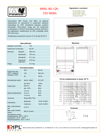 MWL 60-12h 12V 60Ah Zgodność z normami PN-EN 60896-21:2007 PN-EN 60896-22:2007 PN-EN 61056-1:2008 PN-EN 61056-2:2003(U) PN-E-83016:1999 Akumulatory MW Power serii MWL są głównie dedykowane do stosowania w systemach zasilania awaryjnego np. UPS, oświetlenie awaryjne, systemy automatyki. Akumulatory mogą być też stosowane w aplikacjach, w których akumulatory pracują cyklicznie. Dla głębokości rozładowania do 50% posiadają około 400 cykli pracy. Projektowana żywotność wynosi 10-12 lat dla 20-25 oC Wymiary Specyfikacja Napięcie nominalne 12V Pojemność nominalna 60 Ah Wymiary Długość 260 mm Szerokość 167 mm Wysokość 211 mm Wysokość całkowita 216 mm Waga 21,5 kg Charakterystyka 20h 60 Ah 10h 58,5 Ah 5h 48 Ah Rezystancja wewn. akum. naład. 6,0 mΩ Pojemność dla 20oC dla 0oC 100% 85% dla -15oC 65% 3 m-ce 91% 6 m-cy 82% 12 m-cy 64% Pojemność dla 25oC i napięcia odcięcia 10,5V Samorozładowanie Terminal Ładowanie Ch-ka rozładowania w temp. 25 oC Śruba M6 (T16) Buforowe Cykliczne Max. prąd ładowa21,0 A nia Max. prąd rozłado600 A (5 sek.) wania Temperatury pracy: Rozładowanie: -20°C ÷ 50°C Ładowanie: -20°C ÷ 50°C Przechowywanie: -20°C ÷ 50°C 13,50-13,80V 14,40-15,00V Terminal BIURO HANDLOWE: WARSZAWA UL. STANIEWICKA 14 TEL. 32 44 00 960 FAX 32 44 00 873 E-MAIL: [email protected]