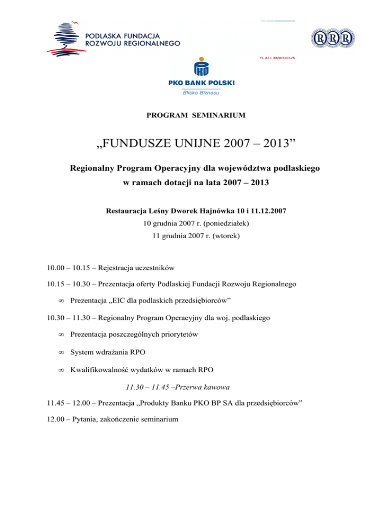 PROGRAM SEMINARIUM „FUNDUSZE UNIJNE 2007 – 2013” Regionalny Program Operacyjny dla województwa podlaskiego w ramach dotacji na lata 2007 – 2013 Restauracja Leśny Dworek Hajnówka 10 i 11.12.2007 10 grudnia 2007 r. (poniedziałek) 11 grudnia 2007 r. (wtorek) 10.00 – 10.15 – Rejestracja uczestników 10.15 – 10.30 – Prezentacja oferty Podlaskiej Fundacji Rozwoju Regionalnego • Prezentacja „EIC dla podlaskich przedsiębiorców” 10.30 – 11.30 – Regionalny Program Operacyjny dla woj. podlaskiego • Prezentacja poszczególnych priorytetów • System wdrażania RPO • Kwalifikowalność wydatków w ramach RPO 11.30 – 11.45 –Przerwa kawowa 11.45 – 12.00 – Prezentacja „Produkty Banku PKO BP SA dla przedsiębiorców” 12.00 – Pytania, zakończenie seminarium
