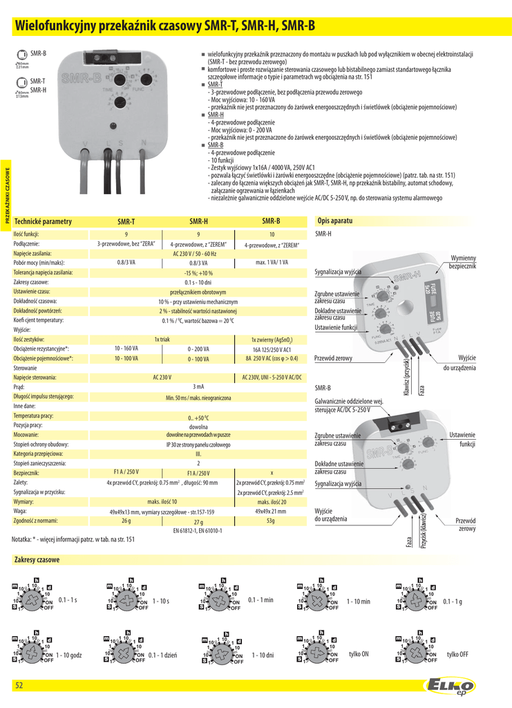 Wielofunkcyjny przekaźnik czasowy SMR-T, SMR-H, SMR-B SMR-B wielofunkcyjny przekaźnik przeznaczony do montażu w puszkach lub pod wyłącznikiem w obecnej elektroinstalacji (SMR-T - bez przewodu zerowego) ! komfortowe i proste rozwiązanie sterowania czasowego lub bistabilnego zamiast standartowego łącznika szczegołowe informacje o typie i parametrach wg obciążenia na str. 151 ! SMR-T - 3-przewodowe podłączenie, bez podłączenia przewodu zerowego - Moc wyjściowa: 10 - 160 VA - przekaźnik nie jest przeznaczony do żarówek energooszczędnych i świetlówek (obciążenie pojemnościowe) ! SMR-H - 4-przewodowe podłączenie - Moc wyjściowa: 0 - 200 VA - przekaźnik nie jest przeznaczone do żarówek energooszczędnych i świetlówek (obciążenie pojemnościowe) ! SMR-B - 4-przewodowe podłączenie - 10 funkcji - Zestyk wyjściowy 1x16A / 4000 VA, 250V AC1 - pozwala łączyć świetlówki i żarówki energooszczędne (obciążenie pojemnościowe) (patrz. tab. na str. 151) - zalecany do łączenia większych obciążeń jak SMR-T, SMR-H, np przekaźnik bistabilny, automat schodowy, załączanie ogrzewania w łązienkach - niezależnie galwanicznie oddzielone wejście AC/DC 5-250 V, np. do sterowania systemu alarmowego ! 9 4-przewodowe, z “ZEREM” AC 230 V / 50 - 60 Hz 0.8/3 VA -15 %; +10 % 0.1 s - 10 dni przełącznikiem obrotowym 10 % - przy ustawieniu mechanicznym 2 % - stabilność wartości nastawionej 0.1 % / 0C, wartość bazowa = 20 0C Wymienny bezpiecznik max. 1 VA/ 1 VA Sygnalizacja wyjścia Zgrubne ustawienie zakresu czasu Dokladne ustawienie zakresu czasu Ustawienie funkcji 1x triak 1x zwierny (AgSnO2) 16A 125/250 V AC1 8A 250 V AC (cos φ > 0.4) 0 - 200 VA 0 - 100 VA Przewód zerowy AC 230V, UNI - 5-250 V AC/DC AC 230 V 3 mA SMR-B Min. 50 ms / maks. nieograniczona Wyjście do urządzenia Galwanicznie oddzielone wej. sterujące AC/DC 5-250 V 0.. +50 0C dowolna dowolne na przewodach w puszce IP 30 ze strony panelu czołowego III. 2 F1 A / 250 V x F1 A / 250 V 2x przewód CY, przekrój: 0.75 mm2 4x przewód CY, przekrój: 0.75 mm2 , długość: 90 mm 2x przewód CY, przekrój: 2.5 mm2 maks. ilość 10 maks. ilość 20 49x49x 21 mm 49x49x13 mm, wymiary szczegółowe - str.157-159 26 g 53g 27 g EN 61812-1, EN 61010-1 Ustawienie funkcji Zgrubne ustawienie zakresu czasu Dokładne ustawienie zakresu czasu Sygnalizacja wyjścia Wyjście do urządzenia Notatka: * - więcej informacji patrz. w tab. na str. 151 Przycisk (klawisz) 10 - 160 VA 10 - 100 VA SMR-H 10 4-przewodowe, z “ZEREM“ FUSE 5x20 9 3-przewodowe, bez “ZERA” Faza Ilość funkcji: Podłączenie: Napięcie zasilania: Pobór mocy (min/maks): Tolerancja napięcia zasilania: Zakresy czasowe: Ustawienie czasu: Dokładność czasowa: Dokładność powtórzeń: Koefi cjent temperatury: Wyjście: Ilość zestyków: Obciążenie rezystancyjne*: Obciążenie pojemnościowe*: Sterowanie Napięcie sterowania: Prąd: Długość impulsu sterującego: Inne dane: Temperatura pracy: Pozycja pracy: Mocowanie: Stopień ochrony obudowy: Kategoria przepięciowa: Stopień zanieczyszczenia: Bezpiecznik: Zalety: Sygnalizacja w przycisku: Wymiary: Waga: Zgodność z normami: Klawisz (przycisk) SMR-H FUSE 5x20 SMR-T 0.8/3 VA Opis aparatu SMR-B Technické parametry Faza PRZEKAŹNIKI CZASOWE SMR-T SMR-H Przewód zerowy Zakresy czasowe m 10 1 h 1 10 10 S1 m 10 1 10 S1 52 ON OFF h 1 10 m 1 d 10 10 1 0.1 - 1 s ON OFF 10 S1 m 1 d 10 10 1 1 - 10 godz h 1 10 10 S1 ON OFF h 1 10 m 1 d 10 10 1 1 - 10 s ON OFF 10 S1 m 1 d 10 10 1 0.1 - 1 dzień h 1 10 10 S1 ON OFF h 1 10 m 1 d 10 10 1 0.1 - 1 min ON OFF 10 S1 m 1 d 10 10 1 1 - 10 dni h 1 10 10 S1 ON OFF h 1 10 m 1 d 10 10 1 1 - 10 min ON OFF 10 S1 m 1 d 10 10 1 tylko ON h 1 10 10 S1 1 d 10 ON OFF h 1 10 0.1 - 1 g 1 d 10 ON OFF tylko OFF Funkce S V tt >2 s t2xt t Funkcja b - Opóźniony STOP sterowany końcem impulsu Wyjście załączy się po naciśnięciu przycisku a wyłączy po czasie t od jego zwolnienia. S V Funkcja c - Opóźniony STOP sterowany końcem impulsu Wyjście załączy sie na czas t po naciśnięciu i zwolnieniu S V Funkcja d - praca cykliczna zaczynająca się impulsem Wyjście cyklicznie załącza i wyłącza się w interwałach czasowych t, koniec pracy następuje po zwolnieniu przycisku Funkcja e - przedłużenie załączenia Wyjście załącza się po czasie t od naciśnięcia przycisku, a wyłącza po czasie t od jego zwolnienia S V t t t t tt t t t tt t S V t t Funkcja f - Opóźniony START Wyjście załącza się po czasie t od naciśnięcia przycisku a wyłącza po jego zwolnieniu S V t Funkcja g - przekaźnik bistabilny Wyjście załącza się po pierwszym naciśnięciu przycisku a wyłącza po kolejnym naciśnięciu przycisku niezależnie od przerwy między kolejnymi naciśnięciami. Funkcja h - przekaźnik bistabilny z opóźnieniem Naciśnięcie przycisku załącza a kolejne naciśnięcie wyłącza wyjście jeśli nie upłynął ustalony czas t, jednokrotne naciśnięcie załącza wyjście na czas t Funkcja i - praca cykliczna zaczynająca się czasem opóźnienia Wyjście cyklicznie załącza się i wyłącza, praca rozpoczyna się po czasie opóźnienia t Funkcja j* - Opóźniony START po odłączeniu Wyjście załącza się po czasie opóźnienia t od naciśnięcia przycisku a wyłącza po kolejnym naciśnięciu S V S V t S V t t t t t t S V t PRZEKAŹNIKI CZASOWE Funkcja a - Opóźniony STOP sterowany początkiem impulsu Wyjście załączy się po naciśnięciu przycisku. Każde następne naciśnięcie (maks. 5x) mnoży czas zał. wyjścia Długiu naciśnięcie odłącza wyjście (>2s) t Schemat podłączenia SMR-B, SMR-H, SMR-T N L AC 230V Przykład kaskadowego połączenia SMR-B, SMR-H Funkcje S V V L S V SMR-T L S SMR-T Schemat podłączenia SMR-T - ustawianie czasu oświetlenia L V S N SMR-H Sterowanie wentylacji w zależności od oświetlenia Schemat podłączenia SMR-B, SMR-H - ustawianie czasu oświetlenia L V S N N S L V SMR- SMR-H Sterowanie wentyla