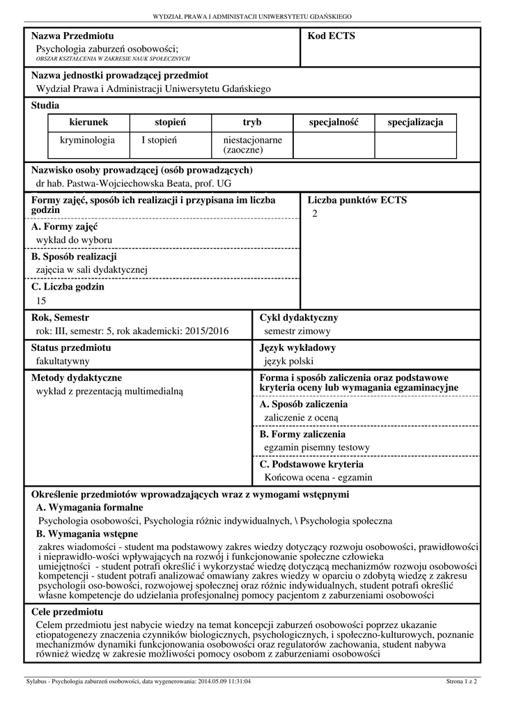 WYDZIAŁ PRAWA I ADMINISTACJI UNIWERSYTETU GDAŃSKIEGO Nazwa Przedmiotu Psychologia Psychologia zaburzeń zaburzeń osobowości; osobowości; Kod ECTS OBSZAR KSZTAŁCENIA W ZAKRESIE NAUK SPOŁECZNYCH Nazwa jednostki prowadzącej przedmiot Wydział Prawa i Administracji Uniwersytetu Gdańskiego Studia kierunek kryminologia kryminologia stopień II stopień stopień tryb niestacjonarne (zaoczne) niestacjonarne (zaoczne) Nazwisko osoby prowadzącej (osób prowadzących) dr hab. Pastwa-Wojciechowska Beata, prof. UG Formy godzin Formy zajęć, zajęć, sposób sposób ich ich realizacji realizacji ii przypisana przypisana im im liczba liczba godzin A. Formy zajęć wykład wykład do do wyboru wyboru specjalność specjalizacja Liczba punktów ECTS 2 B. Sposób realizacji zajęcia zajęcia w w sali sali dydaktycznej dydaktycznej C. Liczba godzin 15 15 Rok, Semestr rok: III, semestr: 5, rok akademicki: 2015/2016 Cykl dydaktyczny semestr zimowy Status przedmiotu fakultatywny Język wykładowy język polski Metody dydaktyczne wykład z prezentacją multimedialną Forma i sposób zaliczenia oraz podstawowe kryteria oceny lub wymagania egzaminacyjne A. Sposób zaliczenia zaliczenie z oceną B. Formy zaliczenia egzamin pisemny testowy C. Podstawowe kryteria Końcowa ocena - egzamin Określenie przedmiotów wprowadzających wraz z wymogami wstępnymi A. Wymagania formalne Psychologia osobowości, Psychologia różnic indywidualnych, \ Psychologia społeczna B. Wymagania wstępne zakres wiadomości - student ma podstawowy zakres wiedzy dotyczący rozwoju osobowości, prawidłowości i nieprawidło-wości wpływających na rozwój i funkcjonowanie społeczne człowieka umiejętności - student potrafi określić i wykorzystać wiedzę dotyczącą mechanizmów rozwoju osobowości kompetencji - student potrafi analizować omawiany zakres wiedzy w oparciu o zdobytą wiedzę z zakresu psychologii oso-bowości, rozwojowej społecznej oraz różnic indywidualnych, student potrafi określić własne kompetencje do udzielania profesjonalnej pomocy pacjentom z zaburzeniami osobowości Cele przedmiotu Celem przedmiotu jest nabycie wiedzy na temat koncepcji zaburzeń osobowości poprzez ukazanie etiopatogenezy znaczenia czynników biologicznych, psychologicznych, i społeczno-kulturowych, poznanie mechanizmów dynamiki funkcjonowania osobowości oraz regulatorów zachowania, student nabywa również wiedzę w zakresie możliwości pomocy osobom z zaburzeniami osobowości Sylabus - Psychologia zaburzeń osobowości, data wygenerowania: 2014.05.09 11:31:04 Strona 1 z 2 WYDZIAŁ PRAWA I ADMINISTACJI UNIWERSYTETU GDAŃSKIEGO Treści programowe A. Problematyka wykładu - Modele i koncepcje zaburzeń osobowości - Diagnoza osobowości - Psychoterapia zaburzeń osobowości -Zaburzenia osobowości - omówienie poszczególnych zaburzeń a) wiązka A - schizoidalne, schizotypowe, paranoidalna b) wiązka B - narcystyczne, antyspołeczne, histrioniczne, borderline c) wiązka C - zależne, unikające, obsesyjno-kompulsywne - Osobowość masochistyczna -Osobowość sadystyczna -Zaburzenia współwystępujące, podwójna diagnoza Wykaz literatury A. Literatura wymagana do ostatecznego zaliczenia zajęć (zdania egzaminu): A.1. wykorzystywana podczas zajęć Cierpiałkowska, L. (2004). Psychologia zaburzeń osobowości. Poznań, Wydawnictwo UAM Jakubik, A. (2003). Zaburzenia osobowości. Warszawa, PZWL Millon, T., Davis, R. (2005). Zaburzenia osobowości. Warszawa, Instytut Psychologii Zdrowia A.2. studiowana samodzielnie przez studenta brak B. Literatura uzupełniająca Garson, R.C., Butcher, J.N., Mineczka, S. (2003). Psychologia zaburzeń. T.1> Gdańsk, Gdańskie Wydawnictwo Psychologiczne McGrath, H., Edwards, H. (2010). Trudne osobowości. Jak radzić sobie ze szkodliwymi zachowaniami innych oraz własnymi. Poznań, Dom Wydawniczy Rebis Trzebińska, E. (2009). Szaleństwo bez utraty rozumu. Z badań nad mechanizmami osobowości. Warszawa, Wydawnictwo Academica Efekty uczenia się Wiedza Student: Posiada wiedzę dotyczącą funkcjonowania człowieka i czynników wpływających na jego prawi-dłowe/nieprawidłowe zachowanie, posiada pogłębioną i rozszerzoną wiedzę dotyczącą za-gadnień diagnozy, terapii i pomocy osobom z zaburzeniami osobowości Umiejętności Student: Posiada pogłębione umiejętności obserwowania zachowań człowieka i umie opisywać mechani-zmy psychologiczne leżące u podstaw tych zachowań. Potrafi wykorzystywać i integrować wie-dzę teoretyczną do analizowania funkcjonowania konkretnych jednostek Kompetencje społeczne (postawy) Student: potrafi zastosować zdobytą wiedzę do pracy z pacjentem z zaburzeniami osobowości. Wykazuje wrażliwość na problemy psychologiczne i społeczne oraz zna ich rolę i znaczenie dla funkcjono-wania człowieka. Rozumie potrzebę rozwoju własnego w celu prawidłowego rozwiązywania pro-blemów diagnostycznych. Kontakt [email protected] Sylabus - Psychologia zaburzeń osobowości, data wygenerowania: 2014.05.09 11:31:04 Strona 2 z 2