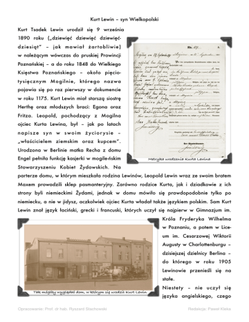 Kurt Lewin – syn Wielkopolski Kurt Tsadek Lewin urodził się 9 września 1890 roku („dziewięć dziewięć dziewięćdziesiąt” – jak ma wiał żar t obliwie) w należącym wówczas do pruskiej Prowincji Poznańskiej – a do roku 1848 do Wielkiego Księstwa Poznańskiego – około pięciotysięcznym Mogilnie, którego nazwa pojawia się po raz pierwszy w dokumencie w roku 1175. Kurt Lewin miał starszą siostrę Herthę oraz młodszych braci: Egona oraz Fritza. Leopold, pochodzący z Mogilna ojciec Kurta Lewina, był – jak po latach n a p i s z e s y n w s wo i m ż yc i o r y s i e – „właścicielem ziemskim oraz kupcem”. Urodzona w Berlinie matka Recha z domu Engel pełniła funkcję kasjerki w mogile-ńskim Metryka urodzenia Kurta Lewina Stowarzyszeniu Kobiet Żydowskich. Na parterze domu, w którym mieszkała rodzina Lewinów, Leopold Lewin wraz ze swoim bratem Maxem prowadzili sklep pasmanteryjny. Zarówno rodzice Kurta, jak i dziadkowie z ich strony byli niemieckimi Żydami, jednak w domu mówiło się prawdopodobnie tylko po niemiecku, a nie w jidysz, aczkolwiek ojciec Kurta władał także językiem polskim. Sam Kurt Lewin znał język łaciński, grecki i francuski, których uczył się najpierw w Gimnazjum im. Króla Fryderyka Wilhelma w Poznaniu, a potem w Liceum im. Cesarzowej Wiktorii Augusty w Charlottenburgu – dzisiejszej dzielnicy Berlina – do którego w roku 1905 Lewinowie przenieśli się na stałe. Tak mógłby wyglądać dom, w którym się urodził Kurt Lewin Opracowanie: Prof. dr hab. Ryszard Stachowski Niestety – nie uczył się języka angielskiego, czego Redakcja: Paweł Kleka później bardzo żałował. W roku 1903 Kurt Lewin uczestniczy w pochodzącej z XIV wieku tradycyjnej ceremonii żydowskiej Bar Fot. M. Rosiński micwa, w której trzynastole tni c hłopiec żydowski uzyskiwał pełnię praw obywatelskich wraz z prawem pełnego udziału A tak wygląda obecnie w uroczystościach religijnych w synagodze. Na później- szy nieortodoksyjny stosunek Kurta Lewina do religii mogło wpłynąć to, że wychowywał się w mało zhierarchizowanej społeczności miejscowych Żydów, jak i to, że w domu rodzinnym Lewinów obchodzono wprawdzie święta sederu i chanuki, ale nie przestrzegano wszystkich zasad koszerności potraw. W dniu 11 września 2004 roku, w drugim dniu odbywającej się w Bydgoszczy i Mogilnie Międzynarodowej Konf erencji N aukowej Kur t Lewin: Contribution to Contemporary Psychology, Thomas Lewin –bratanek Kurta Lewina w towarzystwie Profesora Jana Strelaua – wiceprzewodniczącego Polskiej Akademii Nauk, uroczyście odsłonił wmurowaną w rodziny Lewinów, tablicę pamiątkową. Prof. Strelau mówił: „Stoimy przed domem, w którym urodził się wielki uczony, badacz, myśliciel i obserwator” i wyraził przekonanie, że gdyby w tamtych czasach przyznawano nagrody Nobla w dziedzinie nauk Tablica pamiątkowa na ścianie domu, w którym urodził się Kurt Lewin Fot. M. Rosiński ścianie domu na ul. Rynek Mogilno, należącego do społecznych, to Mogilno miałoby noblistę. Opracowanie: Prof. dr hab. Ryszard Stachowski Redakcja: Paweł Kleka