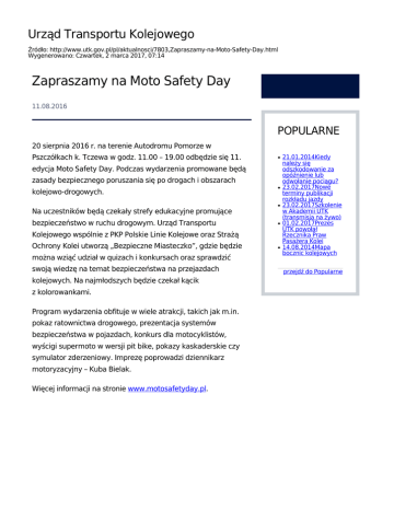 Urząd Transportu Kolejowego Źródło: http://www.utk.gov.pl/pl/aktualnosci/7803,Zapraszamy-na-Moto-Safety-Day.html Wygenerowano: Czwartek, 2 marca 2017, 07:14 Zapraszamy na Moto Safety Day 11.08.2016 POPULARNE 20 sierpnia 2016 r. na terenie Autodromu Pomorze w Pszczółkach k. Tczewa w godz. 11.00 – 19.00 odbędzie się 11. ● edycja Moto Safety Day. Podczas wydarzenia promowane będą zasady bezpiecznego poruszania się po drogach i obszarach kolejowo-drogowych. ● ● Na uczestników będą czekały strefy edukacyjne promujące bezpieczeństwo w ruchu drogowym. Urząd Transportu ● Kolejowego wspólnie z PKP Polskie Linie Kolejowe oraz Strażą Ochrony Kolei utworzą „Bezpieczne Miasteczko”, gdzie będzie można wziąć udział w quizach i konkursach oraz sprawdzić swoją wiedzę na temat bezpieczeństwa na przejazdach kolejowych. Na najmłodszych będzie czekał kącik z kolorowankami. Program wydarzenia obfituje w wiele atrakcji, takich jak m.in. pokaz ratownictwa drogowego, prezentacja systemów bezpieczeństwa w pojazdach, konkurs dla motocyklistów, wyścigi supermoto w wersji pit bike, pokazy kaskaderskie czy symulator zderzeniowy. Imprezę poprowadzi dziennikarz motoryzacyjny – Kuba Bielak. Więcej informacji na stronie www.motosafetyday.pl. ● 21.01.2014Kiedy należy się odszkodowanie za opóźnienie lub odwołanie pociągu? 23.02.2017Nowe terminy publikacji rozkładu jazdy 23.02.2017Szkolenie w Akademii UTK (transmisja na żywo) 01.02.2017Prezes UTK powołał Rzecznika Praw Pasażera Kolei 14.08.2014Mapa bocznic kolejowych przejdź do Popularne