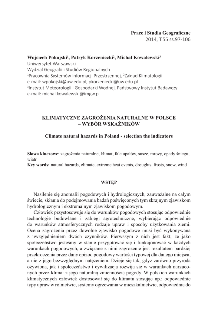 Prace i Studia Geograficzne 2014, T.55 ss.97-106 Wojciech Pokojski1, Patryk Korzeniecki2, Michał Kowalewski3 Uniwersytet Warszawski Wydział Geografii i Studiów Regionalnych 1 Pracownia Systemów Informacji Przestrzennej, 2Zakład Klimatologii e-mail: [email protected], [email protected] 3 Instytut Meteorologii i Gospodarki Wodnej, Państwowy Instytut Badawczy e-mail: [email protected] KLIMATYCZNE ZAGROŻENIA NATURALNE W POLSCE – WYBÓR WSKAŹNIKÓW Climate natural hazards in Poland - selection the indicators Słowa kluczowe: zagrożenia naturalne, klimat, fale upałów, susze, mrozy, opady śniegu, wiatr Key words: natural hazards, climate, extreme heat events, droughts, frosts, snow, wind WSTĘP Nasilenie się anomalii pogodowych i hydrologicznych, zauważalne na całym świecie, skłania do podejmowania badań poświęconych tym skrajnym zjawiskom hydrologicznym i ekstremalnym zjawiskom pogodowym. Człowiek przystosowuje się do warunków pogodowych stosując odpowiednie technologie budowlane i zabiegi agrotechniczne, wybierając odpowiednie do warunków atmosferycznych rodzaje upraw i sposoby użytkowania ziemi. Ocena zagrożenia przez dowolne zjawisko pogodowe musi być wykonywana z uwzględnieniem dwóch czynników. Pierwszym z nich jest fakt, że jako społeczeństwo jesteśmy w stanie przygotować się i funkcjonować w każdych warunkach pogodowych, a związane z nimi zagrożenie jest rezultatem bardziej przekroczenia przez dany epizod pogodowy wartości typowej dla danego miejsca, a nie z jego bezwzględnym natężeniem. Dzieje się tak, gdyż zarówno przyroda ożywiona, jak i społeczeństwo i cywilizacja rozwija się w warunkach narzuconych przez klimat z jego naturalną zmiennością pogody. W polskich warunkach klimatycznych człowiek dostosował się do klimatu stosując np.: odpowiednie typy upraw w rolnictwie, systemy ogrzewania w mieszkalnictwie, odpowiednią do 98 Wojciech Pokojski i in. warunków klimatycznych odzież i sposób odżywiania się. Jest jednak narażony na nasilenie się anomalii pogodowych. Pojawienie się ich jest zauważalne na całym świecie, skłania do podejmowania badań poświęconych tym skrajnym zjawiskom fizycznogeograficznym. W projekcie Rządowego Centrum Bezpieczeństwa zatytułowanym „Zagrożenia okresowe występujące w Polsce” (2012), w celu oceny stopnia zagrożenia niekorzystnymi warunkami klimatycznymi wybrano następujące zjawiska: mróz, silny wiatr, opady śniegu i susze atmosferyczne. W ostatnich kilkudziesięciu latach wykonano liczne badania poświęcone ekstremalnym zdarzeniom klimatycznym, w czym dopomógł rozwój metod numerycznego modelowania procesów atmosferycznych zarówno w skali synoptycznej, jak i klimatycznej (Frich i in. 2002). W niniejszym artykule zaprezentowano wybrane zagrożenia i ich miary najlepiej charakteryzujące zagrożenie naturalne ze strony czynników klimatycznych. W opracowaniu uwzględniono zarówno elementy klimatu, których stany ekstremalne są mierzone bezpośrednio w stacjach pomiarowych, występujące epizodycznie i rejestrowane tylko opisowo, jak i wskaźniki obliczane na podstawie danych pomiarowych za pomocą wzorów empirycznych. ZAGROŻENIE FALAMI UPAŁÓW Fale upałów są przykładem ekstremalnych warunków pogodowych, coraz częściej występujących w Polsce, w których następstwie notowana jest największa liczba przypadków śmiertelnych (Kuchcik 2006). Faktem jest, że wraz ze zmianami klimatycznymi zachodzącymi na Ziemi częstość występowania i intensywność fal upałów wzrasta. Przykładowo w trakcie trzech tygodni fal upałów, które objęły swoim zasięgiem terytorium Europy w 2003 roku, z powodu warunków pogodowych zmarło ok. 35 tysięcy osób (Bustinza i in. 2013). Fale upałów występują na całym świecie, jednak dotąd nie wypracowano jednej wspólnej definicji. W związku z tym w każdym kraju definiowane są one odmiennie, uniemożliwia się tym samym porównywalność wyników badań w tym zakresie (Kozłowska-Szczęsna i in. 2004). Przykładowo w Polsce jako wskaźnik fal upałów stosuje się okresy z podwyższoną wartością temperatury pozornej (Kuchcik 2006), podczas gdy w Kanadzie w tym celu wykorzystuje się m.in. średnie ruchome i wyznaczone a priori progi wartości temperatury minimalnej i maksymalnej (Bustinza i in. 2013). W celu wyznaczenia fali upałów stosuje się często definicję opartą na częstości występowania dni, w których temperatura pozorna (AT) osiąga wartość powyżej 5% najwyższych wartości średnich dobowych. Takie podejście jest stosowane przez wielu badaczy na całym świecie (zob. Kuchcik 2006) i jest uzasadniane tym, że w przeciwieństwie do innych metod, np. metody definiowania fali upałów jako kilkudniowego okresu z maksymalną temperaturą powietrza powyżej Klimatyczne zagrożenia naturalne... 99 określonej wartości, pozwala określić fale upałów w trakcie wiosny oraz na obszarach nadmorskich, gdzie temperatura powietrza nie osiąga tak wysokich wartości jak na pozostałym obszarze kraju. W dalszej części prowadzonych badań przyjęto definicję zbliżoną do definicji M. Kuchcik (2006). Fale upałów pojawiają się, gdy występuje przynajmniej 6-dniowy okres z temperaturą pozorną powyżej 95 percentyla wartości średnich dobowych, rozpoczynający się wzrostem temperatury pozornej o minimum 1,5 °C w porównaniu do dnia poprzedzającego falę upałów i okres ten może zawierać jednodniowe przerwy z temperaturą pozorną o wartości powyżej 90 percentyla średnich dobowych. Badanie dotyczące fal upałów w Polsce w latach 2002–2012 wykazało, że fale upałów występują tylko w ciepłym półroczu w trzech miesiącach: w czerwcu, lipcu i sierpniu. Fale rozpoczynające się w czerwcu stanowią tylko 14,7% wszystkich fal upałów. Najmniej fal upałów zanotowano w Poznaniu (6), natomiast najwięcej w Gdańsku, Łodzi, Rzeszowie i Warszawie (po 10). Średnia długość badanych 