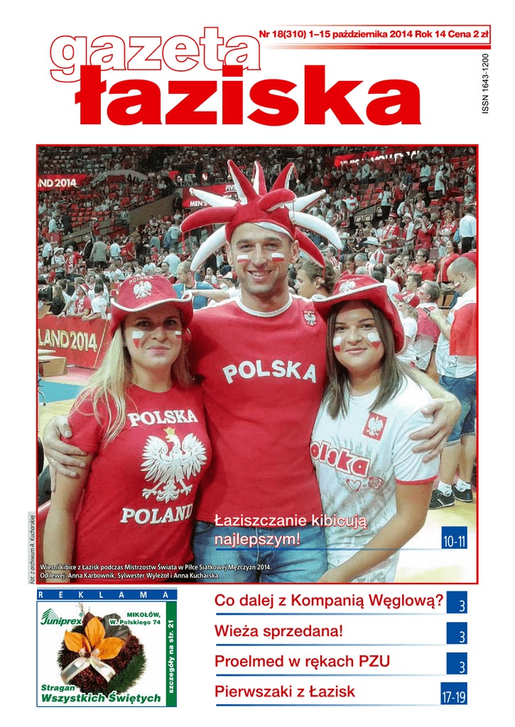 Fot. z archiwum A. Kucharskiej Nr 18(310) 1–15 października 2014 Rok 14 Cena 2 zł Łaziszczanie kibicują najlepszym! 10-11 Wierni kibice z Łazisk podczas Mistrzostw Świata w Piłce Siatkowej Mężczyzn 2014. Od lewej: Anna Karbownik, Sylwester Wyleżoł i Anna Kucharska R E K L A M A Co dalej z Kompanią Węglową? 3 Wieża sprzedana! 3 Proelmed w rękach PZU 3 Pierwszaki z Łazisk 17-19 gazeta łaziska INFORMATOR NUMERY ALARMOWE Państwowa Straż Pożarna (998) 326 23 10 Ochotnicza Straż Pożarna Ł. Górne 224 21 20 Ochotnicza Straż Pożarna Ł. Średnie 224 21 22 Ochotnicza Straż Pożarna Ł. Dolne 224 21 21 Policja (997) 226 85 10 Straż Miejska (986) 224 44 71 POGOTOWIA Ratunkowe (999) 226 21 00 226 26 65 Centrum Medyczne 325 76 00 Gazowe (992) 227 31 24 Energetyczne (991) 303 21 55 Ciepłownicze 226 21 36 Wodno-kanalizacyjne 224 18 37 224 14 52 PGKiM 224 10 88 224 15 50 Punkt konsultacyjny Gminnej Komisji Rozwiązywani Problemów Alkoholowych 224 23 90 PRZYCHODNIE Proelmed (ul. Wyzwolenia 30) 324 31 23 Przychodnia (ul. Staszica 4a) 737 02 30 Przychodnia (ul. Chopina 17) 736 76 70 736 76 55 APTEKI „Arnika”, os. Centrum 7 224 38 39 „Novum”, ul. Dworcowa 10 224 10 18 „Moja Apteka”, ul. Staszica 2/2 736 80 90 „Dbam o Zdrowie”, ul. Wiejska 1 322 70 95 „Dbam o Zdrowie”, ul. Chopina 17 736 76 37 INNE Urząd Miasta 324 80 00 Starostwo Powiatowe 324 81 00 MDK Ł. Górne 224 10 33 MDK Ł. Średnie 224 48 18 MDK Ł. Dolne 322 94 46 PiMBP (biblioteka) 224 14 12 Parafia Ł. Górne 224 10 13 Parafia Ł. Średnie 224 10 03 Parafia Ł. Dolne 224 18 42 MOSiR 221 11 38 Ośrodek Rekreacyjno–Sportowy „Żabka” 322 93 82 Środowiskowy Dom 737 00 46 Samopomocy 698 639 036 OPS 326 23 40 326 23 42 Szkoły Szkoła Podstawowa nr 1 224 10 44 Szkoła Podstawowa nr 5 224 12 07 Szkoła Podstawowa nr 6 224 32 46 Gimnazjum nr 1 224 10 66 Gimnazjum nr 3 737 01 17 Zespół Szkół im. Piastów Śląskich 224 10 12 Zespół Szkół Energetycznych i Usługowych 224 24 15 2 1 - 15 października 2014 informator Spotkania z burmistrzem • 6 października – restauracja „Pod Białym Orłem”, godz. 18.00 – spotkanie z mieszkańcami Łazisk Średnich. • 13 października – Miejski Dom Kultury w Łaziskach Górnych, godz. 18.00 – spotkanie z mieszkańcami osiedli Leśne i Zacisze. • 20 października – Przedszkole nr 2, ul. Miodowa – godz. 18.00 – spotkanie z mieszkańcami Brady. • 27 października – filia nr 1 PiMBP, ul. Wyszyńskiego 8 – godz. 18.00 – spotkanie z mieszkańcami Łazisk Średnich. Tematyka spotkań: – informacja na temat zadań i inwestycji realizowanych w mieście – zadania zrealizowane, plany inwestycyjne; – dyskusja dotycząca kwestii miasta. MDK zaprasza… …17 października o godz. 18.00 na występ kabaretu Łowcy.B. Bilety w cenie 45 zł (parter) oraz 40 zł (balkon) do nabycia w sekretariacie MDK . …19 października o godz. 17.00 na przedstawienie Hebama w wykonaniu ornontowickiego teatru Naumiony. Spektakl opowiada historię rodziny, w której właśnie na świat ma przyjść kolejny potomek. Utrzymana w konwencji komedii opowieść osadzona jest w realiach śląskich lat 60., grana w gwarze śląskiej. Cała rodzina czeka na pojawienie się okolicznej hebamy – położnej, która przychodzi z pomocą. Pierwowzorem dla tytułowej bohaterki jest legendarna postać hebamy, która przez wiele lat przyjmowała porody na terenie Ornontowic i okolicy – Agnieszki Cienciałowej. Pełna humoru opowieść z życia rodziny, a jednocześnie próba ukazania tradycji , które odbywały się przy okazji narodzin w śląskich domach. Bilety w cenie 10 zł można nabyć w sekretariacie MDK. …na andrzejki dla seniorów – w sobotę 29 listopada, o godz.17.00. O dobre nastroje, wyśmienite humory i doskonałą zabawę zadba zespół Baba z Chopym. Bilety w cenie 40 zł można nabyć w sekretariacie MDK. Ilość miejsc ograniczona! Serdecznie zapraszamy! …na wyjazd do fabryki bombek i na kiermasz adwentowy w Krakowie. Przyjmujemy zapisy już tylko na jeden termin – 3 grudnia (wyjazd z zatoczki przed MDK o godz. 9.45). Planowany powrót w godzinach wieczornych. Zapisy i wpłaty w wysokości 45 zł przyjmowane są sekretariacie MDK w Łaziskach Górnych. …na Jarmark Adwentowy w Pradze. Wyjazd odbędzie się w dwóch terminach – 6–7 grudnia i 13–14 grudnia. Koszt dwudniowego wyjazdu wynosi 290 zł (z noclegiem i wyżywieniem). Szczegóły w sekretariacie MDK lub pod nr. telefonu 32 2241 033. Zapraszamy na wyjazdy do teatrów! Miejski Dom Kultury zaprasza na dwa wyjazdy do teatrów w przyszłym roku: – 10 stycznia wybierzemy się do Teatru Rozrywki w Chorzowie na spektakl Sylwester na Bis. Koszt wyjazdu – 95 zł – 21 marca pojedziemy na musical Mamma Mia! do warszawskiego teatru ROMA. Nowa propozycja teatru, która swoją premierę będzie miała dopiero w lutym przyszłego roku, to światowy fenomen teatralny i wielki sukces musicalowej sceny. Mamma Mia! zawiera wszystkie najbardziej znane i lubiane, nieśmiertelne przeboje zespołu ABBA, zgrabnie wplecione we wzruszającą i zabawną fabułę: dwudziestoletnia Sophie, próbująca się dowiedzieć, kto jest jej ojcem, ożywia przeszłość Donny, swojej samotnej, młodej mamy – wszystko w pięknej scenerii urokliwej greckiej wysepki! Po prostu miłość, morze i słońce! Koszt wyjazdu – 220 zł. Wpłata 120 zł do 30 października. Szczegóły, zapisy i wpłaty – sekretariat MDK, tel. 32 2241 033. z życia miasta gazeta łaziska Kompania Węglowa rozpoczęła wdrażanie planu naprawczego spółki na lata 2014–2020. Związki zawodowe odmówiły powrotu do stołu negocjacyjnego, kiedy okazało się, że zarząd KW podpisał list intencyjny z przedstawicielami Węglokoksu dotyczący planowanej sprzedaży czterech kopalń… Co dalej z Kompanią Węglową? P rzypomnijmy, że w połowie sierpnia zarząd KW przedstawił założenia planu naprawczego, który zakładał m.in.
