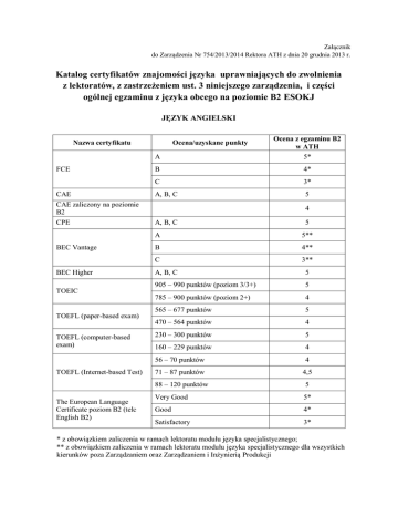 Załącznik do Zarządzenia Nr 754/2013/2014 Rektora ATH z dnia 20 grudnia 2013 r. Katalog certyfikatów znajomości języka uprawniających do zwolnienia z lektoratów, z zastrzeżeniem ust. 3 niniejszego zarządzenia, i części ogólnej egzaminu z języka obcego na poziomie B2 ESOKJ JĘZYK ANGIELSKI A Ocena z egzaminu B2 w ATH 5* B 4* C 3* CAE CAE zaliczony na poziomie B2 A, B, C 5 CPE A, B, C Nazwa certyfikatu FCE BEC Vantage BEC Higher TOEIC TOEFL (paper-based exam) TOEFL (computer-based exam) TOEFL (Internet-based Test) The European Language Certificate poziom B2 (telc English B2) Ocena/uzyskane punkty 4 5 A 5** B 4** C 3** A, B, C 5 905 – 990 punktów (poziom 3/3+) 5 785 – 900 punktów (poziom 2+) 4 565 – 677 punktów 5 470 – 564 punktów 4 230 – 300 punktów 5 160 – 229 punktów 4 56 – 70 punktów 4 71 – 87 punktów 4,5 88 – 120 punktów 5 Very Good 5* Good 4* Satisfactory 3* * z obowiązkiem zaliczenia w ramach lektoratu modułu języka specjalistycznego; ** z obowiązkiem zaliczenia w ramach lektoratu modułu języka specjalistycznego dla wszystkich kierunków poza Zarządzaniem oraz Zarządzaniem i Inżynierią Produkcji