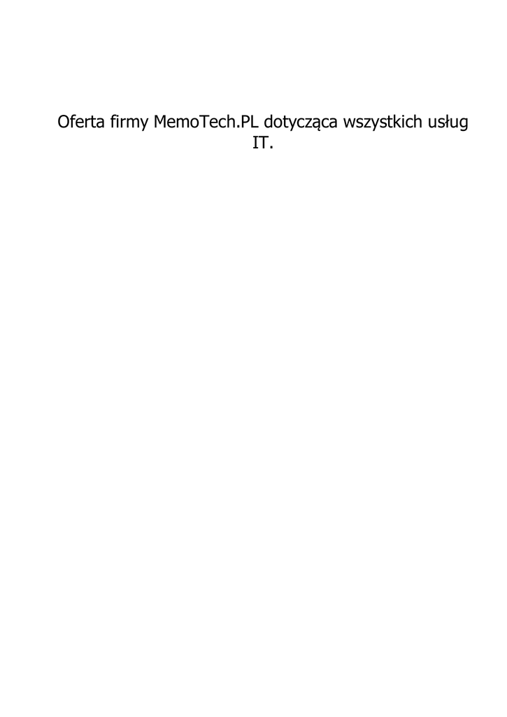 Oferta firmy MemoTech.PL dotycząca wszystkich usług IT. Streszczenie: Przygotowano dla: Kontakt: MemoTech.PL Niniejszy dokument zawiera indywidualnie przygotowaną ofertę na usług IT świadczone w firmie MemoTech.PL. MemoTech.PL Ul. Zielonogórska 7/6, 40-710 Katowice Właścicielem marki memotech.pl jest Firma DoradczoUsługowa POŻ- PROJEKT s.c. ,S .Szkuta , A. Szkuta. NIP 634-260-42-99. Ul. Zielonogórska 7/6, 40-710 Katowice. E-mail: [email protected], www.memotech.pl, www.poz-projekt.pl Strona 2 z 5 1 Usługi pomocy komputerowej związane z oprogramowaniem komputerowym i programami. Nazwa usługi Instalacja systemów operacyjnych: Windows Vista, XP, Windows 7, Windows 8, Windows Server, Sql Server itp: Usuwanie szkodliwego oprogramowania, programów szpiegujących, wirusów, trojanów, robaków: Instalacja oraz deinstalacja oprogramowania biurowego, zabezpieczającego, ochronnego, programów antywirusowych itp.: Czyszczenie komputera z śmieci, zbędnych plików Aktualizacja sterowników, BIOS, wersji oprogramowania Konfiguracja programów pocztowych, Skype, Gadu-Gadu, itp. Archiwizacja danych, przenoszenie, kopiowanie Pomoc komputerowa, nauka korzystania z komputera, internetu, sprzętu, programów, oprogramowania, szkolenia, doradztwo komputerowe Czyszczenie, konserwacja komputerów Audyty bezpieczeństwa/ legalnego oprogramowania do uzgodnienia Cena netto Od 50 zł Od 30 zł Od 25 zł Od Od Od Od Od 25 50 25 25 20 zł zł zł zł zł Od 25 zł Od 50 zł 2 Usługi serwisu komputerowego związane ze sprzętem i urządzeniami komputerowymi Nazwa usługi Naprawa, modernizacja, serwis, usuwanie usterek technicznych, rozbudowa, tunning komputerów stacjonarnych i laptopów Diagnostyka, oceny sprzętu Pomoc przy rozbudowie komputera, zmianie podzespołów Pomoc przy instalacji i konfiguracji urządzeń zewnętrznych Składanie kompletnych zestawów komputerowych Czyszczenie z danych dysków twardych, pamięci przenośnych itp. Wymiana i naprawa podzespołów komputerowych: CD, DVD, karty pamięci, rozszerzeń, dyski twarde, klawiatur, matryc MemoTech.PL Cena netto Od 30 zł Od Od Od Od Od Od 25 20 20 50 25 20 zł zł zł zł zł zł Strona 3 z 5 3 Usługi serwisu związane z telefonami, smart fonami oraz nauką korzystania ze sprzętu Nazwa usługi Usuwanie usterek i problemów Nauka korzystania z sprzętu i oprogramowania Instalacja i konfiguracja oprogramowania, WINDOWS MOBILE, Android Wygrywanie aktualizacji i poprawek Optymalizacja pracy sprzętu, oprogramowania Cena netto Od 30 zł Od 20 zł Od 50 zł Od 25 zł Od 30 zł 4 Tworzenie stron internetowych Nazwa usługi Strony internetowe indywidualne, firmowe, korporacyjne Obsługa oraz administracja portali, stron internetowych Aktualizacja stron, portali Cena netto Od 150 zł Od 80 zł miesięcznie Od 100 zł 5 Usługi związane z sieciami komputerowymi oraz internetowymi Nazwa usług Dzielenie Internetu pomiędzy wieloma komputerami Pomoc przy instalacji i konfiguracji połączenia z Internetem Konfigurowanie bezprzewodowego Internetu Instalacja i konfiguracja sprzętu sieciowego: routerów, hubów, switchy, printserwerów, kamer IP, itp. Tworzenie i budowanie sieci:LAN, WAN, VPN, Wi-Fi Diagnostyka sieci oraz usuwanie awarii Administracja i zarządzanie siecią komputerową Zarządzanie serwerami pod kontrolą systemu Windows i Linux MemoTech.PL Cena netto Od 30 zł Od 30 zł Od 30 zł Od 30 zł W zależności od rodzaju, wielkości ilości komputerów. Od 50 zł Od 30 zł Od 100 zł miesięcznie Od 100 zł miesięcznie za jedno stanowisko serwerowe Strona 4 z 5 6 Wdrożenia Nazwa usług Wdrożenia środowisk Windows i Linux Wdrożenia systemów ERP, CRM (wersje płatne i open source) Wirtualizacja Cena netto 50-100 zł od stanowiska 100-150 zł os stanowiska 50-100 zł od stanowiska Do wszystkich cen należy doliczyć podatek Vat w wysokości 23%. Jeżeli jakiś usług nie ma w wyżej wymienionych stworzymy je na Państwa życzenie. Jako że ciężko jest wycenić dokładnie każda usługę podstawowe są przedstawione w osobnej ofercie, natomiast wszystkie nasze usługi podlegają negocjacjom cenowym. Dojazd do klienta ustalamy indywidualnie. MemoTech.PL Strona 5 z 5