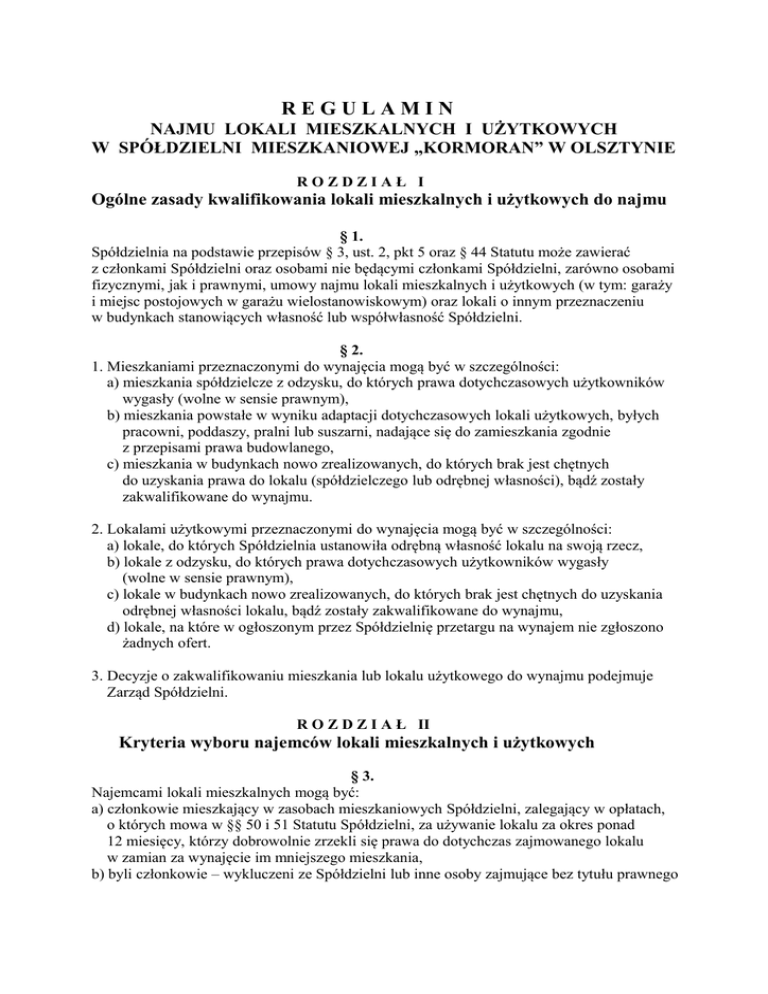 REGULAMIN NAJMU LOKALI MIESZKALNYCH I UŻYTKOWYCH W SPÓŁDZIELNI MIESZKANIOWEJ „KORMORAN” W OLSZTYNIE ROZDZIAŁ I Ogólne zasady kwalifikowania lokali mieszkalnych i użytkowych do najmu § 1. Spółdzielnia na podstawie przepisów § 3, ust. 2, pkt 5 oraz § 44 Statutu może zawierać z członkami Spółdzielni oraz osobami nie będącymi członkami Spółdzielni, zarówno osobami fizycznymi, jak i prawnymi, umowy najmu lokali mieszkalnych i użytkowych (w tym: garaży i miejsc postojowych w garażu wielostanowiskowym) oraz lokali o innym przeznaczeniu w budynkach stanowiących własność lub współwłasność Spółdzielni. § 2. 1. Mieszkaniami przeznaczonymi do wynajęcia mogą być w szczególności: a) mieszkania spółdzielcze z odzysku, do których prawa dotychczasowych użytkowników wygasły (wolne w sensie prawnym), b) mieszkania powstałe w wyniku adaptacji dotychczasowych lokali użytkowych, byłych pracowni, poddaszy, pralni lub suszarni, nadające się do zamieszkania zgodnie z przepisami prawa budowlanego, c) mieszkania w budynkach nowo zrealizowanych, do których brak jest chętnych do uzyskania prawa do lokalu (spółdzielczego lub odrębnej własności), bądź zostały zakwalifikowane do wynajmu. 2. Lokalami użytkowymi przeznaczonymi do wynajęcia mogą być w szczególności: a) lokale, do których Spółdzielnia ustanowiła odrębną własność lokalu na swoją rzecz, b) lokale z odzysku, do których prawa dotychczasowych użytkowników wygasły (wolne w sensie prawnym), c) lokale w budynkach nowo zrealizowanych, do których brak jest chętnych do uzyskania odrębnej własności lokalu, bądź zostały zakwalifikowane do wynajmu, d) lokale, na które w ogłoszonym przez Spółdzielnię przetargu na wynajem nie zgłoszono żadnych ofert. 3. Decyzje o zakwalifikowaniu mieszkania lub lokalu użytkowego do wynajmu podejmuje Zarząd Spółdzielni. R O Z D Z I A Ł II Kryteria wyboru najemców lokali mieszkalnych i użytkowych § 3. Najemcami lokali mieszkalnych mogą być: a) członkowie mieszkający w zasobach mieszkaniowych Spółdzielni, zalegający w opłatach, o których mowa w §§ 50 i 51 Statutu Spółdzielni, za używanie lokalu za okres ponad 12 miesięcy, którzy dobrowolnie zrzekli się prawa do dotychczas zajmowanego lokalu w zamian za wynajęcie im mniejszego mieszkania, b) byli członkowie – wykluczeni ze Spółdzielni lub inne osoby zajmujące bez tytułu prawnego 2 lokale mieszkalne wchodzące w skład zasobów Spółdzielni, których przekwaterowanie dokonane zostało do wskazanego przez Spółdzielnię lokalu mieszkalnego przeznaczonego do wynajęcia, c) członkowie mieszkający w zasobach mieszkaniowych Spółdzielni, którzy utracili możliwość zamieszkiwania w dotychczasowym mieszkaniu na skutek klęski żywiołowej, d) osoby fizyczne lub prawne nie będące członkami Spółdzielni. § 4. 1. W wynajmowanym mieszkaniu powierzchnia pokoi, przypadająca na członka gospodarstwa domowego najemcy, nie może wynosić mniej niż 5 m2. 2. Na podstawie pisemnej zgody najemcy dopuszcza się zawarcie umowy najmu mieszkania, w którym powierzchnia mieszkalna na 1 osobę jest mniejsza niż 5 m2. § 5. Najemcami lokali użytkowych mogą być: a) członkowie Spółdzielni oraz osoby nie będące członkami Spółdzielni (osoby fizyczne, jak i osoby prawne), które wygrały przetarg na wynajem lokalu, przeprowadzony przez Spółdzielnię w trybie określonym w Regulaminie w sprawie zasad i trybu przeprowadzania przetargów w Spółdzielni, b) członkowie Spółdzielni oraz osoby nie będące członkami Spółdzielni (osoby fizyczne i prawne), z którymi wynegocjowane zostały najkorzystniejsze dla Spółdzielni warunki najmu lokalu, c) członkowie Spółdzielni oraz osoby nie będące członkami Spółdzielni (osoby fizyczne i prawne), które zostały wskazane przez dotychczasowego najemcę - rezygnującego z najmu lokalu – jako następcy zobowiązujący się przejąć lokal bez konieczności jego opróżniania i odnawiania, przy jednoczesnym zachowaniu stawki czynszu najmu nie niższej od płaconej przez dotychczasowego najemcę. R O Z D Z I A Ł III Ogólne zasady najmu lokali mieszkalnych i użytkowych § 6. 1. Najem lokali mieszkalnych przez osoby wymienione w § 3, pkt a), b) i d) niniejszego regulaminu odbywa się na podstawie umowy najmu na czas nieoznaczony, natomiast z osobami wymienionymi w § 3, pkt c) zawiera się umowę najmu na czas oznaczony. 2. Małżonkowie wspólnie zajmujący lokal na podstawie umowy najmu są z mocy prawa najemcami tego lokalu, chociażby umowa najmu została zawarta tylko przez jednego z nich. 3. W razie śmierci najemcy lokalu mieszkalnego, osoby bliskie mieszkające z nim stale do chwili śmierci, wstępują w stosunek najmu lokalu, chyba że się tego prawa zrzekną wobec Spółdzielni. Nie dotyczy to osób, które w chwili śmierci najemcy miały tytuł prawny do innego lokalu mieszkalnego. § 7. Najem lokali użytkowych (w tym: garaży i miejsc postojowych w garażu wielostanowiskowym) oraz lokali o innym przeznaczeniu przez osoby wymienione w § 5 niniejszego regulaminu, 3 odbywa się na podstawie umowy najmu na czas nieoznaczony lub oznaczony - w zależności między innymi od: przeznaczenia lokalu, żądania najemcy, decyzji Zarządu Spółdzielni. § 8. 1. Szczegółowy zakres obowiązków Spółdzielni i najemcy określa umowa najmu. Umowa ta powinna przewidywać m. in., że do najemcy lokalu mieszkalnego lub użytkowego mają zastosowanie przepisy Regulaminu używania lokali oraz porządku domowego w zasobach Spółdzielni. 2. Przed wydaniem lokalu najemcy, administracja Spółdzielni sporządza protokół, w którym szczegółowo określa stan techniczny i stopień zużycia znajdujących się w lokalu instalacji, urządzeń, podłóg oraz stolarki drzwiowej i okiennej. Ustalenia zawarte w protokóle stanowią podstawę rozliczeń przy zwrocie lokalu po ustaniu najmu. § 9. 1. Najemca może wprowadzi
