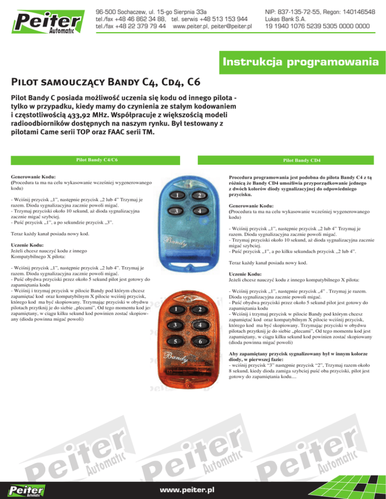 96-500 Sochaczew, ul. 15-go Sierpnia 33a tel./fax +48 46 862 34 88, tel. serwis +48 513 153 944 tel./fax +48 22 379 79 44 www.peiter.pl, [email protected] NIP: 837-135-72-55, Regon: 140146548 Lukas Bank S.A. 19 1940 1076 5239 5305 0000 0000 Instrukcja programowania Pilot samouczący Bandy C4, Cd4, C6 Pilot Bandy C posiada możliwość uczenia się kodu od innego pilota tylko w przypadku, kiedy mamy do czynienia ze stałym kodowaniem i częstotliwością 433,92 MHz. Współpracuje z większością modeli radioodbiorników dostępnych na naszym rynku. Był testowany z pilotami Came serii TOP oraz FAAC serii TM. Pilot Bandy C4/C6 Pilot Bandy CD4 Generowanie Kodu: (Procedura ta ma na celu wykasowanie wcześniej wygenerowanego kodu) - Wciśnij przycisk „1”, następnie przycisk „2 lub 4” Trzymaj je razem. Dioda sygnalizacyjna zacznie powoli migać. - Trzymaj przyciski około 10 sekund, aż dioda sygnalizacyjna zacznie migać szybciej. - Puść przycisk „1”, a po sekundzie przycisk „3”. 1 2 3 4 Generowanie Kodu: (Procedura ta ma na celu wykasowanie wcześniej wygenerowanego kodu) - Wciśnij przycisk „1”, następnie przycisk „2 lub 4” Trzymaj je razem. Dioda sygnalizacyjna zacznie powoli migać. - Trzymaj przyciski około 10 sekund, aż dioda sygnalizacyjna zacznie migać szybciej. - Puść przycisk „1”, a po kilku sekundach przycisk „2 lub 4”. Teraz każdy kanał posiada nowy kod. Uczenie Kodu: Jeżeli chcesz nauczyć kodu z innego Kompatybilnego X pilota: - Wciśnij przycisk „1”, następnie przycisk „2 lub 4”. Trzymaj je razem. Dioda sygnalizacyjna zacznie powoli migać. - Puść obydwa przyciski przez około 5 sekund pilot jest gotowy do zapamiętania kodu - Wciśnij i trzymaj przycisk w pilocie Bandy pod którym chcesz zapamiętać kod oraz kompatybilnym X pilocie wciśnij przycisk, którego kod ma być skopiowany. Trzymając przyciski w obydwu pilotach przytknij je do siebie „plecami”, Od tego momentu kod jest zapamiętany, w ciągu kilku sekund kod powinien zostać skopiowany (dioda powinna migać powoli) Procedura programowania jest podobna do pilota Bandy C4 z tą różnicą że Bandy CD4 umożliwia przyporządkowanie jednego z dwóch kolorów diody sygnalizacyjnej do odpowiedniego przycisku. Teraz każdy kanał posiada nowy kod. Uczenie Kodu: Jeżeli chcesz nauczyć kodu z innego kompatybilnego X pilota: 1 2 3 4 5 6 - Wciśnij przycisk „1”, następnie przycisk „4” . Trzymaj je razem. Dioda sygnalizacyjna zacznie powoli migać. - Puść obydwa przyciski przez około 5 sekund pilot jest gotowy do zapamiętania kodu - Wciśnij i trzymaj przycisk w pilocie Bandy pod którym chcesz zapamiętać kod oraz kompatybilnym X pilocie wciśnij przycisk, którego kod ma być skopiowany. Trzymając przyciski w obydwu pilotach przytknij je do siebie „plecami”, Od tego momentu kod jest zapamiętany, w ciągu kilku sekund kod powinien zostać skopiowany (dioda powinna migać powoli) Aby zapamiętany przycisk sygnalizowany był w innym kolorze diody, w pierwszej fazie: - wciśnij przycisk “3” następnie przycisk “2”, Trzymaj razem około 8 sekund, kiedy dioda zamiga szybciej puść oba przyciski, pilot jest gotowy do zapamiętania kodu.... www.peiter.pl