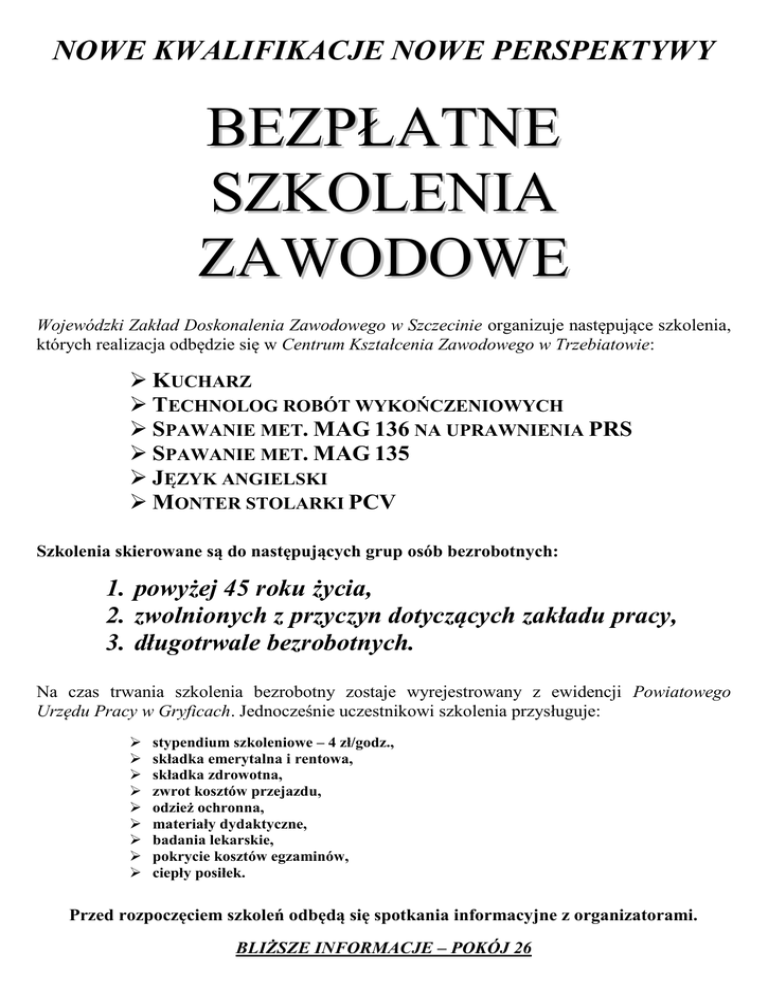 NOWE KWALIFIKACJE NOWE PERSPEKTYWY BEZPŁATNE SZKOLENIA ZAWODOWE Wojewódzki Zakład Doskonalenia Zawodowego w Szczecinie organizuje następujące szkolenia, których realizacja odbędzie się w Centrum Kształcenia Zawodowego w Trzebiatowie: KUCHARZ TECHNOLOG ROBÓT WYKOŃCZENIOWYCH SPAWANIE MET. MAG 136 NA UPRAWNIENIA PRS SPAWANIE MET. MAG 135 JĘZYK ANGIELSKI MONTER STOLARKI PCV Szkolenia skierowane są do następujących grup osób bezrobotnych: 1. powyżej 45 roku życia, 2. zwolnionych z przyczyn dotyczących zakładu pracy, 3. długotrwale bezrobotnych. Na czas trwania szkolenia bezrobotny zostaje wyrejestrowany z ewidencji Powiatowego Urzędu Pracy w Gryficach. Jednocześnie uczestnikowi szkolenia przysługuje: stypendium szkoleniowe – 4 zł/godz., składka emerytalna i rentowa, składka zdrowotna, zwrot kosztów przejazdu, odzież ochronna, materiały dydaktyczne, badania lekarskie, pokrycie kosztów egzaminów, ciepły posiłek. Przed rozpoczęciem szkoleń odbędą się spotkania informacyjne z organizatorami. BLIŻSZE INFORMACJE – POKÓJ 26 Kucharz Kurs przygotowuje uczestników do wykonywania zawodu i uzyskania kwalifikacji czeladnika, nadawanych przez Komisję Izby Rzemieślniczej MiSP. Głównym celem kursu jest nabycie przez słuchaczy wiedzy i umiejętności w zakresie technologii i techniki przygotowywania dań i potraw oraz organizacji pracy, w powiązaniu z wiadomościami teoretycznymi. Absolwenci otrzymują zaświadczenie o ukończeniu kursu i dyplom czeladnika w zawodzie kucharz/kucharz małej gastronomii. Kurs odbywać się będzie w wymiarze 160 godzin. Wymagana książeczka zdrowia Technolog robót wykończeniowych Kurs ma na celu przygotowanie teoretyczne i praktyczne uczestników do wykonywania zawodu i uzyskania kwalifikacji czeladnika, nadawanych przez Komisją Izby Rzemieślniczej MiSP. Uczestnik szkolenia nabędzie wiedzę i umiejętności organizowania swojej pracy na stanowisku, odczytywania rysunku technicznego, pozna materiały i obsługę podstawowego/pomocniczego sprzętu stosowanego przy wykonywaniu robót wykończeniowych oraz zasady wykonywania różnych rodzajów tynków, ścian i sufitów z płyt kartonowo-gipsowych, oraz suchej zabudowy wnętrz itp. Absolwenci otrzymują zaświadczenie o ukończeniu kursu i dyplom czeladnika w zawodzie technolog robót wykończeniowych w budownictwie. Kurs odbywać się będzie w wymiarze 280 godzin. Spawanie met. MAG 136 na uprawnienia PRS Celem kursu jest przygotowanie spawaczy do uzyskania uprawnień Polskiego Rejestru Statków w metodzie MAG 136. Absolwent szkolenia po zdaniu egzaminu przed komisją Polskiego Rejestru Statków uzyska zaświadczenie o ukończeniu kursu, Certyfikat PRS w zakresie spawania blach stalowych elektrodą topliwą w osłonie gazów aktywnych metoda 136 oraz wpis stosownych uprawnień do książeczki spawacza. Kurs odbywać się będzie w wymiarze 118 godzin. W szkoleniu mogą wziąć udział osoby posiadające uprawnienia spawalnicze w zakresie spawania blach i rur spoinami pachwinowymi metodą MAG 135 Spawanie met. MAG 135 Celem kursu jest przygotowanie uczestników do uzyskania uprawnień w zakresie spawania blach i rur spoinami pachwinowymi (metoda MAG 135), wg wytycznych Instytutu Spawalnictwa w Gliwicach. Absolwent szkolenia po zdaniu egzaminu kwalifikacyjnego, uzyska Świadectwo Egzaminu Spawacza Instytutu Spawalnictwa w Gliwicach, zaświadczenie o ukończeniu kursu i książeczkę spawacza z wpisem uprawnień w zakresie spawania blach i rur spoinami pachwinowymi. Kurs odbywać się będzie w wymiarze 205 godzin. W kursie może wziąć udział osoba pełnoletnia, posiadająca ukończoną szkołę co najmniej podstawową i nie mająca przeciwwskazań do wykonywania zawodu spawacza Język angielski Kurs przeznaczony jest dla osób które nie miały dotychczas kontaktu z językiem angielskim (początkujący) lub osób, które pomimo wcześniejszego kontaktu z językiem angielskim deklarują brak umiejętności językowych. Założeniem programu jest wykształcenie czterech umiejętności językowych: rozumienia ze słuchu, rozumienia tekstu czytanego, pisania oraz mówienia, przy nacisku na funkcjonalny aspekt nauczania języka. Absolwenci otrzymują zaświadczenie o ukończeniu kursu. Kurs odbywać się będzie w wymiarze 60 godzin. Monter stolarki PCV Celem kursu jest teoretyczne i praktyczne przyuczenie słuchaczy do wykonywania prac w zakresie montażu stolarki PCV. Uczestnicy kursu nabędą wiedzę w zakresie technologii montażu stolarki PCV, poznają materiały budowlane oraz zasady bezpiecznego i prawidłowego stosowania narzędzi, a także zasady właściwej organizacji pracy oraz przepisów bhp. Szczególny nacisk położony zostanie na zdobycie przez słuchaczy umiejętności praktycznych, niezbędnych przy wykonywaniu prac montażowych stolarki PCV. Absolwenci otrzymują zaświadczenie o ukończeniu kursu. Kurs odbywać się będzie w wymiarze 215 godzin.