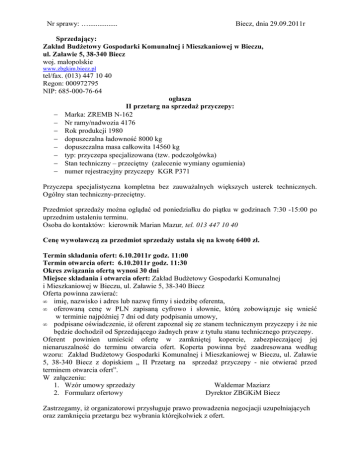 Nr sprawy: …................ Biecz, dnia 29.09.2011r Sprzedający: Zakład Budżetowy Gospodarki Komunalnej i Mieszkaniowej w Bieczu, ul. Załawie 5, 38-340 Biecz woj. małopolskie www.zbgkim.biecz.pl tel/fax. (013) 447 10 40 Regon: 000972795 NIP: 685-000-76-64 − − − − − − − − ogłasza II przetarg na sprzedaż przyczepy: Marka: ZREMB N-162 Nr ramy/nadwozia 4176 Rok produkcji 1980 dopuszczalna ładowność 8000 kg dopuszczalna masa całkowita 14560 kg typ: przyczepa specjalizowana (tzw. podczołgówka) Stan techniczny – przeciętny (zalecenie wymiany ogumienia) numer rejestracyjny przyczepy KGR P371 Przyczepa specjalistyczna kompletna bez zauważalnych większych usterek technicznych. Ogólny stan techniczny-przeciętny. Przedmiot sprzedaży można oglądać od poniedziałku do piątku w godzinach 7:30 -15:00 po uprzednim ustaleniu terminu. Osoba do kontaktów: kierownik Marian Mazur, tel. 013 447 10 40 Cenę wywoławczą za przedmiot sprzedaży ustala się na kwotę 6400 zł. Termin składania ofert: 6.10.2011r godz. 11:00 Termin otwarcia ofert: 6.10.2011r godz. 11:30 Okres związania ofertą wynosi 30 dni Miejsce składania i otwarcia ofert: Zakład Budżetowy Gospodarki Komunalnej i Mieszkaniowej w Bieczu, ul. Załawie 5, 38-340 Biecz Oferta powinna zawierać: • imię, nazwisko i adres lub nazwę firmy i siedzibę oferenta, • oferowaną cenę w PLN zapisaną cyfrowo i słownie, którą zobowiązuje się wnieść w terminie najpóźniej 7 dni od daty podpisania umowy, • podpisane oświadczenie, iż oferent zapoznał się ze stanem technicznym przyczepy i że nie będzie dochodził od Sprzedającego żadnych praw z tytułu stanu technicznego przyczepy. Oferent powinien umieścić ofertę w zamkniętej kopercie, zabezpieczającej jej nienaruszalność do terminu otwarcia ofert. Koperta powinna być zaadresowana według wzoru: Zakład Budżetowy Gospodarki Komunalnej i Mieszkaniowej w Bieczu, ul. Załawie 5, 38-340 Biecz z dopiskiem „ II Przetarg na sprzedaż przyczepy - nie otwierać przed terminem otwarcia ofert”. W załączeniu: 1. Wzór umowy sprzedaży Waldemar Maziarz 2. Formularz ofertowy Dyrektor ZBGKiM Biecz Zastrzegamy, iż organizatorowi przysługuje prawo prowadzenia negocjacji uzupełniających oraz zamknięcia przetargu bez wybrania którejkolwiek z ofert. Projekt umowy UMOWA SPRZEDAŻY zawarta w dniu ………………. roku pomiędzy: Zakładem Budżetowym Gospodarki Komunalnej i Mieszkaniowej w Bieczu, ul. Załawie 5, 38-340 Biecz reprezentowanym przez: Waldemara Maziarz– Dyrektora, Martę Michalec – Głównego Księgowego zwanym dalej "Sprzedającym" a …………………………………………………………………………………, …………………………………………………………………………………. NIP …………………….., REGON ………………. reprezentowanym przez: zwanym dalej "Kupującym", następującej treści: §1 Sprzedający sprzedaje Kupującemu przyczepę marki ZREMB N-162, nr rejestracyjny KGR P371, rok produkcji 1980, nr nadwozia 4176, w wyniku przetargu pisemnego za cenę …………. zł.(słownie:…………..........................................). §2 1. Kupujący nabywa przyczepę, o której mowa w § 1 niniejszej umowy za cenę określoną, w § 1, którą zapłaci w całości w terminie do 7 dni od podpisania umowy, na konto bankowe Sprzedającego w …………………...… nr konta …………………………………………….... 2. Wszelkie opłaty związane z realizacją niniejszej umowy ponosi Kupujący. §3 Przyczepa wraz z kompletem dokumentów zostanie wydana Kupującemu po okazaniu dowodu wpłaty należności. §4 Kupujący oświadcza, że znany jest stan techniczny zakupionej przyczepy i, że nie będzie dochodził od Sprzedającego żadnych praw z tytułu stanu technicznego w/w przyczepy. §5 Sprzedający oświadcza, że nie ponosi żadnej odpowiedzialności za stan techniczny sprzedanej przyczepy. §6 Umowę niniejszą sporządzono w dwóch jednobrzmiących egzemplarzach, z których strony otrzymują po 1 egzemplarzu. §7 W sprawach nieuregulowanych niniejszą umową mają zastosowanie odpowiednie przepisy Kodeksu Cywilnego. §8 Ewentualne zmiany niniejszej umowy mogą nastąpić wyłącznie w formie aneksu podpisanego przez obie strony niniejszej umowy. Sprzedający Kupujący Nazwa Wykonawcy: ………………………………….. Adres: ……………………………………………….. Regon: …………………… NIP: ……………………… Tel./Fax:………………………………………………. FORMULARZ OFERTOWY Nawiązując do przetargu na sprzedaż przyczepy, oferuję poniższą ceną ofertową: Cena:………….. zł. słownie: .................................................................................................. − − − − − − − − Marka: ZREMB N-162 Nr ramy/nadwozia 4176 Rok produkcji 1980 dopuszczalna ładowność 8000 kg dopuszczalna masa całkowita 14560 kg typ: przyczepa specjalizowana (tzw. podczołgówka) Stan techniczny – przeciętny (zalecenie wymiany ogumienia) numer rejestracyjny przyczepy KGR P371 Przyczepa specjalistyczna kompletna bez zauważalnych większych usterek technicznych. Ogólny stan techniczny-przeciętny. Odbiór przyczepy nastąpi u Sprzedającego do 7 dni od podpisania umowy po okazaniu dowodu wpłaty należności. 2. Kupujący oświadcza, że znany jest stan techniczny zakupionej przyczepy i że nie będzie dochodził od Sprzedającego żadnych praw z tytułu stanu technicznego w/w przyczepy. 1. Oświadczamy, że: - zapoznaliśmy się z projektem umowy nie wnosimy do niej zastrzeżeń, otrzymaliśmy konieczne informacje do przygotowania oferty, akceptujemy związanie złożoną ofertą przez okres 30 dni. ............................. ,dn. .............. ……....................................... Podpis Kupującego
