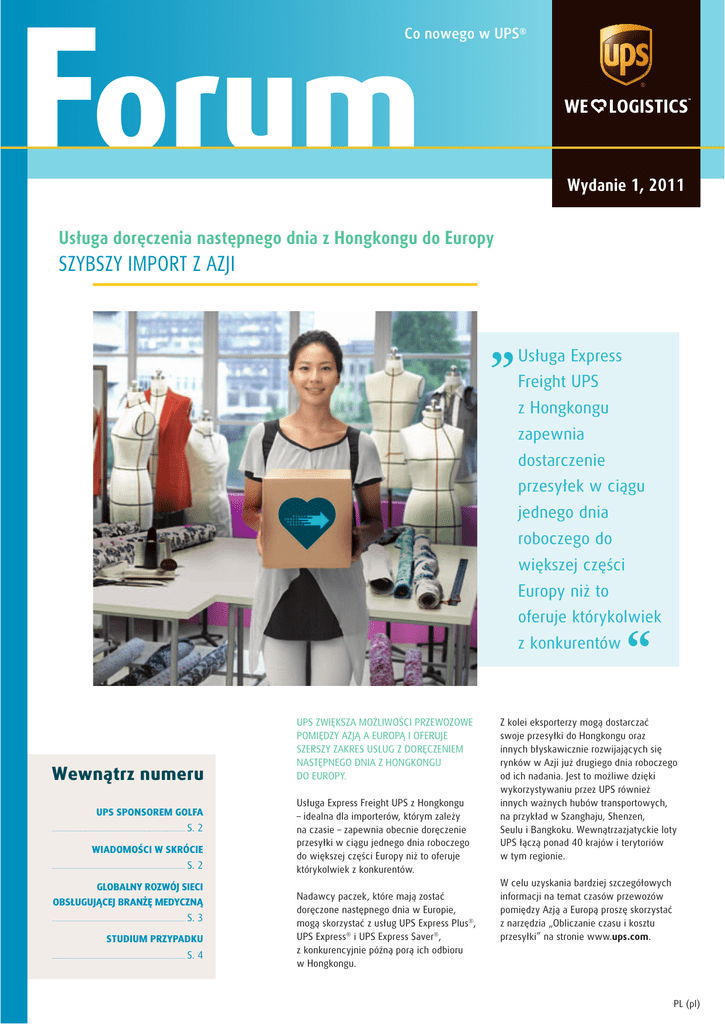 Forum Co nowego w UPS® Wydanie 1, 2011 Usługa doręczenia następnego dnia z Hongkongu do Europy SZYBSZY IMPORT Z AZJI Usługa Express Freight UPS z Hongkongu zapewnia dostarczenie przesyłek w ciągu jednego dnia roboczego do większej części Europy niż to oferuje którykolwiek z konkurentów Wewnątrz numeru UPS SPONSOREM GOLFA ........................................................................................................ S. 2 WIADOMOŚCI W SKRÓCIE ........................................................................................................ S. 2 GLOBALNY ROZWÓJ SIECI OBSŁUGUJĄCEJ BRANŻĘ MEDYCZNĄ ........................................................................................................ S. 3 STUDIUM PRZYPADKU ........................................................................................................ S. 4 UPS ZWIĘKSZA MOŻLIWOŚCI PRZEWOZOWE POMIĘDZY AZJĄ A EUROPĄ I OFERUJE SZERSZY ZAKRES USŁUG Z DORĘCZENIEM NASTĘPNEGO DNIA Z HONGKONGU DO EUROPY. Usługa Express Freight UPS z Hongkongu – idealna dla importerów, którym zależy na czasie – zapewnia obecnie doręczenie przesyłki w ciągu jednego dnia roboczego do większej części Europy niż to oferuje którykolwiek z konkurentów. Nadawcy paczek, które mają zostać doręczone następnego dnia w Europie, mogą skorzystać z usług UPS Express Plus®, UPS Express® i UPS Express Saver®, z konkurencyjnie późną porą ich odbioru w Hongkongu. Z kolei eksporterzy mogą dostarczać swoje przesyłki do Hongkongu oraz innych błyskawicznie rozwijających się rynków w Azji już drugiego dnia roboczego od ich nadania. Jest to możliwe dzięki wykorzystywaniu przez UPS również innych ważnych hubów transportowych, na przykład w Szanghaju, Shenzen, Seulu i Bangkoku. Wewnątrzazjatyckie loty UPS łączą ponad 40 krajów i terytoriów w tym regionie. W celu uzyskania bardziej szczegółowych informacji na temat czasów przewozów pomiędzy Azją a Europą proszę skorzystać z narzędzia „Obliczanie czasu i kosztu przesyłki” na stronie www.ups.com. PL (pl) 2 Sponsoring golfa przez UPS - nowości NOWY AMBASADOR MARKI ZACZYNA OD ZWYCIĘSTWA W UPS PANUJE ZADOWOLENIE Z MIANOWANIA NOWYM AMBASADOREM MARKI LOUISA OOSTHUIZENA, KTÓRY W STYCZNIU WYGRAŁ Z CHRISEM WOODEM I MANUELEM QUIROSEM DOGRYWKĘ W TURNIEJU AFRICA OPEN, ZDOBYWAJĄC TYM SAMYM ZWYCIĘSTWO W PIERWSZYM TEGOROCZNYM TURNIEJU EUROPEAN TOUR. „To wielki zaszczyt, że światowy lider w dziedzinie spedycji i logistyki wspiera mnie w European Tour”, powiedział Oosthuizen. „UPS wyznacza standardy w swojej branży, dlatego szczerze doceniam szansę, jaką jest łączenie mojego nazwiska z jedną z najbardziej szanowanych marek na świecie”. Oosthuizen będzie nie tylko reprezentował UPS na polach golfowych, lecz ponadto weźmie udział w sponsorowanych przez UPS przedsięwzięciach podczas kilku turniejów European Tour na całym świecie. Więcej informacji dotyczących zaangażowania UPS w European Tour można znaleźć na stronie www.ups.com/golf. UPS jako oficjalny sponsor European Tour w zakresie logistyki i przesyłek ekspresowych zapewnia transport i dostawę niemal wszystkiego, co jest potrzebne do przygotowania ponad 50 turniejów w 27 krajach na pięciu kontynentach. UPS sponsoruje ponadto część turniejów cyklu European Tour, co wiąże się zazwyczaj z obecnością na nich przedstawicieli firmy oraz realizacją różnych programów angażowania klientów. Do zbliżających się turniejów sponsorowanych przez UPS należą między innymi 140th Open Championship w Wielkiej Brytanii oraz US PGA Championship. Wiadomości w skrócie NOWOŚCI W USŁUGACH NOWA USŁUGA STANDARD DO TURCJI Przez kilka ostatnich miesięcy w UPS trwały wytężone prace nad rozbudowaniem sieci usługowej dla importerów i eksporterów. Ich wynikiem jest udostępnienie usługi UPS Standard® dla przesyłek nadawanych pomiędzy Belgią, Niemcami, Włochami, Holandią, Wielką Brytanią i Turcją. UPS Standard jest doskonałą usługą dla klientów pragnących zachować równowagę pomiędzy szybkością transportu a kosztami. Jej dodatkowe zalety to dostarczenie przesyłki w określonym dniu, co umożliwia nadawcom lepsze planowanie wysyłek oraz możliwość skorzystania, w razie potrzeby, z usługi odprawy celnej. ZWIĘKSZENIE DOSTĘPNOŚCI USŁUG W ROSJI Klienci w Rosji mogą obecnie korzystać z usług importu z kilku krajów oraz z nowych usług krajowych, w tym UPS Express® i UPS Returns®. UDOSKONALENIA W DZIEDZINIE MONITOROWANIA PRZESYŁEK GŁÓWNE ZALETY KORZYSTANIA Z NARZĘDZIA WORLDSHIP® 2011 Na stronie www.ups.com w ramach narzędzia do monitorowania przesyłek on-line udostępniono obecnie kilka nowych funkcji: • Jasno zdefiniowane szczegóły monitorowania • Pasek postępu pokazujący, na jakim etapie procesu przewozu znajduje się przesyłka • Możliwość przechowywania do 50 numerów monitorowania po zalogowaniu się do konta Mój UPS • Indywidualne opisy przesyłek umożliwiające ich natychmiastowe rozpoznanie • Dostęp do funkcji zamawiania powiadomień o aktualnym statusie przesyłek z każdej strony, która go pokazuje Klienci korzystający z najnowszej wersji tego wiodącego w branży oprogramowania UPS mogą zaoszczędzić czas i pieniądze dzięki uproszczeniu codziennej wysyłki przesyłek paczkowych i frachtowych. Wszystkie te udoskonalenia ułatwią dostęp do najświeższych informacji dotyczących statusu przesyłek i terminu ich dostawy. Jednym z wielu unowocześnień, które znalazły się w wersji WorldShip 2011, jest włączenie do niej funkcji UPS Import Control®, zapewniającej klientom większy wybór sposobów zarządzania przesyłkami importowymi oraz możliwość skorzystania z opcji carbon neutral, tam gdzie jest ona dostępna. Inne przydatne cechy to możliwość sprawdzenia, jakie usługi są dostępne z i do konkretnego kodu pocztowego oraz potwierdzenia, że płatn