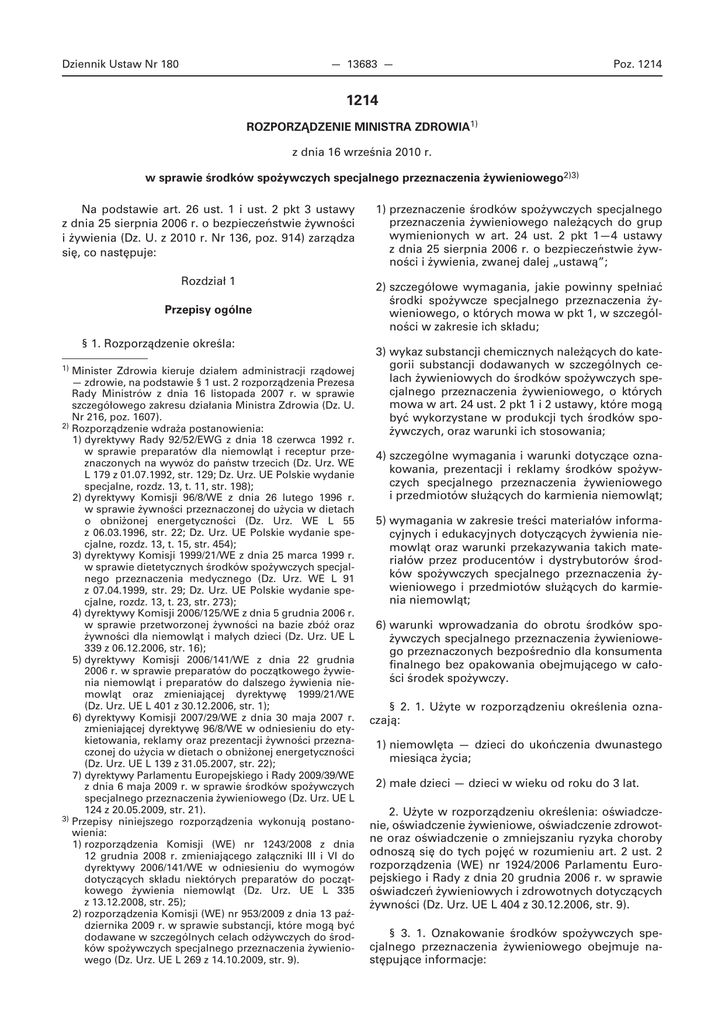 Dziennik Ustaw Nr 180 — 13683 — Poz. 1214 1214 ROZPORZĄDZENIE MINISTRA ZDROWIA1) z dnia 16 września 2010 r. w sprawie środków spożywczych specjalnego przeznaczenia żywieniowego2)3) Na podstawie art. 26 ust. 1 i ust. 2 pkt 3 ustawy z dnia 25 sierpnia 2006 r. o bezpieczeństwie żywności i żywienia (Dz. U. z 2010 r. Nr 136, poz. 914) zarządza się, co następuje: Rozdział 1 Przepisy ogólne § 1. Rozporządzenie określa: 1) Minister Zdrowia kieruje działem administracji rządowej — zdrowie, na podstawie § 1 ust. 2 rozporządzenia Prezesa Rady Ministrów z dnia 16 listopada 2007 r. w sprawie szczegółowego zakresu działania Ministra Zdrowia (Dz. U. Nr 216, poz. 1607). 2) Rozporządzenie wdraża postanowienia: 1) dyrektywy Rady 92/52/EWG z dnia 18 czerwca 1992 r. w sprawie preparatów dla niemowląt i receptur przeznaczonych na wywóz do państw trzecich (Dz. Urz. WE L 179 z 01.07.1992, str. 129; Dz. Urz. UE Polskie wydanie specjalne, rozdz. 13, t. 11, str. 198); 2) dyrektywy Komisji 96/8/WE z dnia 26 lutego 1996 r. w sprawie żywności przeznaczonej do użycia w dietach o obniżonej energetyczności (Dz. Urz. WE L 55 z 06.03.1996, str. 22; Dz. Urz. UE Polskie wydanie specjalne, rozdz. 13, t. 15, str. 454); 3) dyrektywy Komisji 1999/21/WE z dnia 25 marca 1999 r. w sprawie dietetycznych środków spożywczych specjalnego przeznaczenia medycznego (Dz. Urz. WE L 91 z 07.04.1999, str. 29; Dz. Urz. UE Polskie wydanie specjalne, rozdz. 13, t. 23, str. 273); 4) dyrektywy Komisji 2006/125/WE z dnia 5 grudnia 2006 r. w sprawie przetworzonej żywności na bazie zbóż oraz żywności dla niemowląt i małych dzieci (Dz. Urz. UE L 339 z 06.12.2006, str. 16); 5) dyrektywy Komisji 2006/141/WE z dnia 22 grudnia 2006 r. w sprawie preparatów do początkowego żywienia niemowląt i preparatów do dalszego żywienia niemowląt oraz zmieniającej dyrektywę 1999/21/WE (Dz. Urz. UE L 401 z 30.12.2006, str. 1); 6) dyrektywy Komisji 2007/29/WE z dnia 30 maja 2007 r. zmieniającej dyrektywę 96/8/WE w odniesieniu do etykietowania, reklamy oraz prezentacji żywności przeznaczonej do użycia w dietach o obniżonej energetyczności (Dz. Urz. UE L 139 z 31.05.2007, str. 22); 7) dyrektywy Parlamentu Europejskiego i Rady 2009/39/WE z dnia 6 maja 2009 r. w sprawie środków spożywczych specjalnego przeznaczenia żywieniowego (Dz. Urz. UE L 124 z 20.05.2009, str. 21). 3) Przepisy niniejszego rozporządzenia wykonują postanowienia: 1) rozporządzenia Komisji (WE) nr 1243/2008 z dnia 12 grudnia 2008 r. zmieniającego załączniki III i VI do dyrektywy 2006/141/WE w odniesieniu do wymogów dotyczących składu niektórych preparatów do początkowego żywienia niemowląt (Dz. Urz. UE L 335 z 13.12.2008, str. 25); 2) rozporządzenia Komisji (WE) nr 953/2009 z dnia 13 października 2009 r. w sprawie substancji, które mogą być dodawane w szczególnych celach odżywczych do środków spożywczych specjalnego przeznaczenia żywieniowego (Dz. Urz. UE L 269 z 14.10.2009, str. 9). 1) przeznaczenie środków spożywczych specjalnego przeznaczenia żywieniowego należących do grup wymienionych w art. 24 ust. 2 pkt 1—4 ustawy z dnia 25 sierpnia 2006 r. o bezpieczeństwie żywności i żywienia, zwanej dalej „ustawą”; 2) szczegółowe wymagania, jakie powinny spełniać środki spożywcze specjalnego przeznaczenia żywieniowego, o których mowa w pkt 1, w szczególności w zakresie ich składu; 3) wykaz substancji chemicznych należących do kategorii substancji dodawanych w szczególnych celach żywieniowych do środków spożywczych specjalnego przeznaczenia żywieniowego, o których mowa w art. 24 ust. 2 pkt 1 i 2 ustawy, które mogą być wykorzystane w produkcji tych środków spożywczych, oraz warunki ich stosowania; 4) szczególne wymagania i warunki dotyczące oznakowania, prezentacji i reklamy środków spożywczych specjalnego przeznaczenia żywieniowego i przedmiotów służących do karmienia niemowląt; 5) wymagania w zakresie treści materiałów informacyjnych i edukacyjnych dotyczących żywienia niemowląt oraz warunki przekazywania takich materiałów przez producentów i dystrybutorów środków spożywczych specjalnego przeznaczenia żywieniowego i przedmiotów służących do karmienia niemowląt; 6) warunki wprowadzania do obrotu środków spożywczych specjalnego przeznaczenia żywieniowego przeznaczonych bezpośrednio dla konsumenta finalnego bez opakowania obejmującego w całości środek spożywczy. § 2. 1. Użyte w rozporządzeniu określenia oznaczają: 1) niemowlęta — dzieci do ukończenia dwunastego miesiąca życia; 2) małe dzieci — dzieci w wieku od roku do 3 lat. 2. Użyte w rozporządzeniu określenia: oświadczenie, oświadczenie żywieniowe, oświadczenie zdrowotne oraz oświadczenie o zmniejszaniu ryzyka choroby odnoszą się do tych pojęć w rozumieniu art. 2 ust. 2 rozporządzenia (WE) nr 1924/2006 Parlamentu Europejskiego i Rady z dnia 20 grudnia 2006 r. w sprawie oświadczeń żywieniowych i zdrowotnych dotyczących żywności (Dz. Urz. UE L 404 z 30.12.2006, str. 9). § 3. 1. Oznakowanie środków spożywczych specjalnego przeznaczenia żywieniowego obejmuje następujące informacje: Dziennik Ustaw Nr 180 — 13684 — 1) nazwę środka spożywczego specjalnego przeznaczenia żywieniowego uzupełnioną informacją dotyczącą szczególnych cech żywieniowych tej żywności, a w przypadku żywności przeznaczonej dla niemowląt i małych dzieci w miejsce tej informacji zamieszcza się informację na temat przeznaczenia środka spożywczego; 2) w przypadku środków spożywczych specjalnego przeznaczenia żywieniowego, dla których rozporządzenie nie określa szczegółowych wymagań zdrowotnych — również informacje dotyczące: a) szczególnych cech dotyczących składu ilościowego i jakościowego produktu lub informacje dotyczące specjalnego procesu produkcji, nadającego środkowi spożywczemu szczególne wartości żywieniowe, b) dostępnej w