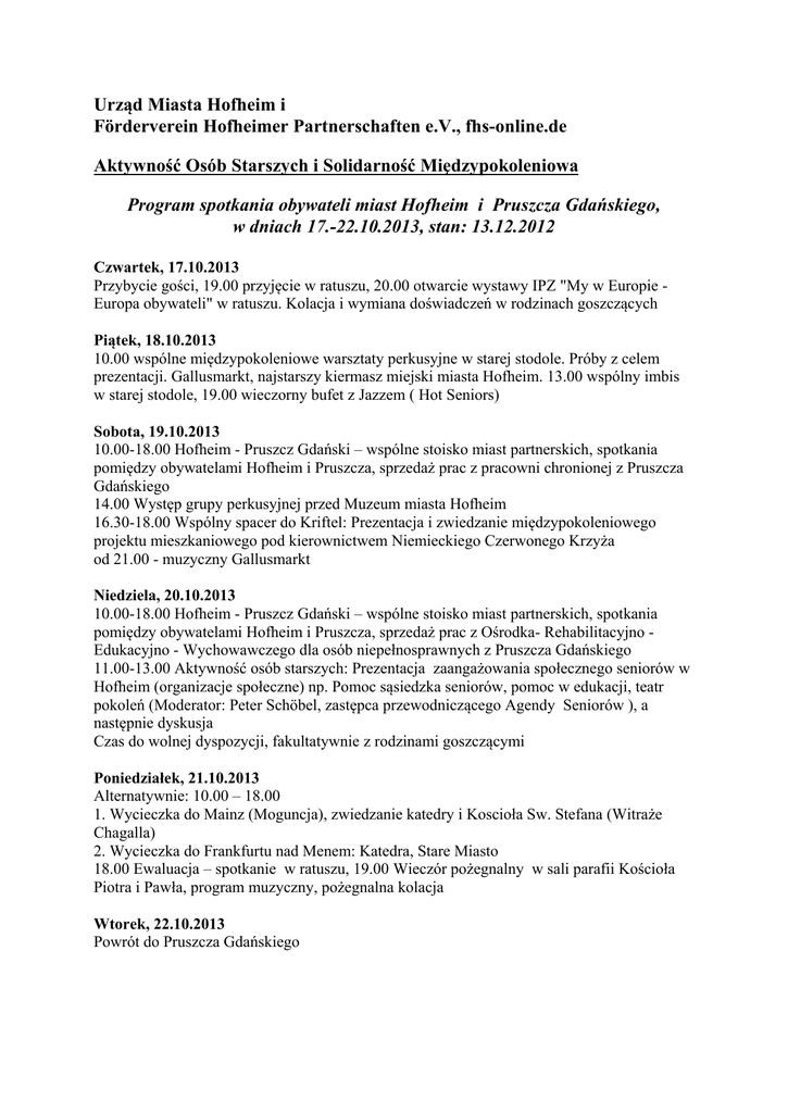 Urząd Miasta Hofheim i Förderverein Hofheimer Partnerschaften e.V., fhs-online.de Aktywność Osób Starszych i Solidarność Międzypokoleniowa Program spotkania obywateli miast Hofheim i Pruszcza Gdańskiego, w dniach 17.-22.10.2013, stan: 13.12.2012 Czwartek, 17.10.2013 Przybycie gości, 19.00 przyjęcie w ratuszu, 20.00 otwarcie wystawy IPZ "My w Europie Europa obywateli" w ratuszu. Kolacja i wymiana doświadczeń w rodzinach goszczących Piątek, 18.10.2013 10.00 wspólne międzypokoleniowe warsztaty perkusyjne w starej stodole. Próby z celem prezentacji. Gallusmarkt, najstarszy kiermasz miejski miasta Hofheim. 13.00 wspólny imbis w starej stodole, 19.00 wieczorny bufet z Jazzem ( Hot Seniors) Sobota, 19.10.2013 10.00-18.00 Hofheim - Pruszcz Gdański – wspólne stoisko miast partnerskich, spotkania pomiędzy obywatelami Hofheim i Pruszcza, sprzedaż prac z pracowni chronionej z Pruszcza Gdańskiego 14.00 Występ grupy perkusyjnej przed Muzeum miasta Hofheim 16.30-18.00 Wspólny spacer do Kriftel: Prezentacja i zwiedzanie międzypokoleniowego projektu mieszkaniowego pod kierownictwem Niemieckiego Czerwonego Krzyża od 21.00 - muzyczny Gallusmarkt Niedziela, 20.10.2013 10.00-18.00 Hofheim - Pruszcz Gdański – wspólne stoisko miast partnerskich, spotkania pomiędzy obywatelami Hofheim i Pruszcza, sprzedaż prac z Ośrodka- Rehabilitacyjno Edukacyjno - Wychowawczego dla osób niepełnosprawnych z Pruszcza Gdańskiego 11.00-13.00 Aktywność osób starszych: Prezentacja zaangażowania społecznego seniorów w Hofheim (organizacje społeczne) np. Pomoc sąsiedzka seniorów, pomoc w edukacji, teatr pokoleń (Moderator: Peter Schöbel, zastępca przewodniczącego Agendy Seniorów ), a następnie dyskusja Czas do wolnej dyspozycji, fakultatywnie z rodzinami goszczącymi Poniedziałek, 21.10.2013 Alternatywnie: 10.00 – 18.00 1. Wycieczka do Mainz (Moguncja), zwiedzanie katedry i Koscioła Sw. Stefana (Witraże Chagalla) 2. Wycieczka do Frankfurtu nad Menem: Katedra, Stare Miasto 18.00 Ewaluacja – spotkanie w ratuszu, 19.00 Wieczór pożegnalny w sali parafii Kościoła Piotra i Pawła, program muzyczny, pożegnalna kolacja Wtorek, 22.10.2013 Powrót do Pruszcza Gdańskiego