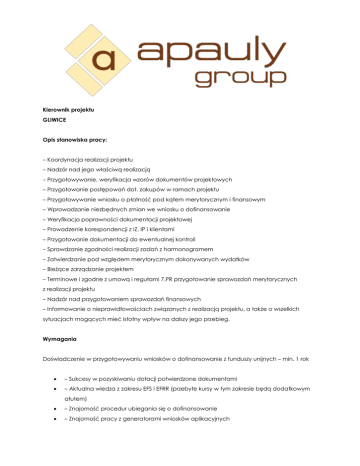 Kierownik projektu GLIWICE Opis stanowiska pracy: – Koordynacja