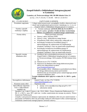 Zespół Szkół z Oddziałami Integracyjnymi w Łomnicy Łomnica, ul. Świerczewskiego 160, 58-508 Jelenia Góra 14 tel./fax.: (75) 71-30-256, 71-30-698 KG – 271/ZO/18/2015 Przedmiot zapytania Termin i sposób realizacji i zapłaty Forma oferty Sposób i termin składania ofert NIP-611-23-69-914 ZAPYTANIE O OFERTĘ Usługi stałej konserwacji i przeglądów kotłów olejowych oraz dozór nad urządzeniami grzewczymi i instalacją c.o. i c.w.u w Zespole Szkół z Oddziałami Integracyjnymi w Łomnicy Termin realizacji: od 01.01.2016 do 31.12.2017r. Sposób zapłaty: przelew 14 dni od daty wystawionej faktury na podstawie zrealizowanego zamówienia Oferta powinna zawierać: Nazwę i adres oferenta (NIP) Nazwę i cenę, jednostkową usługi brutto Wypełniony druk oferty stanowiący załącznik nr 1 kserokopię świadectwa kwalifikacyjnego E uprawniającego do zajmowania się eksploatacją urządzeń, instalacji i sieci na stanowisku eksploatacji. kserokopię świadectwa kwalifikacyjnego D uprawniającego do zajmowania się eksploatacją urządzeń, instalacji i sieci na stanowisku dozoru 1) Osobiście lub za pośrednictwem poczty na adres: Zespół Szkół z Oddziałami Integracyjnymi w Łomnicy ul. Świerczewskiego 160 Łomnica 58-508 Jelenia Góra 14 2) Faksem na nr (75) 7130256 3) Dopuszcza się składanie ofert drogą elektroniczną (skan oferty oraz załączników) na adres: Szczegółowe informacje [email protected] W przypadku oferty składanej za pośrednictwem faksu lub drogą elektroniczną należy potwierdzić telefonicznie jej otrzymanie przez zamawiającego przed terminem składania ofert. Termin składania ofert upływa w dniu 20 .11. 2015 r. godz. 12:00 Daniel Cisek- tel./fax (75) 7130256 [email protected] Najniższa cena strona: www.myslakowice.bip.net.pl/?c=557 sekretariat szkoły Kryteria oceny ofert Specyfikacja zapytania wraz z załącznikami znajduje się: Zgodnie z art. 4 pkt 8 Ustawy z dn. 29.01.2004 r. Prawo Zamówień Publicznych (t.j. Dz. U. z 2013 r., poz. 907 z póź zm. ) wobec zamówienia nie stosuje się ustawy Prawo Zamówień Publicznych. związku z powyższym niniejsze zaproszenie do składania ofert nie jest zamówieniem i otrzymane od Państwa ofert nie powoduje żadnych zobowiązań wobec zamawiającego. Udzielenie zamówienia nastąpi poprzez zawarcie umowy. Strona 1 z 7 załącznik nr 1 FORMULARZ OFERTOWY ………………………….. ……………………………….. Miejscowość , data ………………………….. ………………………….. … Nazwa oferenta (adres, dane kontaktowe, ) Zespół Szkół z Oddziałami Integracyjnymi w Łomnicy ul. Świerczewskiego 160 Łomnica 58-508 Jelenia Góra 14 Odpowiadając na zapytanie ofertowe dotyczące Usługi stałej konserwacji i przeglądów kotłów olejowych oraz dozór nad urządzeniami grzewczymi i instalacją c.o. i c.w.u w Zespole Szkół z Oddziałami Integracyjnymi w Łomnicy ul. Świerczewskiego 160 Łomnica 58-508 Jelenia Góra, składam ofertę następującej treści: Jednostki miary Nazwa usługi 1 2 Usługi stałej konserwacji przeglądów kotłów olejowych oraz dozór nad urządzeniami grzewczymi i instalacją c.o. i c.w.u – miesięcznie w okresie grzewczym . miesiąc Cena Ilość jednostkowa miesięcy brutto grzewczych w okresie trwania umowy 3 Wartość oferty brutto ( kol. 3x kol. 4) 4 5 14 Proponujemy realizację całości zamówienia wartość brutto ( z VAT)......................................................................... (słownie:.............................................................................................................................złotych) Przyjmuję do realizacji warunki postawione przez zamawiającego w zapytaniu i oświadczam, że jestem płatnikiem VAT o numerze identyfikacyjnym NIP …………………………….. Oświadczenia: 1. Oświadczam, że posiadam wiedzę i doświadczenie oraz dysponuję potencjałem technicznym niezbędnym do wykonania zamówienia. 2. Oświadczam, że akceptuję warunki umowy według wzoru stanowiącego Załącznik Nr 2 do zapytania i w przypadku wyboru naszej oferty, zobowiązuję się do zawarcia umowy na tych warunkach w miejscu i terminie wyznaczonym przez Zamawiającego. …………………………………….. Miejscowość, data …………………………………………….. podpis uprawnionego przedstawiciela Oferenta Strona 2 z 7 Załącznik nr 2- Szczegółowe warunki umowy § 1. Przedmiot umowy stanowią : 1. Usługi stałej konserwacji i przeglądów kotłów olejowych oraz dozór nad urządzeniami grzewczymi, instalacją c.o. i c.w.u w Zespole Szkół z Oddziałami Integracyjnymi w Łomnicy ul. Świerczewskiego 160 Łomnica 58-508 Jelenia Góra 14. Zakres usługi: a) Usługa w zakresie przeglądu i konserwacji kotłów olejowych przed uruchomieniem sezonu grzewczego polegająca na przeglądzie i ocenie stanu technicznego oraz poprawności działania urządzeń i instalacji c.o. i c.w.u. obejmuje następujące roboty: czyszczenie kotłów po drodze spalin ręczne i chemiczne czyszczenie i ewentualna wymiana filtrów: olejowych ,wodnych demontaż elektrody zapłonowej, fotokomórki, czyszczenie - ewentualna wymiana wykonanie regulacji palnika i analizy spalin, ew. wymiana dyszy palnika sprawdzenie i regulacja naczyń zamkniętych sprawdzenie ciśnienia w instalacji grzewczej i uzupełnienie zładu wodą sprawdzenie poprawności działania zaworów ( w tym zaworów bezpieczeństwa),manometrów i termometrów - usunięcie ewentualnych usterek sprawdzenie działania i konserwacja urządzeń sterowania i automatyki konserwacja nie wymieniona powyżej a wymagana instrukcją obsługi urządzeń grzewczych uruchomienie urządzeń grzewczych -sporządzenie z tych czynności protokołów dla Zamawiającego b) usługa stałego dozoru nad urządzeniami kotłowni na olej opałowy oraz instalacjami c.o. i c.w.u., w sezonie grzewczym od 01.09 do 31.03 obejmuje wykonanie raz w miesiąc