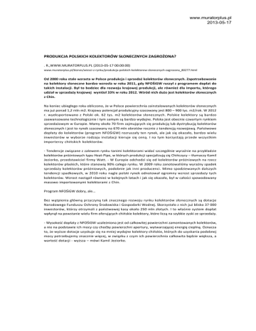 www.muratorplus.pl 2013-05-17 PRODUKCJA POLSKICH KOLEKTORÓW SŁONECZNYCH ZAGROŻONA? . R.,WWW.MURATORPLUS.PL (2013-05-17 00:00:00) www.muratorplus.pl/biznes/wiesci-z-rynku/produkcja-polskich-kolektorow-slonecznych-zagrozona_80277.html Od 2000 roku stale wzrasta w Polsce produkcja i sprzedaż kolektorów słonecznych. Zapotrzebowanie na kolektory słoneczne bardzo wzrosła w roku 2011, gdy NFOŚiGW ruszył z programem dopłat do takich instalacji. Był to bodziec dla rozwoju krajowej produkcji, ale również dla importu, którego udział w sprzedaży krajowej wyniósł 33% w roku 2012. Wśród nich dużo jest kolektorów słonecznych z Chin. Na koniec ubiegłego roku obliczono, że w Polsce powierzchnia zainstalowanych kolektorów słonecznych ma już ponad 1,2 mln m2. Krajowy potencjał produkcyjny szacowany jest 800 – 900 tys. m2/rok. W 2012 r. wyeksportowano z Polski ok. 62 tys. m2 kolektorów słonecznych. Polskie kolektory są bardzo zaawansowane technologicznie i tym samym są bardzo wydajne. Polska jest obecnie czwartym rynkiem sprzedażowym w Europie. Mamy około 70 firm zajmujących się produkcją lub dystrybucją kolektorów słonecznych i jest to rynek szacowany na 670 mln obrotów rocznie z tendencją rozwojową. Państwowe dopłaty do kolektorów (program NFOŚiGW) rozruszały ten rynek, ale jak się okazało, bardzo wielu inwestorów w wyborze rodzaju instalacji kieruje się ceną. I na tym korzystają przede wszystkim importerzy chińskich kolektorów. - Tendencje związane z zalewem rynku tanimi kolektorami widać szczególnie wyraźnie na przykładzie kolektorów próżniowych typu Heat-Pipe, w których produkcji specjalizują się Chińczycy – tłumaczy Kamil Jeziorko, przedstawiciel firmy Watt. - W Europie odchodzi się od kolektorów próżniowych na rzecz kolektorów płaskich, które stanowią 90% całego rynku. W 2009 roku zanotowaliśmy wyraźny spadek sprzedaży kolektorów próżniowych, podobnie jak inni producenci. Mimo spodziewanych dalszych tendencji spadkowych, w 2010 roku nagle polski rynek odnotował ogromny wzrost sprzedaży tych kolektorów. Wzrost nastąpił również w kolejnych latach i jak się okazało, był w całości spowodowany masowo importowanymi kolektorami z Chin. Program NFOŚiGW dobry, ale... Bez wątpienia główną przyczyną tak znacznego rozwoju rynku kolektorów słonecznych są dotacje Narodowego Funduszu Ochrony Środowiska i Gospodarki Wodnej. Skorzystało z nich już blisko 37 000 inwestorów, którzy otrzymali z państwowej kasy około 250 mln złotych. I to właśnie system dopłat wpłynął na powstanie wielu firm oferujących chińskie kolektory, które liczą na szybkie zyski ze sprzedaży. - Wysokość dopłaty z NFOŚiGW uzależniona jest od całkowitej powierzchni zamontowanych kolektorów, a nie na podstawie ich mocy czy choćby powierzchni apertury, wytwarzającej energię cieplną. Oznacza to, że wyższe dotacje uzyskuje się na mniej wydajne kolektory chińskie, których do uzyskania podobnej mocy potrzebujemy znacznie więcej, w związku z czym ich powierzchnia całkowita będzie większa, a wartość dotacji - wyższa – mówi Kamil Jeziorko. www.muratorplus.pl 2013-05-17 Również ogłaszane przez gminy przetargi na zakup i montaż kolektorów słonecznych wspierają czasem importerów chińskich urządzeń. Jeżeli jedynym kryterium zamówienia jest cena, żaden europejski producent nie ma szans z Chinami. Trzeba jeszcze dodać, że technologia Heat Pipe nie jest wykorzystywana na żadnej krajowej linii produkcyjnej. - W całej Europie, odwrotnie niż u nas, przyznawane przez rząd dotacje wspierają rynek krajowy. W Belgii na przykład, zaraz po wprowadzeniu, dopłata była również uzależniona od powierzchni całkowitej, ale bardzo szybko się z tego wycofano – podsumowuje sytuację na rynku kolektorów Kamil Jeziorko. – Polskie firmy nie oczekują specjalnego traktowania, tylko gwarancji równych możliwości dla wszystkich podmiotów działających w naszym kraju, a nie poczucia dyskryminacji. Jak sie okazuje, chińskie kolektory słoneczne to nie tylko polski problem. W Niemczech zbankrutował niedawno największy producent fotowoltaiki, wielu mniejszych już wcześniej musiało ogłosić upadłość. W obliczu tych wydarzeń ma zostać wprowadzone cło na fotowoltaikę z Chin. Nie dotyczy to - jeszcze? kolektorów słonecznych. .