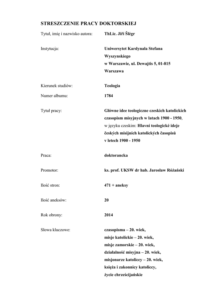STRESZCZENIE PRACY DOKTORSKIEJ Tytuł, imię i nazwisko autora: ThLic. Jiří Šlégr Instytucja: Uniwersytet Kardynała Stefana Wyszynskiego w Warszawie, ul. Dewajtis 5, 01-815 Warszawa Kierunek studiów: Teologia Numer albumu: 1784 Tytuł pracy: Główne idee teologiczne czeskich katolickich czasopism misyjnych w latach 1900 - 1950, w języku czeskim: Hlavní teologické ideje českých misijních katolických časopisů v letech 1900 - 1950 Praca: doktorancka Promotor: ks. prof. UKSW dr hab. Jarosław Różański Ilość stron: 471 + aneksy Ilość aneksów: 20 Rok obrony: 2014 Słowa kluczowe: czasopisma – 20. wiek, misje katolickie – 20. wiek, misje zamorskie – 20. wiek, działalność misyjna – 20. wiek, misjonarze katoliccy – 20. wiek, księża i zakonnicy katoliccy, życie chrześcijańskie Co do czeskich czasopism misyjnych, dotychczas nie udało się znaleźć ich całkowity przegląd lub systematyczne opracowanie. Dlatego właśnie ten temat został w pracy doktorskiej opracowany bardziej kompleksowo. Oczywiście, głównym materiałem źródłowym, jak wynika z tematu pracy, były czasopisma misyjne. Zwrócono się do biskupstw, bibliotek i archiwów w Czechach, Austrii, Słowacji, Polsce i Włoszech, zapytano wszystkich zakonów i kongregacji działających na terenie czeskich i morawskich diecezji, gdzie szukano czasopisma, raporty roczne, kalendarze ewentualnie inne periodyki wydane w języku czeskim od 1900 roku do 1950. Dzięki Bogu udało się znaleźć w sumie 21 periodyków, z których 16 jest przeznaczonych tylko dla dorosłych, 5 dla dzieci i młodzieży. Chodzi mniej więcej o 285 roczników i 2300 numerów, które można znaleźć mniej więcej na 42 800 stronach. Mniej więcej połowa badanych źródeł pojawiała się co miesiąc, dwa raz w roku a inne nieregularnie. Do grupy docelowej, dla której czasopisma są przeznaczone, zaliczamy ludzi należących lub współpracujących ze zgromadzeniami zakonnymi i stowarzyszeniami. Znajdziemy wśród nich osoby o różnym wieku i wykształceniu, rodziny, młodzież, studentów i dzieci. Jeśli zwrócimy uwagę na rozpoczęcie wydawania, stwierdzimy, że tylko dwa czasopisma wydawano od lat 1900-1901, kolejne trzy od lat 1912-1914, dwa od lat 1919-1921 i dwa od lat 1925-1926. Reszta pokazała się po 1928 roku. W odróżnieniu od tego, jeśli chodzi o rok zakończenia wydawania, siedem periodyków skończyło w 1948 roku, dwa w latach 1945-1946, kolejnych pięć w latach 1939-1941 a reszta przed 1936 rokiem. Przez niewiarygodnych 41 lat pokazywało się regularnie Echo z Afryki – miesięcznik katolicki wspierający działalność misyjną w Afryce – w czym miało swoją zasługę Bractwo św. Piotra Klavera. Już tylko miesięcznik dla czeskosłowiańskich tercjarzy Kwiaty serafickie, który przygotowywali Tercjarze z zakonu franciszkanów konwentualnych, franciszkanów i kapucynów, był wydawany przez tak długi czas (mniej więcej 40 lat). Wśród wydawców znajdziemy misyjnie nastawione zgromadzenia zakonne (salezjanie, jezuici, werbiści, franciszkanie konwentualni, klawerianie, franciszkanie i kapucyni), bractwa lub stowarzyszenia (Bractwo św. Piotra Klawera dla misji afrykańskich, Dzieło Rozkrzewiania Wiary, stowarzyszenie św. Rafaela, Franciszkańskie Stowarzyszenie Misyjne, Studenckie Stowarzyszenie Misyjne, Apostolat Trzeciego Zakonu św. Franciszka, Tercjarze Zakonu Franciszkanów Konwentualnych, Franciszkanów i Kapucynów). Jak jest widoczne, większość owych stowarzyszeń miała wsparcie wymienionych zakonów. Specyficzne miejsce wśród badanych periodyków zajmuje Informator Dzieła Rozkrzewiania Wiary i Misje Katolickie. Właśnie tym źródłom poświęcono więcej uwagi. Są one bowiem związane z Papieskim Dziełem Misyjnym i z nowym i rozwijającym się ujęciem pomocy misjom. Przez wszystkie zgromadzenia zakonne, stowarzyszenia i bractwa, we współpracy z każdą parafią i wspólnotą na poszczególnych kontynentach organizują Papieskie Dzieła Misyjne ogólnoświatową kampanię modlitewną i finansową. Praca zwraca uwagę na kilka następujących zakresów, które łączą się z periodykami misyjnymi publikowanymi w latach 1900-1950: 1. Przedstawia rozumienie problematyki misyjnej w świecie i w Republice Czeskiej w pierwszej połowie 20. wieku. W tym kontekście definiuje posłannictwo misyjne, zamuje się podstawami teologicznymi, Pismem Święteym, Ojcami Kościoła i dokumentami Magisterium Kościoła. Współczesne źródła bez wątpliwości pokazują, że do zbawienia zostali powołani także poganie. Oczywisty uniwersalizm misyjny potwierdzają cytatami z Pisma Świętego. Podkreślają rzeczywistość zbawienia uniwersalnego, iż już w Starym Testamencie mieli zostać zbawieni także poganie. Uniwersalizm misyjny znajdziemy także u Ojców Kościoła i w dokumentach Kościoła. Do uniwersalizmu zbawienia odsyłają także encykliki o misjach papieży Benedykta XV i Piusa XI. Koncepcja posłannictwa misyjnego łączy źródła czasowe z czterema aspektami wyrazu misje: osoba, która wysyła (Bóg lub Kościół), wysłany (apostoł lub misjonarze), zadanie (głosić ewangelię) i miejsce (terytorium lub osoby, do których się wysyła); autorzy przytaczają także prawo kościelne (Kan. 109), w którym ma misja znaczenie mianowania (pełnomocnictwa) zdolnej osoby przez władze kościelne do wykonywania pewnego urzędu. W węższym znaczeniu oznacza missio (Kan. 1 328) udzielenie specjalnego uprawnienia do głoszenia Słowa Bożego (np. księżom i katechetom). Specyficzny jest ówczesny sposób przedsoborowego rozumienia odpowiedzialności misyjnej i stylu pracy Kościoła katolickiego. Za pomocą słów Jezusa tłumaczy się, że Kościół katolicki (apostołowie i ich następcy) stara się na podstawie swojego zadania przyprowadzić do owczarni Chrystusowej wszystkich ludzi, dopóki wszystkie narody nie będą wcielone do prawdziwego Kościoła Chrystusowego.