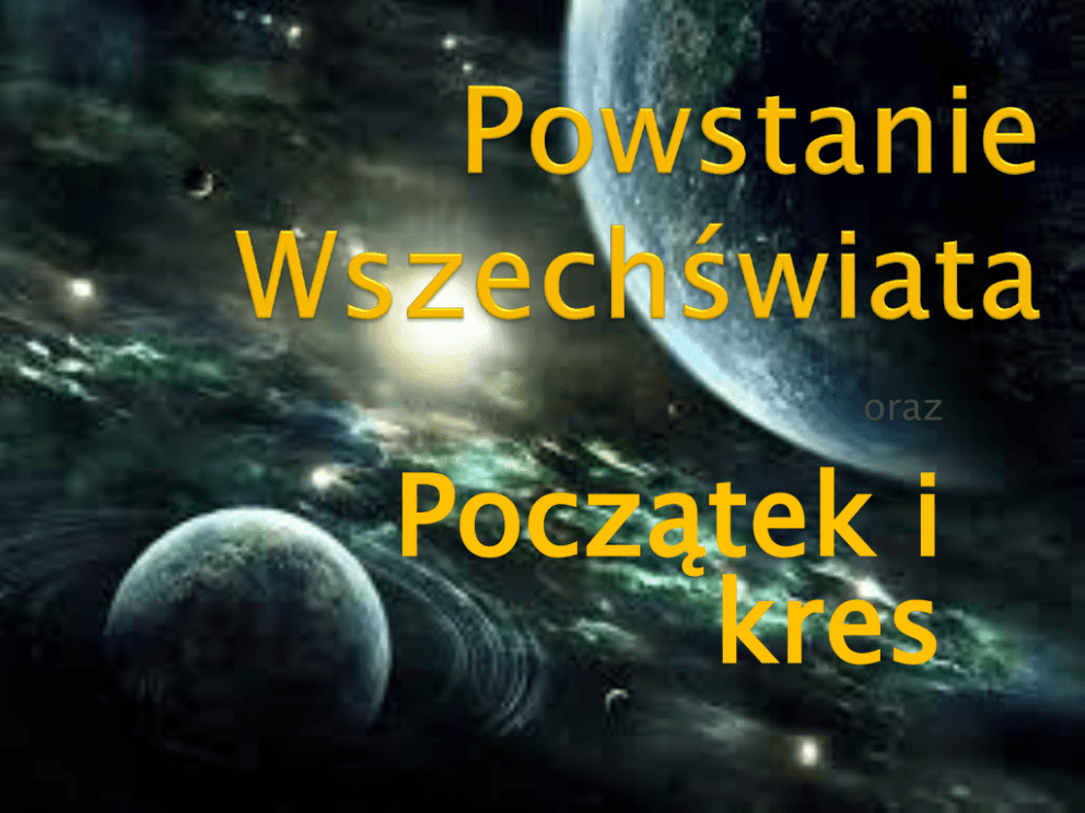 oraz Początek i kres Powstanie Wszechświata szacuje się na 13, 75 mld lat temu. Na początku jego wymiary były bardzo małe, a jego gęstość bardzo duża i temperatura niezwykle wysoka. Ponieważ w tej niezmiernie małej objętości panowała ekstremalnie wysoka temperatura i niewyobrażalnie duże ciśnienie, to doszło do wybuchu nazywanego Wielkim Wybuchem. Wyłonił się z niego Wszechświat (przestrzeń, czas, materia, energia i oddziaływania). Według teorii względności, w miarę rozszerzania wszechświata, długość fali każdego fotonu ( nośnika fali elektormagnetycznej ) powoli się zwiększa, co zmniejsza jednocześnie jego energię. Tym samym im dłużej dany foton istnieje, tym bardziej jest przesunięty ku czerwieni. W miarę rozszerzania się wszechświata energia promieniowania maleje szybciej niż energia materii. Można z tego wnioskować, że choć obecnie większość energii ma postać materii, w przeszłości większość była w postaci promieniowania. Z pierwotnej materii, której natury nie znamy, w miarę upływu czasu zaczęły powstawać pierwsze cząstki materii, które nazywamy cząstkami prawdziwie elementarnymi – elektrony i kwarki. Gdy energia kwarków na skutek stygnięcia ,z powodu rozszerzajacego sie Wszechświata zmalała i działające między nimi siły mogły połączyć je ze sobą, powstały pierwsze protony, które później razem z elektronami utworzyły atomy najlżejszych pierwiastków, jakim jest wodór i hel. Chociaż Wszechświat wciąż się rozszerzał i rozszerza się nadal, oba pierwiastki zebrały się w olbrzymie obłoki gazowe, z których ostatecznie powstały galaktyki, a w nich narodziły się pierwsze gwiazdy. Początek ekspansji Wszechświata nazywamy właśnie Wielkim Wybuchem. Istniej kilka najważniejszych etapów w ewolucji Wszechświata zwanych erami. Era Plancka (od 0 do 10-43sekundy) Era plazmy kwarkowo - gluonowej (hadronowa) od 10-43sekundy do 10-4sekundy) Era leptonowa (od 10-4sekundy do 10 sekund) Era promieniowania (od 10 sekund do 300 000 lat) Era gwiazdowa (galaktyczna) (od 300 000 lat do dzisiaj) Od 0 do 10-43sekundy W pierwszych 10-43 sekundy przy gęstość większej od 1097 kg/m3 einstenowska teoria grawitacji nie obowiązuje i nie umiemy opisać zjawisk jakie wtedy zachodziły. W początkowych erach występowała zdecydowana dominacja energii nad materią. Na zakończenie ery Plancka temperatura wynosiła 1032 kelwinów. Od 10-43 do 10-44 sekundy Wszystkie oddziaływania, z wyjątkiem grawitacyjnego, czyli elektromagnetyczne, słabe i silne miały jednakowe znaczenie i były nieodróżnialne. Między tymi oddziaływaniami występowała symetria. Ten okres nazywa się wielką unifikacją. Symetria została złamana w chwili 10-35 sekundy. Od 10-35 do 10-33 sekundy wyzwolona energia spowodowała gwałtowne przyspieszenie ekspansji Wszechświata, które trwa do dziś Od czasu 10-33 sekundy ekspansja stała się znacznie wolniejsza, ale Wszechświat nadal zmniejszał swą gęstość i stygnął. Temperatura jednak była na tyle wysoka, że występowały wszystkie typy kwarków i była taka sama ilość antykwarków. Zachodziła u nich anihilacja. Od 10-4 sekundy do 10 sekund Pod koniec tej ery zaczęły rozpadać się neutrony. Część z nich uniknęła zagładzie, łącząc się z protonami w jądra. Najpierw powstały jądra deuteru, z nich helu-3, a następnie jądra helu-4 . W tym czasie nie było warunków do powstania ciężkich jąder. Od 10 sekund do 300 000 lat Po około 10 sekund elektrony i ich antycząstki zanihilowały, pozostawiając niewielką nadwyżkę elektronów. Zaczęła się era promieniowania, w której Wszechświat był wypełniony głównie fotonami z niewielką domieszką protonów i neutronów, oraz minimalnymi ilościami helu. Po około 10000 lat od Wielkiego Wybuchu energia zawarta w promieniowaniu stała się mniejsza od energii związanej z materią. Po około 300000 latach temperatura spadła do wartości 3000 kelwinów. Od 300 000 lat do dzisiaj Od uwolnienia promieniowania aż do chwili, w której pojawiły się pierwsze gwiazdy (100 mln lat od Wielkiego Wybuchu), we Wszechświecie panowała niemal ciemność (epoka ciemności). Pod osłoną ciemności toczyły się procesy, które doprowadziły do powstania galaktyk. Im dalej znajduje się galaktyka od Ziemi, tym większą ma prędkość i tym szybciej oddala się od obserwatora. Friedmann stwierdził, że rozszerzanie się wszechświata przypomina nadmuchiwanie cętkowanego balonu: w miarę jego powiększania się odległość między dwiema dowolnymi cętkami wzrasta niezależnie od tego, w którym miejscu balonu się one znajdują; a zatem żadna z nich nie może być uznana za centrum. W dodatku im większa odległość między nimi, tym szybciej się od siebie oddalają. Wszechświat może rozserzać się w nieskończoność. Jednakże "ucieczka" galaktyk jest na tyle wolna, że grawitacja może zatrzymać rozszerzanie się Wszechświata . Galaktyki zaczęłyby się zbliżać do siebie, a wszechświat zacząłby się kurczyć. Kiedy materia zostałaby ściśnięta w bardzo mały punkt o ogromnej gęstości, nastąpiłaby Wielka Zapaść. Wszechświat mógłby cyklicznie kurczyć się i rozszerzać. Ralph Alpher i Robert Herman, obliczyli, że promieniowanie wczesnego wszechświata powinno przenikać cały kosmos. Wysunęli przypuszczenie, iż takie szczątkowe promieniowanie nadal istnieje. Mieli rację. W 1965 roku Arno Penzias i Robert Wilson, wypróbowywali czuły detektor mikrofalowy. Rejestrował on dziwny szum, który nie pochodził z żadnego konkretnego kierunku. Szum był reliktowym promieniowaniem kosmicznym. Dalsze badania przeprowadzone przez innych uczonych to potwierdziły, a fotony składające się na nie są najstarsze w kosmosie i istnieją od ponad 10 mld lat. Karolina Szabłowska Natalia Piotrowska kl. 3GB