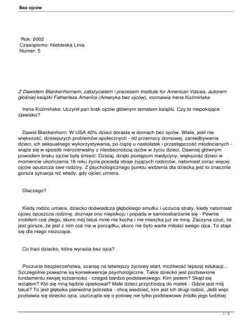 Bez ojców Rok: 2002 Czasopismo: Niebieska Linia Numer: 5 Z Dawidem Blankenhornem, założycielem i prezesem Institute for American Values, autorem głośniej książki Fatherless America (Ameryka bez ojców), rozmawia Irena Koźmińska Irena Koźmińska: Uczynił pan brak ojców głównym tematem książki. Czy to niepokojące zjawisko? Dawid Blankenhorn: W USA 40% dzieci dorasta w domach bez ojców. Wiele, jeśli nie większość, dzisiejszych problemów społecznych - od przemocy domowej, zaniedbywania dzieci, ich seksualnego wykorzystywania, po ciążę u nastolatek i przestępczość młodocianych wiąże się w sposób nierozerwalny z nieobecnością ojców w życiu dzieci. Dawniej głównym powodem braku ojców była śmierć. Dzisiaj, dzięki postępom medycyny, większość dzieci w momencie ukończenia 18 roku życia posiada oboje żyjących rodziców, natomiast coraz więcej ojców opuszcza swe rodziny. Z psychologicznego punktu widzenia dla dziecka jest to znacznie gorsza sytuacja niż wtedy, gdy ojciec umiera. Dlaczego? Kiedy rodzic umiera, dziecko doświadcza głębokiego smutku i uczucia straty, kiedy natomiast ojciec opuszcza rodzinę, doznaje ono niepokoju i popada w samooskarżanie się - Pewnie zrobiłem coś złego, skoro mój tatuś mnie nie kocha i nie mieszka już ze mną. Zaczyna czuć, że jest gorsze, że jest z nim coś nie w porządku, skoro nie było warte miłości swego ojca. To staje się dla niego niszczące. Co traci dziecko, które wyrasta bez ojca? Poczucie bezpieczeństwa, szansę na łatwiejszy życiowy start, możliwość lepszej edukacji... Szczególnie poważne są konsekwencje psychologiczne. Takie dziecko jest pozbawione fundamentu swojej tożsamości - czegoś bardzo podstawowego. Kim jestem? Skąd się wziąłem? Kto się mną będzie opiekował? Małe dzieci przychodzą do matek - Gdzie jest mój tatuś? To jest głęboka pierwotna potrzeba - chcą wiedzieć, kim jest ich drugi rodzic. Jeśli więc pozbawia się dziecko ojca, uszczupla się o połowę nie tylko podstawowe źródło jego ludzkiej 1/5 Bez ojców tożsamości, ale i źródło miłości. Dla dziewcząt ojciec jest pierwszym mężczyzną ich życia. Czy w przyszłości dziewczyna będzie czuła się dobrze i pewnie jako kobieta, w dużej mierze zależy od tego, czy ojciec obdarzył ją miłością. Córki bez ojców często podejmują wczesne kontakty seksualne, posiadają nieślubne dzieci i rozwodzą się, o ile w ogóle wyjdą za mąż. Dziewczyna taka szuka zbyt wcześnie męskiej aprobaty.... Szuka tego, czego nie dostała od ojca. A jak brak ojca wpływa na chłopców? Czy zjawisko homoseksualizmu może być z tym związane? Tak dość powszechnie uważało środowisko naukowe. Ale obecnie to temat tabu. Nikt nie może tego powiedzieć bez narażenia się na gwałtowny atak. Dla chłopca czymś najbardziej podstawowym jest pytanie - co to znaczy, że jestem rodzaju męskiego? Ojciec jest najważniejszą osobą, która pomaga synowi to zrozumieć. Jeśli go brakuje, chłopiec poszukuje odpowiedzi na to pytanie gdzie indziej - w grupie rówieśników i we wszystkich innych miejscach, nierzadko złych. Może wtedy wchłonąć to, co dziś jest postrzegane jako stereotyp męskości. Natomiast ojciec - poprzez własny przykład - może przekazać mu ideę, że bycie silnym mężczyzną oznacza opiekę nad słabszymi i ich obronę, branie pod uwagę potrzeb innych ludzi i traktowanie ich z szacunkiem. W swojej książce powołuje się Pan na badania polskiego antropologa, Bronisława Malinowskiego, nad ojcostwem jako czynnikiem tworzącym ludzką cywilizację. Malinowski dokonał świetnego odkrycia, które nazwał zasadą legitymizacji. Otóż wspólną cechą kultur jest wysiłek społeczeństwa, by rodzic uznawał własne potomstwo. Społeczeństwo przekazuje zasadę, że każde dziecko ma moralnie i legalnie odpowiedzialnego ojca. Że ojciec uznaje swoje dziecko i jest zobowiązany do pomocy matce w opiece nad nim i w jego wychowaniu. Nie tylko gwarantuje biologiczne przetrwanie potomstwa, ale zapewnia, że dziecko staje się osobą z określonym charakterem - przygotowuje je do życia. Czy matki nie uczą dzieci, jak żyć? Oczywiście też. Matki i ojcowie uzupełniają się. Kiedy pracują razem jak zgrany zespół, dziecko otrzymuje wszystko, czego potrzebuje. Jeśli jednak brakuje jednego z rodziców, dziecko na tym traci. Mniej wkładu ze strony ojca oznacza mniej matczynej opieki, bowiem samotna matka jest przepracowana, zestresowana i w dodatku może być zajęta szukaniem 2/5 Bez ojców partnera. Tak więc kiedy odchodzi ojciec, dziecko zaczyna odczuwać stratę matki. Jednym z powodów braku ojców w życiu dzieci są rozwody. Coraz częściej słyszy się głosy, że rozwody mają mnóstwo dobrych stron. To oczywiste bzdury, które mają poprawić samopoczucie dorosłych, ale absolutnie nie odzwierciedlają rzeczywistości. W wypadku większości rozwodów jest wiele konfliktów, goryczy i poczucia zdrady, obopólne oskarżanie się, nieumiejętność współpracy, powtórne małżeństwa albo wyjazd jednego z rodziców do innego miasta. To wszystko niszczy psychikę dziecka. Czuje się ono opuszczone i zdradzone. Wali się cały jego świat. Chłopcy odreagowują to bardzo często agresją, dziewczęta popadają w depresję i uważają, że nie są warte miłości. Dzieci często mają kłopoty w szkole, narkotyzują się, piją, trafiają do gangów lub sekt albo mają jeszcze inne problemy. Często ojcowie żyją pod jednym dachem z dziećmi, ale nie angażują się w ich życie... Jeżeli ojciec mieszka w domu, ale nie nawiązuje bliskich więzi ze swym dzieckiem, nie poświęca mu uwagi i nie okazuje miłości, konsekwencje psychologiczne dla dziecka są równie złe jak wtedy, gdy ojciec opuszcza dom. Czy ojców tworzy biologia czy kultura? Jedną rzeczą, którą możemy przewidzieć, kiedy rodzą się chłopcy, jest to, że będą płodzić dzieci. Jednak to