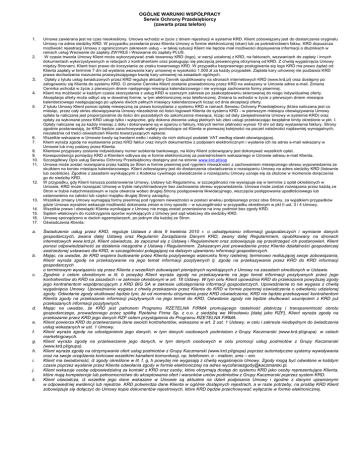 OGÓLNE WARUNKI WSPÓŁPRACY Serwis Ochrony Przedsiębiorcy (zawarta przez telefon) 1. 2. 3. 4. 5. 6. 7. 8. 9. 10. 11. 12. 13. 14. 15. 16. 17. a. b. c. d. e. f. g. h. i. j. k. Umowa zawierana jest na czas nieokreślony. Umowa wchodzi w życie z dniem rejestracji w systemie KRD. Klient zobowiązany jest do dostarczenia oryginału Umowy na adres siedziby KRD. W przypadku przesłania przez Klienta Umowy w formie elektronicznej (skan) lub za pośrednictwem faksu, KRD dopuszcza możliwość rejestracji Umowy z ograniczonym zakresem usług – w takiej sytuacji Klient nie będzie miał możliwości dopisywania informacji o dłużnikach w ramach usług Wezwanie do zapłaty ZWYKŁE i Wezwanie do zapłaty PLUS. W czasie trwania Umowy Klient może wykorzystywać znak towarowy KRD (logo), w wersji ustalonej z KRD, na fakturach, wezwaniach do zapłaty i innych dokumentach wykorzystywanych w relacjach z kontrahentami oraz posługując się pieczęcią prewencyjną otrzymaną od KRD. Z chwilą wygaśnięcia Umowy między Stronami, Klient traci prawo do korzystania ze znaku towarowego KRD. W przypadku bezprawnego posługiwania się logo KRD ma prawo żądać od Klienta zapłaty w terminie 7 dni od wysłania wezwania kary umownej w wysokości 1.000 zł za każdy przypadek. Zapłata kary umownej nie pozbawia KRD prawa dochodzenia roszczenia przewyższającego kwotę kary umownej na zasadach ogólnych. Opłaty z tytułu usług świadczonych przez KRD reguluje aktualny Cennik opublikowany na stronach internetowych KRD (www.krd.pl) oraz dostępny po zalogowaniu się Klienta do systemu KRD. O zmianie Cennika Klient zostanie powiadomiony przez KRD na wskazany w Umowie adres e-mail. Zmiana Cennika wchodzi w życie z pierwszym dniem następnego miesiąca kalendarzowego i nie wymaga zachowania formy pisemnej. Klient ma możliwość w każdym czasie skorzystania z usług KRD w szerszym zakresie po zaakceptowaniu skierowanej do niego indywidualnej oferty. Akceptacja oferty może odbyć się w dowolnej formie, w tym elektronicznej oraz telefonicznej. Zmiana ta wchodzi w życie z pierwszym dniem miesiąca kalendarzowego następującego po upływie dwóch pełnych miesięcy kalendarzowych licząc od dnia akceptacji oferty. Z tytułu Umowy Klient ponosi opłatę miesięczną za prawo korzystania z systemu KRD w ramach Serwisu Ochrony Przedsiębiorcy (która naliczana jest co miesiąc, przez cały okres obowiązywania Umowy niezależnie od ilości logowań Klienta do systemu KRD - w pierwszym miesiącu obowiązywania Umowy opłata ta naliczana jest proporcjonalnie do ilości dni pozostałych do zakończenia miesiąca, licząc od daty zarejestrowania Umowy w systemie KRD) oraz opłaty za wykonane przez KRD usługi tylko i wyłącznie, gdy dokona zlecenia usług płatnych lub zleci usługi przekraczając bezpłatne limity określone w pkt. I. Opłaty naliczane są za każdy miesiąc z dołu i dokonywane są w oparciu o faktury, których termin płatności wynosi 10 dni od daty wystawienia faktury. Strony zgodnie postanawiają, że KRD będzie zarachowywało wpłaty pochodzące od Klienta w pierwszej kolejności na poczet należności najdawniej wymagalnych, niezależnie od treści oświadczeń Klienta towarzyszących wpłacie. Wszelkie wskazane w Umowie kwoty są kwotami netto i należy do nich doliczyć podatek VAT według stawki obowiązującej. Klient wyraża zgodę na wystawianie przez KRD faktur oraz innych dokumentów z podpisem elektronicznym i wysłanie ich na adres e-mail wskazany w Umowie lub inny podany przez Klienta. Klientowi przypisany zostanie indywidulany numer subkonta bankowego, na który Klient zobowiązany jest dokonywać wszelkich opłat. Korespondencja pomiędzy KRD a Klientem odbywa się w formie elektronicznej za pośrednictwem wskazanego w Umowie adresu e-mail Klienta. Szczegółowy Opis usług Serwisu Ochrony Przedsiębiorcy dostępny jest na stronie www.krd.pl/sop Umowa może zostać rozwiązana przez każdą ze Stron w formie pisemnej pod rygorem nieważności z zachowaniem miesięcznego okresu wypowiedzenia ze skutkiem na koniec miesiąca kalendarzowego. Klient zobowiązany jest do dostarczenia oświadczenia o rozwiązaniu Umowy na adres siedziby KRD (listownie lub osobiście). Zgodnie z zasadami wynikającymi z Kodeksu cywilnego oświadczenie o rozwiązaniu Umowy uznaje się za złożone w momencie doręczenia go do siedziby KRD. W przypadku, gdy Klient narusza postanowienia Umowy, Ustawy lub Regulaminu, w szczególności nie wywiązuje się w terminie z opłat określonych w Umowie, KRD może rozwiązać Umowę w trybie natychmiastowym bez zachowania okresu wypowiedzenia. Umowa może zostać rozwiązana przez każdą ze Stron w trybie natychmiastowym w razie otwarcia wobec drugiej Strony postępowania likwidacyjnego, wszczęcia postępowania upadłościowego lub ustanowienia na całości lub części majątku drugiej Strony zarządcy. Wszelkie zmiany Umowy wymagają formy pisemnej pod rygorem nieważności w postaci aneksu podpisanego przez obie Strony, za wyjątkiem przypadków gdzie Umowa wyraźnie wskazuje możliwość dokonania zmian w inny sposób – w szczególności w przypadku określonym w pkt II ust. 3 i 4 Umowy. Wszelkie prawa i obowiązki Klienta wynikające z Umowy nie mogą zostać przeniesione na inny podmiot bez zgody KRD. Sądem właściwym do rozstrzygania sporów wynikających z Umowy jest sąd właściwy dla siedziby KRD. Umowę sporządzono w dwóch egzemplarzach, po jednym dla każdej ze Stron. Oświadczenia Klienta: Świadczenie usług przez KRD, reguluje Ustawa z dnia 9 kwietnia 2010 r. o udostępnianiu informacji gospodarczych i wymianie danych gospodarczych, zwana dalej Ustawą oraz Regulamin Zarządzania Danymi KRD, zwany dalej Regulaminem, opublikowany na stronach internetowych www.krd.pl. Klient oświadcza, że zapoznał się z Ustawą i Regulaminem oraz zobowiązuje się przestrzegać ich postanowień. Klient ponosi odpowiedzialność za działania niezgodne z