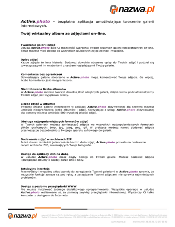 Active.photo – bezpłatna aplikacja umożliwiająca tworzenie galerii internetowych. Twój wirtualny album ze zdjęciami on-line. Tworzenie galerii zdjęć Usługa Active.photo daje Ci możliwość tworzenia Twoich własnych galerii fotograficznych on-line. Teraz możesz mieć dostęp do wszystkich ulubionych zdjęć zawsze i wszędzie. Opisy zdjęć Każde zdjęcie to inna historia. Dodawaj dowolnie obszerne opisy do Twoich zdjęć i podziel się towarzyszącymi im wrażeniami z osobami oglądającymi Twoją galerię. Komentarze bez ograniczeń Odwiedzający galerie stworzone w Active.photo mogą komentować Twoje zdjęcia. Co więcej, liczba komentarzy jest nieograniczona. Nielimitowana liczba albumów W Active.photo możesz tworzyć dowolną ilość odrębnych galerii, dzięki czemu podział tematyczny Twoich zdjęć jest wyjątkowo prosty. Liczba zdjęć w albumie Tworząc własne galerie internetowe w aplikacji Active.photo aktywowanej dla serwera możesz umieścić nieograniczoną liczbę albumów i zdjęć. Korzystając z usługi Active.photo aktywowanej dla domeny możesz umieścić 500 wysokiej jakości zdjęć. Obsługa najpopularniejszych formatów zdjęć W Twoich galeriach możesz zamieszczać zdjęcia we wszystkich najpopularniejszych formatach plików graficznych: bmp, jpg, jpeg, png, gif. W praktyce możesz nawet dodawać zdjęcia przenosząc je bezpośrednio z Twojego aparatu cyfrowego do galerii. Dodawanie zdjęć w archiwach ZIP Jeżeli chcesz zamieścić jednocześnie bardzo dużo zdjęć, Active.photo pozwala na dodawanie całych archiwów ZIP, zawierających Twoje fotografie. Dostęp do aplikacji 24h na dobę W usłudze Active.photo masz ciągły dostęp do Twoich galerii. Możesz dodawać zdjęcia i przeglądać albumy o każdej porze dnia i nocy. Intuicyjny interfejs Przemyślany i wygodny układ panelu do zarządzania Twoimi galeriami w Active.photo sprawia, że wszystkie funkcje zawsze są pod ręką, a zarządzanie Twoimi zdjęciami nie sprawia najmniejszych problemów. Dostęp z poziomu przeglądarki WWW Nie musisz instalować żadnego dodatkowego oprogramowania. Wszystkie operacje w usłudze Active.photo realizowane są za pomocą zwykłej przeglądarki internetowej. Wystarczy Ci tylko komputer z dostępem do Internetu. Edycja Tagów Tworzenie i edycja tagów dla Twoich zdjęć umożliwiają łatwe wyszukiwanie i przeglądanie zdjęć o interesującej Cię tematyce. Wybór motywów tematycznych oraz wersji kolorystycznych Zadbaj o odpowiedni styl Twojej galerii wybierając spośród motywów tematycznych. Stwórz odpowiednią atmosferę dla Twoich zdjęć i zrób wrażenie na znajomych profesjonalną oprawą graficzną. Korzystając z usługi Active.photo aktywowanej dla serwera możesz skorzystać z wielu motywów graficznych oraz wersji kolorystycznych, a także dowolnie personalizować swoją galerię. Aktywując Active.photo w domenie możesz tworzyć galerię w trzech różnych wersji kolorystycznych. Zaawansowane statystyki Obserwuj aktywność oglądających w Twojej galerii i sprawdzaj popularność poszczególnych fotografii dzięki zaawansowanym statystykom automatycznie generowanym przez aplikację Active.photo. Zaawansowane ustawienia obrazów w galerii W galerii Active.photo aktywowanej dla serwera serii Active możesz korzystać z zaawansowanych ustawień galerii pozwalających min. na modyfikacje obrazów bezpośrednio w galerii, ustawianie ochrony lub znaku wodnego na opublikowanych zdjęciach. Zabezpieczanie dostępu do galerii Stworzone galerie zdjęciowe możesz udostępnić wszystkim użytkownikom Internetu lub jedynie wybranym, poprzez ustawienie hasła dostępu. Linkowanie obrazów Umieszczenie hotlinków do obrazów internetowych jest niedozwolone. z Twojej galerii Active.photo Przechowywanie danych Powierzchnia dyskowa przeznaczona na dane umieszczane Active.photo jest wliczona w powierzchnię serwera. w na ramach innych usługi stronach dodatkowej Porównanie wersji: Active.photo dla domeny dla serwera Tworzenie galerii zdjęć + + Opisy zdjęć + + Komentarze bez ograniczeń + + Nielimitowana liczba albumów + + 500 zdjęć Nielimitowana Liczba zdjęć w albumie Obsługa najpopularniejszych formatów zdjęć bmp, jpg, jpeg, png, gif Dodawanie zdjęć w archiwach ZIP + + Dostęp do aplikacji 24h na dobę + + Intuicyjny interfejs + + Dostęp z poziomu przeglądarki WWW + + Edycja tagów + + Wybór wersji kolorystycznych + + Wybór motywów tematycznych - + Modyfikacja obrazów w galerii - + Obsługa kanałów RSS - + Ochrona obrazów - +