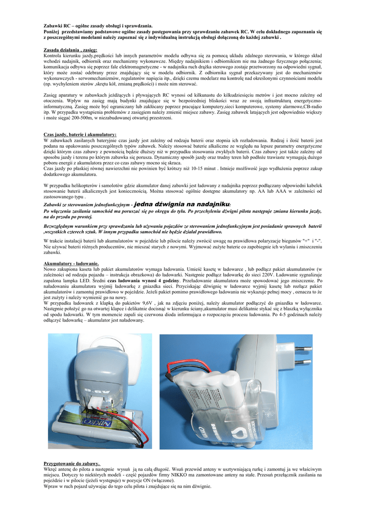 Zabawki RC – ogólne zasady obsługi i sprawdzania. Poniżej przedstawiamy podstawowe ogólne zasady postępowania przy sprawdzaniu zabawek RC. W celu dokładnego zapoznania się z poszczególnymi modelami należy zapoznać się z indywidualną instrukcją obsługi dołączoną do każdej zabawki . Zasada działania , zasięg: Kontrola kierunku jazdy,prędkości lub innych parametrów modelu odbywa się za pomocą układu zdalnego sterowania, w którego skład wchodzi nadajnik, odbiornik oraz mechanizmy wykonawcze. Między nadajnikiem i odbiornikiem nie ma żadnego fizycznego połączenia; komunikacja odbywa się poprzez fale elektromagnetyczne - w nadajniku ruch drążka sterowego zostaje przetworzony na odpowiedni sygnał, który może zostać odebrany przez znajdujący się w modelu odbiornik. Z odbiornika sygnał przekazywany jest do mechanizmów wykonawczych - serwomechanizmów, regulatorów napięcia itp., dzięki czemu modelarz ma kontrolę nad określonymi czynnościami modelu (np. wychyleniem sterów ,skrętu kół, zmianą prędkości) i może nim sterować. Zasięg aparatury w zabawkach jeżdżących i pływających RC wynosi od kilkunastu do kilkudziesięciu metrów i jest mocno zależny od otoczenia. Wpływ na zasięg mają budynki znajdujące się w bezpośredniej bliskości wraz ze swoją infrastrukturą energetycznoinformatyczną. Zasięg może być ograniczany lub zakłócany poprzez pracujące komputery,sieci komputerowe, systemy alarmowe,CB-radio itp. W przypadku wystąpienia problemów z zasięgiem należy zmienić miejsce zabawy. Zasięg zabawek latających jest odpowiednio większy i może sięgać 200-500m, w niezabudowanej otwartej przestrzeni. Czas jazdy, baterie i akumulatory: W zabawkach zasilanych bateryjnie czas jazdy jest zależny od rodzaju baterii oraz stopnia ich rozładowania. Rodzaj i ilość baterii jest podana na opakowaniu poszczególnych typów zabawek. Należy stosować baterie alkaliczne ze względu na lepsze parametry energetyczne dzięki którym czas zabawy z pewnością będzie dłuższy niż w przypadku stosowania zwykłych baterii. Czas zabawy jest także zależny od sposobu jazdy i terenu po którym zabawka się porusza. Dynamiczny sposób jazdy oraz trudny teren lub podłoże trawiaste wymagają dużego poboru energii z akumulatora przez co czas zabawy mocno się skraca. Czas jazdy po płaskiej równej nawierzchni nie powinien być krótszy niż 10-15 minut . Istnieje możliwość jego wydłużenia poprzez zakup dodatkowego akumulatora. W przypadku helikopterów i samolotów gdzie akumulator danej zabawki jest ładowany z nadajnika poprzez podłączany odpowiedni kabelek stosowanie baterii alkalicznych jest koniecznością. Można stosować ogólnie dostępne akumulatory np. AA lub AAA w zależności od zastosowanego typu . Zabawki ze sterowaniem jednofunkcyjnym - jedna dźwignia na nadajniku: Po włączeniu zasilania samochód ma poruszać się po okręgu do tyłu. Po przechyleniu dźwigni pilota następuje zmiana kierunku jazdy, na do przodu po prostej. Bezwzględnym warunkiem przy sprawdzaniu lub używaniu pojazdów ze sterowaniem jednofunkcyjnym jest posiadanie sprawnych baterii ,wszystkich czterech sztuk. W innym przypadku samochód nie będzie działał prawidłowo. W trakcie instalacji baterii lub akumulatorów w pojeździe lub pilocie należy zwrócić uwagę na prawidłowa polaryzacje biegunów "+" i "-". Nie używać baterii różnych producentów, nie mieszać starych z nowymi. Wyjmować zużyte baterie co zapobiegnie ich wylaniu i zniszczeniu zabawki. Akumulatory - ładowanie. Nowo zakupiona kaseta lub pakiet akumulatorów wymaga ładowania. Umieść kasetę w ładowarce , lub podłącz pakiet akumulatorów (w zależności od rodzaju pojazdu – instrukcja obrazkowa) do ładowarki. Następnie podłącz ładowarkę do sieci 220V. Ładowanie sygnalizuje zapalona lampka LED. Średni czas ładowania wynosi 4 godziny. Przeładowanie akumulatora może spowodować jego zniszczenie. Po naładowaniu akumulatora wyjmij ładowarkę z gniazdka sieci. Przyciskając dźwignię w ładowarce wyjmij kasetę lub rozłącz pakiet akumulatorów i zamontuj prawidłowo w pojeździe. Jeżeli pakiet pomimo prawidłowego ładowania nie wykazuje pełnej mocy , oznacza to że jest zużyty i należy wymienić go na nowy. W przypadku ładowarek z klapką do pakietów 9,6V , jak na zdjęciu poniżej, należy akumulator podłączyć do gniazdka w ładowarce. Następnie położyć go na otwartej klapce i delikatnie docisnąć w kierunku ściany,akumulator musi delikatnie stykać się z blaszką wyłącznika od spodu ładowarki. W tym momencie zapali się czerwona dioda informująca o rozpoczęciu procesu ładowania. Po 4-5 godzinach należy odłączyć ładowarkę – akumulator jest naładowany. Przygotowanie do zabawy. Wkręć antenę do pilota a następnie wysuń ją na całą długość. Wsuń przewód anteny w usztywniającą rurkę i zamontuj ja we właściwym miejscu. Dotyczy to niektórych modeli - część pojazdów firmy NIKKO ma zamontowane anteny na stałe. Przesuń przełącznik zasilania na pojeździe i w pilocie (jeżeli występuje) w pozycje ON (włączone). Wpraw w ruch pojazd używając do tego celu pilota i znajdujące się na nim dźwignie. Sprawdź ustawienie kół przednich podczas jazdy na wprost ,poprzez regulację dźwigni trymera znajdującego się pod spodem pojazdu na wysokości przedniej osi. Przesuwanie dźwigni koryguje tendencje „ściągania” w lewo lub prawo. W przypadku systemu sterowania ze zmiennymi kanałami ABC należy ustawić ten sam kanał na nadajniku co na zabawce. System ten przy ustawieniach jak niżej daje możliwość zabawy sześcioma zabawkami w tym samym czasie, na przykład wyścigi samochodowe. Zabawki pływające. W zależności od rodzaju zasilania ,bateryjne lub akumulatorowe, wskazówki jak wyżej . Należy pamiętać o wylewaniu gromadzącej się wody wewnątrz kadłuba poprzez otwory z gumowymi za