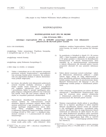 29.4.2008 PL Dziennik Urzędowy Unii Europejskiej L 115/1 I (Akty przyjęte na mocy Traktatów WE/Euratom, których publikacja jest obowiązkowa) ROZPORZĄDZENIA ROZPORZĄDZENIE RADY (WE) NR 380/2008 z dnia 18 kwietnia 2008 r. zmieniające rozporządzenie (WE) nr 1030/2002 ustanawiające jednolity wzór dokumentów pobytowych dla obywateli państw trzecich dodatkowo zwiększa bezpieczeństwo. Należy przeanalizować kwestię, czy zasada ta nie powinna być obowiązkowa. RADA UNII EUROPEJSKIEJ, uwzględniając Traktat ustanawiający Wspólnotę Europejską, w szczególności jego art. 63 ust. 3 lit. a), (5) Na posiedzeniu w Salonikach w dniach 19 i 20 czerwca 2003 r. Rada Europejska podkreśliła, że potrzebne jest w UE spójne podejście w odniesieniu do identyfikatorów biometrycznych lub danych biometrycznych, które wiązałoby się ze zharmonizowanymi rozwiązaniami w zakresie dokumentów dla obywateli państw trzecich, paszportów obywateli UE oraz systemów informacyjnych. (6) Należy ułatwić stosowanie nowych technologii – takich, jak elektroniczna administracja publiczna i podpis cyfrowy dający dostęp do usług elektronicznych – przez umożliwienie państwom członkowskim stosowania nośnika pamięci, który służy do przechowywania identyfikatorów biometrycznych, lub służącego w tym celu dodatkowego nośnika pamięci w dokumentach pobytowych. (7) Celem niniejszego rozporządzenia jest jedynie określenie zabezpieczeń i identyfikatorów biometrycznych, które mają być stosowane przez państwa członkowskie w dokumentach pobytowych o jednolitym wzorze przeznaczonych dla obywateli państw trzecich. (8) Niniejsze rozporządzenie określa jedynie te specyfikacje, które nie są niejawne; specyfikacje te należy uzupełnić dalszymi specyfikacjami, których można nie ujawniać w celu zapobiegania podrabianiu i przerabianiu dokumentów; specyfikacje takie nie mogą obejmować danych osobowych ani odniesienia do takich danych. Do przyjęcia takich dodatkowych specyfikacji należy upoważnić Komisję, którą wspierać powinien komitet utworzony na mocy art. 6 rozporządzenia Rady (WE) nr 1683/95 z dnia 29 maja 1995 r. ustanawiającego jednolity formularz wizowy (2). uwzględniając wniosek Komisji, uwzględniając opinię Parlamentu Europejskiego (1), a także mając na uwadze, co następuje: (1) (2) (3) (4) Traktat z Amsterdamu ma na celu stopniowe utworzenie przestrzeni wolności, bezpieczeństwa i sprawiedliwości oraz przyznaje Komisji prawo inicjatywy, aby podejmowała ona odpowiednie działania w zakresie zharmonizowanej polityki imigracyjnej. Jest istotne, aby jednolity wzór dokumentów pobytowych zawierał wszystkie niezbędne informacje i spełniał bardzo wysokie normy techniczne, w szczególności pod względem zabezpieczeń przed podrabianiem i przerabianiem. Będzie to sprzyjać zapobieganiu nielegalnej imigracji i nielegalnemu pobytowi oraz zwalczaniu tych zjawisk. Wzór taki musi również nadawać się do użytku we wszystkich państwach członkowskich. Wprowadzenie identyfikatorów biometrycznych jest ważnym krokiem ku wykorzystywaniu nowych elementów dających pewniejszy związek między dokumentem pobytowym a jego posiadaczem, co znacznie pomaga zapobiegać nieuprawnionemu użyciu dokumentu. Należy uwzględnić wymogi określone w dokumencie Organizacji Międzynarodowego Lotnictwa Cywilnego (ICAO) nr 9303 część 3 o oficjalnych dokumentach rozmiaru 1 i 2 przeznaczonych do odczytu maszynowego. Ponadto zdecydowana większość państw członkowskich stosuje zasadę „jedna osoba – jeden dokument”, która (1) Opinia z dnia 20 czerwca 2007 r. (dotychczas nieopublikowana w Dzienniku Urzędowym). (2) Dz.U. L 164 z 14.7.1995, s. 1. Rozporządzenie ostatnio zmienione rozporządzeniem (WE) nr 1791/2006 (Dz.U. L 363 z 20.12.2006, s. 1). L 115/2 (9) (10) PL Dziennik Urzędowy Unii Europejskiej Do danych osobowych, które podlegają przetwarzaniu w związku z jednolitym wzorem dokumentów pobytowych, zastosowanie ma dyrektywa 95/46/WE Parlamentu Europejskiego i Rady z dnia 24 października 1995 r. w sprawie ochrony osób fizycznych w zakresie przetwarzania danych osobowych i swobodnego przepływu tych danych (1). Należy zapewnić, aby w dokumentach pobytowych według jednolitego wzoru nie były umieszczane żadne inne informacje, chyba że są one przewidziane w rozporządzeniu Rady (WE) nr 1030/2002 (2) lub załączniku do niego albo zostały umieszczone w danym dokumencie podróży. Zgodnie z zasadą proporcjonalności konieczne i celowe jest z uwagi na zasadniczy cel, którym jest wprowadzenie identyfikatorów biometrycznych w formatach interoperacyjnych, aby ustanowić przepisy obowiązujące wszystkie państwa członkowskie stosujące konwencję z Schengen. Niniejsze rozporządzenie nie wykracza poza to, co jest konieczne do osiągnięcia założonych celów zgodnie z art. 5 akapit trzeci Traktatu. 29.4.2008 uczestniczenia w przyjęciu i stosowaniu niniejszego rozporządzenia. (14) Zgodnie z art. 3 Protokołu w sprawie stanowiska Zjednoczonego Królestwa i Irlandii, który załączony jest do Traktatu o Unii Europejskiej i do Traktatu ustanawiającego Wspólnotę Europejską, Irlandia zgłosiła, listem z dnia 19 grudnia 2003 r., swój zamiar uczestniczenia w przyjęciu i stosowaniu niniejszego rozporządzenia. (15) W odniesieniu do Szwajcarii niniejsze rozporządzenie stanowi rozwinięcie tych przepisów prawnego dorobku Schengen – w rozumieniu Umowy między Unią Europejską, Wspólnotą Europejską a Konfederacją Szwajcarską dotyczącej włączenia Konfederacji Szwajcarskiej we wprowadzanie w życie, stosowanie i rozwój dorobku Schengen – które wchodzą w zakres art. 1 lit. c) decyzji Rady 1999/437/WE w związku z art. 4 ust. 1 decyzji 2004/860/WE (5), PRZYJMUJE NINIEJSZE ROZPORZĄDZENIE: Artykuł 1 (11) Zgodnie z art. 1 i 2 Protokołu w sprawie stanowiska Danii, który załączony jest do Traktatu o Unii Europejskiej oraz do Traktat