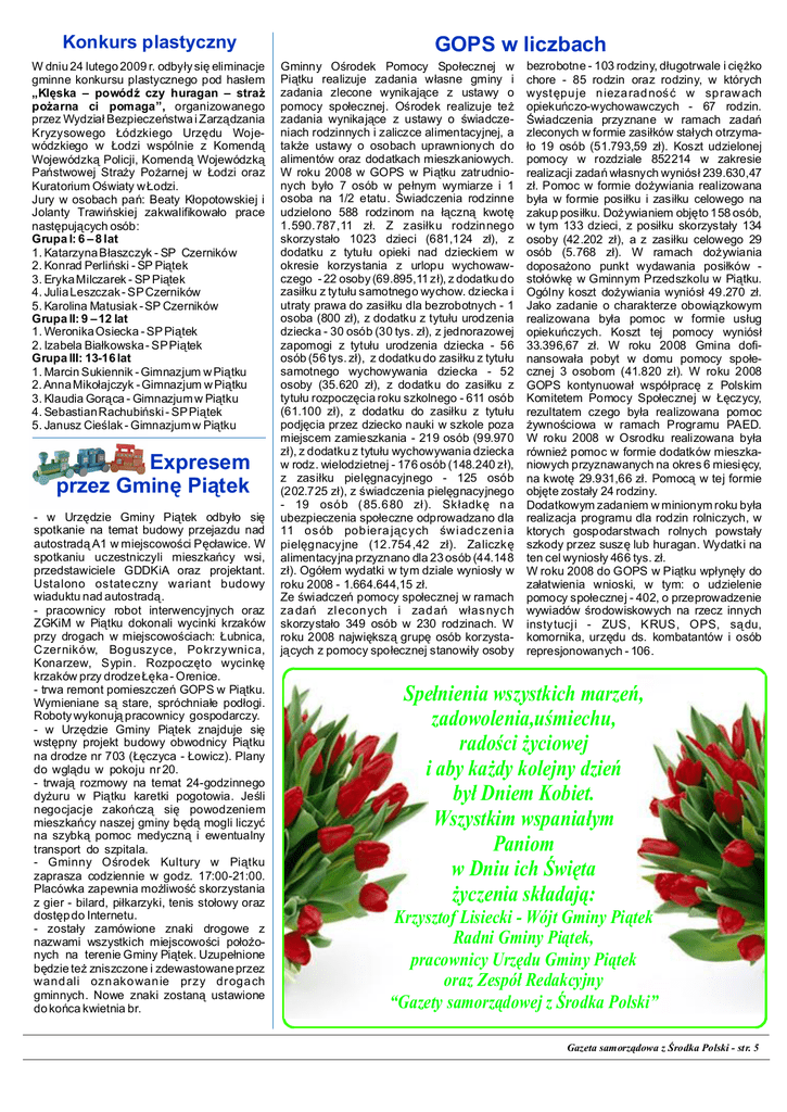 Konkurs plastyczny W dniu 24 lutego 2009 r. odby y si eliminacje gminne konkursu plastycznego pod has em „Kl ska – powód czy huragan – stra po arna ci pomaga”, organizowanego przez Wydzia Bezpiecze stwa i Zarz dzania Kryzysowego ódzkiego Urz du Wojewódzkiego w odzi wspólnie z Komend Wojewódzk Policji, Komend Wojewódzk Pa stwowej Stra y Po arnej w odzi oraz Kuratorium O wiaty w odzi. Jury w osobach pa : Beaty K opotowskiej i Jolanty Trawi skiej zakwalifikowa o prace nast puj cych osób: Grupa I: 6 – 8 lat 1. Katarzyna B aszczyk - SP Czerników 2. Konrad Perli ski - SP Pi tek 3. Eryka Milczarek - SP Pi tek 4. Julia Leszczak - SP Czerników 5. Karolina Matusiak - SP Czerników Grupa II: 9 – 12 lat 1. Weronika Osiecka - SP Pi tek 2. Izabela Bia kowska - SP Pi tek Grupa III: 13-16 lat 1. Marcin Sukiennik - Gimnazjum w Pi tku 2. Anna Miko ajczyk - Gimnazjum w Pi tku 3. Klaudia Gor ca - Gimnazjum w Pi tku 4. SebastianRachubi ski - SP Pi tek 5. Janusz Cie lak - Gimnazjum w Pi tku Expresem przez Gmin Pi tek - w Urz dzie Gminy Pi tek odby o si spotkanie na temat budowy przejazdu nad autostrad A1 w miejscowo ci P awice. W spotkaniu uczestniczyli mieszka cy wsi, przedstawiciele GDDKiA oraz projektant. Ustalono ostateczny wariant budowy wiaduktu nad autostrad . - pracownicy robot interwencyjnych oraz ZGKiM w Pi tku dokonali wycinki krzaków przy drogach w miejscowo ciach: ubnica, Czerników, Boguszyce, Po krzywnica, Konarzew, Sypin. Rozpocz to wycink krzaków przy drodze ka - Orenice. - trwa remont pomieszcze GOPS w Pi tku. Wymieniane s stare, spróchnia e pod ogi. Roboty wykonuj pracownicy gospodarczy. - w Urz dzie Gminy Pi tek znajduje si wst pny projekt budowy obwodnicy Pi tku na drodze nr 703 ( czyca - owicz). Plany do wgl du w pokoju nr 20. - trwaj rozmowy na temat 24-godzinnego dy uru w Pi tku karetki pogotowia. Je li negocjacje zako cz si powodzeniem mieszka cy naszej gminy b mogli liczy na szybk pomoc medyczn i ewentualny transport do szpitala. - Gminny O rodek Kultury w Pi tku zaprasza codziennie w godz. 17:00-21:00. Placówka zapewnia mo liwo skorzystania z gier - bilard, pi karzyki, tenis sto owy oraz dost p do Internetu. - zosta y zamówione znaki drogowe z nazwami wszystkich miejscowo ci po onych na terenie Gminy Pi tek. Uzupe nione dzie te zniszczone i zdewastowane przez wand ali ozn ako wan ie przy dr oga ch gminnych. Nowe znaki zostan ustawione do ko ca kwietnia br. GOPS w liczbach Gminny O rodek Pomocy Spo ecznej w Pi tku realizuje zadania w asne gminy i zadania zlecone wynikaj ce z ustawy o pomocy spo ecznej. O rodek realizuje te zadania wynikaj ce z ustawy o wiadczeniach rodzinnych i zaliczce alimentacyjnej, a tak e ustawy o osobach uprawnionych do alimentów oraz dodatkach mieszkaniowych. W roku 2008 w GOPS w Pi tku zatrudnionych by o 7 osób w pe nym wymiarze i 1 osoba na 1/2 etatu. wiadczenia rodzinne udzielono 588 rodzinom na czn kwot 1.590.787,11 z . Z zasi ku rodzinnego skorzysta o 1023 dzieci (681,124 z ), z dodatku z tytu u opieki nad dzieckiem w okresie korzystania z urlopu wychowawczego - 22 osoby (69.895,11 z ), z dodatku do zasi ku z tytu u samotnego wychow. dziecka i utraty prawa do zasi ku dla bezrobotnych - 1 osoba (800 z ), z dodatku z tytu u urodzenia dziecka - 30 osób (30 tys. z ), z jednorazowej zapomogi z tytu u urodzenia dziecka - 56 osób (56 tys. z ), z dodatku do zasi ku z tytu u samotnego wychowywania dziecka - 52 osoby (35.620 z ), z dodatku do zasi ku z tytu u rozpocz cia roku szkolnego - 611 osób (61.100 z ), z dodatku do zasi ku z tytu u podj cia przez dziecko nauki w szkole poza miejscem zamieszkania - 219 osób (99.970 ), z dodatku z tytu u wychowywania dziecka w rodz. wielodzietnej - 176 osób (148.240 z ), z zasi ku piel gnacyjnego - 125 osób (202.725 z ), z wiadczenia piel gnacyjnego - 19 osób ( 85.6 80 z ). Sk adk na ubezpieczenia spo eczne odprowadzano dla 11 os ób pob iera j c ych w iadc zen ia piel gnacyjne (12.754,42 z ). Zaliczk alimentacyjna przyznano dla 23 osób (44.148 ). Ogó em wydatki w tym dziale wynios y w roku 2008 - 1.664.644,15 z . Ze wiadcze pomocy spo ecznej w ramach za da zl econ ych i zad a as nyc h skorzysta o 349 osób w 230 rodzinach. W roku 2008 najwi ksz grup osób korzystacych z pomocy spo ecznej stanowi y osoby bezrobotne - 103 rodziny, d ugotrwale i ci ko chore - 85 rodzin oraz rodziny, w których wyst pu je n ieza rad no w sp raw ach opieku czo-wychowawczych - 67 rodzin. wiadczenia przyznane w ramach zada zleconych w formie zasi ków sta ych otrzymao 19 osób (51.793,59 z ). Koszt udzielonej pomocy w rozdziale 852214 w zakresie realizacji zada asnych wyniós 239.630,47 . Pomoc w formie do ywiania realizowana by a w formie posi ku i zasi ku celowego na zakup posi ku. Do ywianiem obj to 158 osób, w tym 133 dzieci, z posi ku skorzysta y 134 osoby (42.202 z ), a z zasi ku celowego 29 osób (5.768 z ). W ramach do ywiania doposa ono punkt wydawania posi ków sto ówk w Gminnym Przedszkolu w Pi tku. Ogólny koszt do ywiania wyniós 49.270 z . Jako zadanie o charakterze obowi zkowym realizowana by a pomoc w formie us ug opieku czych. Koszt tej pomocy wyniós 33.396,67 z . W roku 2008 Gmina dofinansowa a pobyt w domu pomocy spo ecznej 3 osobom (41.820 z ). W roku 2008 GOPS kontynuowa wspó prac z Polskim Komitetem Pomocy Spo ecznej w czycy, rezultatem czego by a realizowana pomoc ywno ciowa w ramach Programu PAED. W roku 2008 w Osrodku realizowana by a równie pomoc w formie dodatków mieszkaniowych przyznawanych na okres 6 miesi cy, na kwot 29.931,66 z . Pomoc w tej formie obj te zosta y 24 rodziny. Dodatkowym zadaniem w minionym roku by a realizacja programu dla rodzin rolniczych, w ktorych gospodarstwach rolnych powsta y szkody przez susz lub huragan. Wydatki na ten cel wynios y 466 tys. z . W roku 2008 do GOPS w Pi tku wp yn y do za atwienia wnioski, w tym: o udzielenie pomocy spo ecznej - 402, o przeprowadzenie wywiadów rodowiskowych na rzecz innych instytucji - ZUS, K RUS, OPS, s du, komornika, 