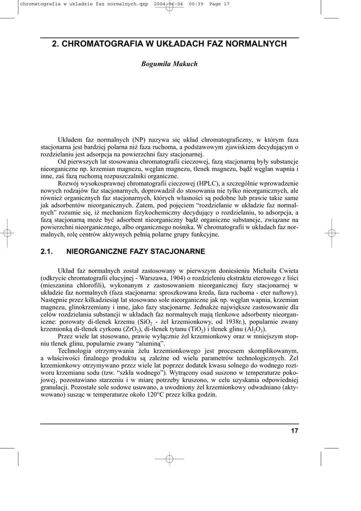 chromatografia w ukladzie faz normalnych.qxp 2004-06-04 00:39 Page 17 2. CHROMATOGRAFIA W UK£ADACH FAZ NORMALNYCH Bogumi³a Makuch Uk³adem faz normalnych (NP) nazywa siê uk³ad chromatograficzny, w którym faza stacjonarna jest bardziej polarna ni¿ faza ruchoma, a podstawowym zjawiskiem decyduj¹cym o rozdzielaniu jest adsorpcja na powierzchni fazy stacjonarnej. Od pierwszych lat stosowania chromatografii cieczowej, faz¹ stacjonarn¹ by³y substancje nieorganiczne np. krzemian magnezu, wêglan magnezu, tlenek magnezu, b¹dŸ wêglan wapnia i inne, zaœ faz¹ ruchom¹ rozpuszczalniki organiczne. Rozwój wysokosprawnej chromatografii cieczowej (HPLC), a szczególnie wprowadzenie nowych rodzajów faz stacjonarnych, doprowadzi³ do stosowania nie tylko nieorganicznych, ale równie¿ organicznych faz stacjonarnych, których w³asnoœci s¹ podobne lub prawie takie same jak adsorbentów nieorganicznych. Zatem, pod pojêciem “rozdzielanie w uk³adzie faz normalnych” rozumie siê, i¿ mechanizm fizykochemiczny decyduj¹cy o rozdzielaniu, to adsorpcja, a faz¹ stacjonarn¹ mo¿e byæ adsorbent nieorganiczny b¹dŸ organiczne substancje, zwi¹zane na powierzchni nieorganicznego, albo organicznego noœnika. W chromatografii w uk³adach faz normalnych, rolê centrów aktywnych pe³ni¹ polarne grupy funkcyjne. 2.1. NIEORGANICZNE FAZY STACJONARNE Uk³ad faz normalnych zosta³ zastosowany w pierwszym doniesieniu Michai³a Cwieta (odkrycie chromatografii elucyjnej - Warszawa, 1904) o rozdzieleniu ekstraktu eterowego z liœci (mieszanina chlorofili), wykonanym z zastosowaniem nieorganicznej fazy stacjonarnej w uk³adzie faz normalnych (faza stacjonarna: sproszkowana kreda, faza ruchoma - eter naftowy). Nastêpnie przez kilkadziesi¹t lat stosowano sole nieorganiczne jak np. wêglan wapnia, krzemian magnezu, glinokrzemiany i inne, jako fazy stacjonarne. Jednak¿e najwiêksze zastosowanie dla celów rozdzielania substancji w uk³adach faz normalnych maj¹ tlenkowe adsorbenty nieorganiczne: porowaty di-tlenek krzemu (SiO2 - ¿el krzemionkowy, od 1938r.), popularnie zwany krzemionk¹ di-tlenek cyrkonu (ZrO2), di-tlenek tytanu (TiO2) i tlenek glinu (Al2O3). Przez wiele lat stosowano, prawie wy³¹cznie ¿el krzemionkowy oraz w mniejszym stopniu tlenek glinu, popularnie zwany “alumin¹”. Technologia otrzymywania ¿elu krzemionkowego jest procesem skomplikowanym, a w³aœciwoœci finalnego produktu s¹ zale¿ne od wielu parametrów technologicznych. ¯el krzemionkowy otrzymywano przez wiele lat poprzez dodatek kwasu solnego do wodnego roztworu krzemianu sodu (tzw. “szk³a wodnego”). Wytr¹cony osad suszono w temperaturze pokojowej, pozostawiano starzeniu i w miarê potrzeby kruszono, w celu uzyskania odpowiedniej granulacji. Pozosta³e sole sodowe usuwano, a uwodniony ¿el krzemionkowy odwadniano (aktywowano) susz¹c w temperaturze oko³o 120°C przez kilka godzin. 17 chromatografia w ukladzie faz normalnych.qxp 2004-06-04 00:39 Page 18 Obecnie do otrzymywania tlenkowych adsorbentów stosuje siê procedurê sol-gel polegaj¹c¹ na kontrolowanej hydrolizie alkoholanów odpowiednich metali tj Al(O-iPr)3, Si (O-Et)4 , Zr(O-iPr)4, Ti(O-iPr)4, gdzie Et - grupa etylowa, iPr - grupa izopropylowa. Schemat procesu przedstawiono poni¿ej: Si(OEt)4 + EtOH + NH OH → SiO2 . H20 Ti(O-iPr)4 + glicerol + i-propanol → Ti O2 Przebieg tego procesu jest dobrze poznany, dok³adnie okreœlono wp³yw pH, temperaturê i kinetykê. Produkt koñcowy mo¿na modyfikowaæ dodatkiem ró¿nych substancji np. dodatek kwasu winowego pozwala uzyskaæ ziarna o kszta³cie rurki lub kszta³cie robaczkowym. Przydatnoœæ chromatograficzna tlenków glinu, krzemu, tytanu i cyrkonu jest charakteryzowana obecnoœci¹ grup hydroksylowych (M-OH), gdy M to Si, Al, Ti, Zr i grup metal-tlenmetal (M-O-M) na powierzchni sorbcyjnej. Ca³kowita zawartoœæ wymienionych powy¿ej grup, ich dostêpnoœæ dla rozdzielanych substancji i u¿ytecznoœæ dla modyfikacji powierzchni zale¿y od pochodzenia sorbentu, traktowania chemicznego i termicznego. Na strukturê tlenku metalu, a w dalszej kolejnoœci na charakter kwasowo-zasadowy ma du¿y wp³yw natura i zawartoœæ metali alkalicznych oraz temperatura kalcynacji. ¯el krzemionkowy jest nadal doœæ powszechnie stosowany w roli fazy stacjonarnej w chromatografii cieczowej. Wynika to z niskiej ceny w zwi¹zku z powszechn¹ obecnoœci¹ krzemu i jego zwi¹zków w przyrodzie oraz bardzo bogatego zbioru przyk³adów zastosowañ. Tlenki tytanu, czy cyrkonu s¹ znacznie bardziej kosztowne. Nale¿y jednak zaznaczyæ, ¿e w wielu przypadkach stosuj¹c tlenek glinu lub cyrkonu, uzyskuje siê znacznie lepsze wyniki rozdzielania i wiêksz¹ odpornoœæ na podwy¿szone pH eluentu, ni¿ w przypadku stosowania ¿elu krzemionkowego. O w³aœciwoœciach adsorbcyjnych ¿elu krzemionkowego i w du¿ym stopniu, innych wymienionych tlenków, decyduje rodzaj i iloœæ grup hydroksylowych na powierzchni i ich dostêpnoœæ. Szczególnie do grup OH adsorbuj¹ siê cz¹steczki rozdzielanych substancji. W przypadku adsorbentów o charakterze tlenków metali, te ostatnie te¿ odgrywaj¹ rolê jako centra adsorbcji. Wed³ug Snydera i innych autorów, na powierzchni ¿elu krzemionkowego wyró¿nia siê trzy rodzaje miejsc aktywnych wynikaj¹cych z obecnoœci grup hydroksylowych tj. wolne (a), bliŸniacze (b) i tzw. zaasocjowane (c) grupy hydroksylowe: W chromatografii najbardziej po¿¹dana jest obecnoœæ grup typu b i c. Wolne grupy hydroksylowe zachowuj¹ siê jak bardzo s³aby kwas (ich pKa = 7,1), natomiast grupy bliŸniacze s¹ mniej kwaœne ni¿ grupy hydroksylowe i st¹d ich wiêksza przydatnoœæ do rozdzielania zwi¹zków o charakterze zasadowym. Uwa¿a siê, ¿e ³¹czna liczba grup hydroksylowych powinna wynosiæ oko³o 8 µmoli/m2. 18 chromatografia w ukladzie faz normalnych.qxp 2004-06-04 00:39 Page 19 Istotny wp³yw na w³aœciwoœci powierzchni ¿elu krzemionkowego (i innych tlenkowych adsorbentów), odgry