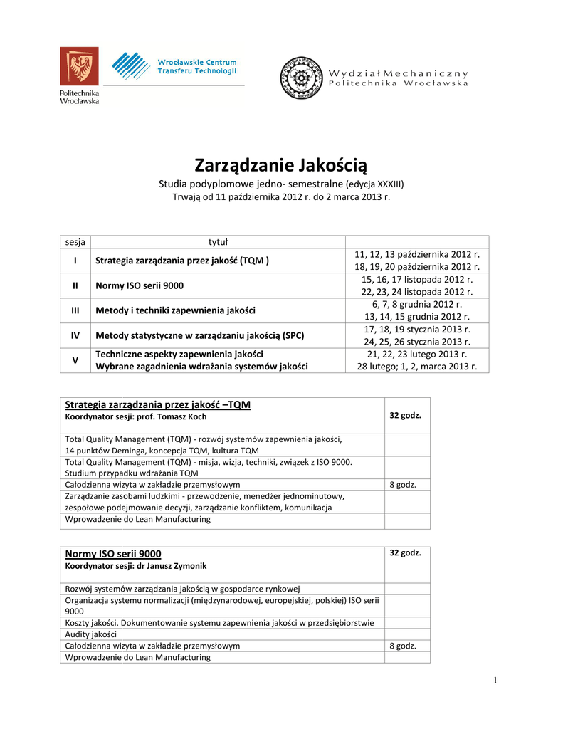 Zarządzanie Jakością Studia podyplomowe jedno- semestralne (edycja XXXIII) Trwają od 11 października 2012 r. do 2 marca 2013 r. sesja tytuł I Strategia zarządzania przez jakość (TQM ) II Normy ISO serii 9000 III Metody i techniki zapewnienia jakości IV Metody statystyczne w zarządzaniu jakością (SPC) V Techniczne aspekty zapewnienia jakości Wybrane zagadnienia wdrażania systemów jakości 11, 12, 13 października 2012 r. 18, 19, 20 października 2012 r. 15, 16, 17 listopada 2012 r. 22, 23, 24 listopada 2012 r. 6, 7, 8 grudnia 2012 r. 13, 14, 15 grudnia 2012 r. 17, 18, 19 stycznia 2013 r. 24, 25, 26 stycznia 2013 r. 21, 22, 23 lutego 2013 r. 28 lutego; 1, 2, marca 2013 r. Strategia zarządzania przez jakość –TQM Koordynator sesji: prof. Tomasz Koch Total Quality Management (TQM) - rozwój systemów zapewnienia jakości, 14 punktów Deminga, koncepcja TQM, kultura TQM Total Quality Management (TQM) - misja, wizja, techniki, związek z ISO 9000. Studium przypadku wdrażania TQM Całodzienna wizyta w zakładzie przemysłowym Zarządzanie zasobami ludzkimi - przewodzenie, menedżer jednominutowy, zespołowe podejmowanie decyzji, zarządzanie konfliktem, komunikacja Wprowadzenie do Lean Manufacturing Normy ISO serii 9000 32 godz. 8 godz. 32 godz. Koordynator sesji: dr Janusz Zymonik Rozwój systemów zarządzania jakością w gospodarce rynkowej Organizacja systemu normalizacji (międzynarodowej, europejskiej, polskiej) ISO serii 9000 Koszty jakości. Dokumentowanie systemu zapewnienia jakości w przedsiębiorstwie Audity jakości Całodzienna wizyta w zakładzie przemysłowym Wprowadzenie do Lean Manufacturing 8 godz. 1 Metody i techniki zapewnienia jakości Koordynator sesji: dr inż. Adam Jednoróg 32 godz. Failure Mode and Effects Analysis (FMEA) Quality Function Deployment (QFD) Design of Experiments (DOE) Poka-yoke Współbieżne projektowanie (Simultaneous Engineering) Planowanie jakości w fazie projektowania Całodzienna wizyta w zakładzie przemysłowym Planowanie jakości w fazie opracowania technologii i wytwarzania Narzędzia pracy zespołowej w rozwiązywaniu problemów 8 godz. Metody statystyczne w zarządzaniu jakością Koordynator sesji: dr inż. Adam Jednoróg Zmienność procesu Statystyka opisowa Karty kontrolne Karty kontrolne dla zmiennych Karty oparte na ocenach alternatywnych Interpretacja kart kontrolnych Karty specjalne Wskaźniki zdolności Karty oparte o sekwencyjne procedury statystyczne Całodzienna wizyta w zakładzie przemysłowym Dobór kart kontrolnych i optymalizacja ich parametrów. Analiza czynników kształtujących jakość w wybranych procesach technologicznych. Six Sigma. 32 godz. 8 godz. Techniczne aspekty zapewnienia jakości Koordynator sesji: dr inż. Adam Jednoróg 32 godz. Cechy geometryczne wyrobów i ich pomiary Badania nieniszczące w zapewnieniu jakości Zagadnienia prawne metrologii System jakości w laboratoriach badawczych Systemy wizyjne w zapewnieniu jakości Ergonomia Analiza systemów pomiarowych (MSA) Wybrane zagadnienia wdrażania systemów jakości Auditowanie systemów jakości Procesowe zarządzanie jakością Odpowiedzialność za produkt w Polsce i Unii Europejskiej Całodzienna wizyta w zakładzie przemysłowym HACCP Badanie satysfakcji klienta 8 godz. 2 Całość studiów obejmuje: Zajęcia teoretyczne - 160 Prezentacja systemów jakości w Zakładach przemysłowych - 40 Praca końcowa - 80 Po zakończeniu każdej sesji jest pisemny test z wystawieniem ocen. Zakres egzaminu dyplomowego obejmuje znajomość materiału z całości studium. Termin obrony: 21 i 22 czerwca 2013 r. 3