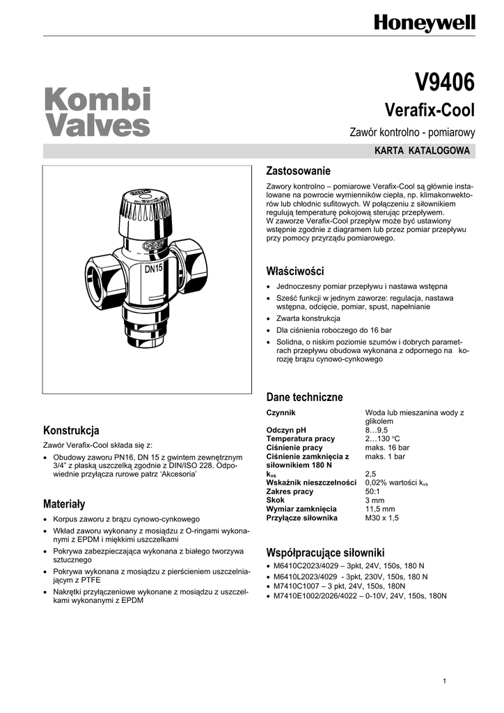 V9406 Verafix-Cool Zawór kontrolno - pomiarowy KARTA KATALOGOWA Zastosowanie Zawory kontrolno – pomiarowe Verafix-Cool są głównie instalowane na powrocie wymienników ciepła, np. klimakonwektorów lub chłodnic sufitowych. W połączeniu z siłownikiem regulują temperaturę pokojową sterując przepływem. W zaworze Verafix-Cool przepływ może być ustawiony wstępnie zgodnie z diagramem lub przez pomiar przepływu przy pomocy przyrządu pomiarowego. Właściwości • Jednoczesny pomiar przepływu i nastawa wstępna • Sześć funkcji w jednym zaworze: regulacja, nastawa wstępna, odcięcie, pomiar, spust, napełnianie • Zwarta konstrukcja • Dla ciśnienia roboczego do 16 bar • Solidna, o niskim poziomie szumów i dobrych parametrach przepływu obudowa wykonana z odpornego na korozję brązu cynowo-cynkowego Dane techniczne Czynnik Konstrukcja Zawór Verafix-Cool składa się z: • Obudowy zaworu PN16, DN 15 z gwintem zewnętrznym 3/4” z płaską uszczelką zgodnie z DIN/ISO 228. Odpowiednie przyłącza rurowe patrz ‘Akcesoria’ Materiały • Korpus zaworu z brązu cynowo-cynkowego Odczyn pH Temperatura pracy Ciśnienie pracy Ciśnienie zamknięcia z siłownikiem 180 N kvs Wskaźnik nieszczelności Zakres pracy Skok Wymiar zamknięcia Przyłącze siłownika Woda lub mieszanina wody z glikolem 8…9,5 2…130 ºC maks. 16 bar maks. 1 bar 2,5 0,02% wartości kvs 50:1 3 mm 11,5 mm M30 x 1,5 • Wkład zaworu wykonany z mosiądzu z O-ringami wykonanymi z EPDM i miękkimi uszczelkami • Pokrywa zabezpieczająca wykonana z białego tworzywa sztucznego • Pokrywa wykonana z mosiądzu z pierścieniem uszczelniającym z PTFE • Nakrętki przyłączeniowe wykonane z mosiądzu z uszczelkami wykonanymi z EPDM Współpracujące siłowniki • • • • M6410C2023/4029 – 3pkt, 24V, 150s, 180 N M6410L2023/4029 - 3pkt, 230V, 150s, 180 N M7410C1007 – 3 pkt, 24V, 150s, 180N M7410E1002/2026/4022 – 0-10V, 24V, 150s, 180N 1 V9406 VERAFIX-COOL Działanie Wymiary Zawór Verafix-Cool jest instalowany na powrocie i sterowany siłownikiem. Siłownik działa na wrzeciono wkładki regulacyjnej i w ten sposób zmienia przepływ przez zawór. Stosowany w instalacjach chłodniczych siłownik zamyka zawór, gdy temperatura spada i otwiera, gdy temperatura rośnie. Zawór Verafix-Cool może być również stosowany w instalacjach grzewczych, w tym przypadku działa na odwrót. Bez zamontowanego siłownika zawór jest normalnie otwarty. Maksymalny przepływ może być ograniczony przez wstępną nastawę wkładki regulacyjnej. Nastawa wstępna jest wykonywana zgodnie z nomogramem przepływu lub przez pomiar przepływu. Urządzenie pomiarowe może być podłączone do zaworu za pomocą adaptera Verafix-MES (akcesoria). Nastawa wstępna i pomiar przepływu może być wykonywany jednocześnie. Wynik zmiany nastawy wstępnej jest od razu widoczny na urządzeniu pomiarowym. Zawór Verafix-Cool może być opcjonalnie montowany na zasilaniu. W tym przypadku dla podłączonego wymiennika ciepła jako części instalacji przed zaworem Verafix-Cool nie jest dostępna funkcja spustu. Oznaczenia • MNG, DN15 i strzałka oznaczająca kierunek przepływu na przodzie • MNG, PN16 i strzałka oznaczająca kierunek przypływu z tyłu • Białe, ręczne pokrętło na górze Mosiężna, niklowana osłona zabezpieczająca z 19 mm sześciokątem od dołu Rys. 1. Wymiary UWAGA: Dostarczany z ręcznym pokrętłem i nakrętkami przyłączeniowymi z uszczelkami. Siłownik, adapter spustowy i pomiarowy muszą być zamówione osobno (patrz Akcesoria). Przykład zamawiania: V9406 Verafix-Cool zawór kontrolno-pomiarowy DN15, przyłącze G3/4”, kvs=2,5: Nr kat. V9406DX015 2 V9406 VERAFIX-COOL Przykłady instalacji Rys. 2. Regulacja chłodnic sufitowych: Verafix-Cool jest montowany na przewodzie powrotnym z chłodnic sufitowych. Rys. 3. Z powodu wysokiej wartości kvs pojedyńczy zawór może być używany do regulacji kilku elementów chłodniczych połączonych równolegle. Akcesoria Komputer pomiarowy FlowPlus Adapter spustowy VA3300A001 z czujnikiem ciśnieniowym 0…10 bar VM500A1008 z czujnikiem ciśnieniowym 0…20 bar VM500B1006 Specjalny klucz Verafix VA8300A001 Przyłącza Zewnętrznie gwintowana, mosiężna złączka, płaska uszczelka Akcesoria pomiarowe R ½“ (DIN2999) VA5500A015 NPT1/2“ (gwint NPT!) VA5501A015 Adapter pomiarowy VA3301A001 Mosiężna złączka do lutowania, płaska uszczelka 15 mm 16 mm Ręczny komputer pomiarowy BasicMES VA5930A015 VA5930A016 Stalowa złączka do spawania, płaska uszczelka VM241A1002 ½“ VA5540A015 Wewnętrznie gwintowana, mosiężna, niklowana złączka, płaska uszczelka Rp1/2“ VA5920A015 3 V9406 VERAFIX-COOL Dane przepływu Spadek ciśnienia Nastawa Przepływ Nastawa wstępna 5 8 13 16 20 = otwarty kv 0,63 1,00 1,60 2,00 kvs = 2,50 UWAGA: Nomogram przepływu jest prawidłowy tylko dla wody o temperaturze 5…30°C. Honeywell Sp. z o. o. ul. Domaniewska 39b 02-672 WARSZAWA (48)(22) 606 09 00; Fax (48)(22) 606 09 01 http://www.honeywell.com.pl 4 V9406verafixcool-k-pl01r RP0409