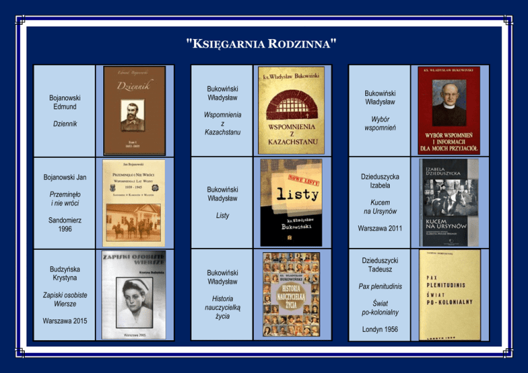 "KSIĘGARNIA RODZINNA" Bojanowski Edmund Dziennik Bukowiński Władysław Wspomnienia z Kazachstanu Bojanowski Jan Przeminęło i nie wróci Sandomierz 1996 Bukowiński Władysław Listy Wybór wspomnień Dzieduszycka Izabela Kucem na Ursynów Warszawa 2011 Budzyńska Krystyna Bukowiński Władysław Zapiski osobiste Wiersze Historia nauczycielką życia Warszawa 2015 Bukowiński Władysław Dzieduszycki Tadeusz Pax plenitudinis Świat po-kolonialny Londyn 1956 "KSIĘGARNIA RODZINNA" Kamiński Piotr Kruszewski Jan Tysiąc i jedna Opera Wspominki z mojego życia PWM 2008 Gdańsk 1998 Kamiński Andrzej Józef Kruszewski Jan Militaryzm niemiecki Metoda sztywnych elementów skończonych Warszawa 1962 Śladami Hakaty Drgania układów mechanicznych w ujęciu komputerowym 1995 1975 Kruszewski Jan Kamiński Andrzej Józef Kruszewski Jan Metoda elementów skończonych w dynamice konstrukcji 1984 Łempiccy Maria i Jacek Święci w Polsce i ich kult w świetle historii Kraków 2008 Łempiccy Maria i Jacek Sanktuaria polskie Warszawa 1988 "KSIĘGARNIA RODZINNA" Szczotkowski Zygmunt [...] Memoriał w sprawie kopalń Zagłębia Krakowskiego Szymanderski Witold Marcin Warszawa 2006 Kraków 1927 Szymanderska Hanna Kuchnia stara jak świat Szymanderska Hanna Encyklopedia polskiej sztuki kulinarnej Targowski Jerzy Ankieta ostatniego szwoleżera Sandomierz 2005 Targowski Juliusz Targowski Michał Hlebowicz Adam Wspomnienia Jaki, ptaki i kociaki Kraków 2005 Pelpin 2005 Targowski Krzysztof Wietrzykowski Wojciech Wspomnienia Zapamiętane 2002 Kraków 1998 "KSIĘGARNIA RODZINNA" Wietrzykowski Piotr Słownik polskołacińsko-grecki Wietrzykowski Piotr Mare Nostrum Bytom 1996 Bytom 1999 Wietrzykowski Piotr Rozmówki polsko-łacińskie Bytom 1998 Wietrzykowski Piotr Metafora czyli Słowniczek greckiego wpływu Bytom 2000 Zalewski Teodor Pół wieku wśród muzyków Kraków 1977 Wietrzykowski Włodzimierz Zieliński Henryk Recherches sur le développement des Lucernaires Ziemia Złotowska Paris 1912 Instytut Zachodni Poznań 1949 Wojciechowski Kajetan Zieliński Henryk Pamiętniki moje w Hiszpanii Historia Polski 1914-1939 Warszawa 1845 Ossolineum 1984 "KSIĘGARNIA RODZINNA" Zieliński Krzysztof Słownik pochodzenia nazw i określeń medycznych α-medica press 2004