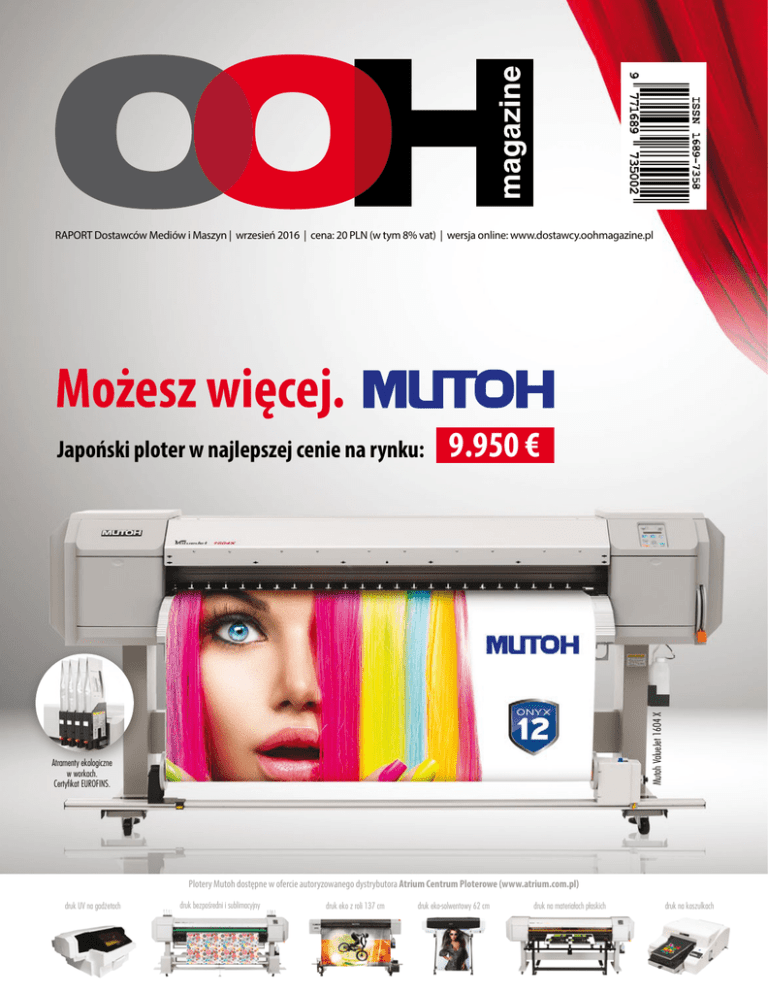 RAPORT Dostawców Mediów i Maszyn | wrzesień 2016 | cena: 20 PLN (w tym 8% vat) | wersja online: www.dostawcy.oohmagazine.pl Możesz więcej. 9.950 € Mutoh ValueJet 1604 X Japoński ploter w najlepszej cenie na rynku: Atramenty ekologiczne w workach. Certyfikat EUROFINS. Plotery Mutoh dostępne w ofercie autoryzowanego dystrybutora Atrium Centrum Ploterowe (www.atrium.com.pl) druk UV na gadżetach druk bezpośredni i sublimacyjny druk eko z roli 137 cm druk eko-solwentowy 62 cm druk na materiałach płaskich druk na koszulkach reklama wizualna znakowanie artykułów promocyjnych 10 Maszyny do grawerowania 11 Druk na tekstyliach 14 Instalacja Brother GT-3 w Print Plus Express 15 Materiały grawerskie 16 Druk bezpośredni na gadżetach 17 Maszyny do sitodruku 17 Maszyny do haftu 18 Maszyny do termotransferu 19 Media do termotransferu 22 MAPA DOSTAWCÓW MEDIÓW I MASZYN arkuszowy druk cyfrowy 24 W Sharp mówią o nich Herkulesy 26 Oprogramowanie / Web2Print 27 Urządzenia introligatorskie 30 Media do arkuszowego druku cyfrowego 33 Maszyny do arkuszowego druku cyfrowego 35 Wydajny i innowacyjny druk 36 MAPA DOSTAWCÓW MEDIÓW I MASZYN druk etykiet & opakowań 38 Druk etykiet - maszyny 39 Maszyny do produkcji etykiet 40 Papiery i kartony do produkcji opakowań 41 Druk opakowań - maszyny 41 Media do opakowań giętkich i etykiet 41 Folie opakowaniowe 44 MAPA DOSTAWCÓW MEDIÓW I MASZYN 45 Oprogramowanie / Opakowania 48 50 51 53 55 58 59 60 62 66 78 80 82 90 93 95 96 99 102 102 104 105 106 108 108 110 112 113 116 119 123 126 129 133 134 138 Folie wylewane Folie do zmiany koloru Folie okienne Folie monomeryczne Folie polimeryczne Folie specjalne FLAGI / DZIANINY Tapety Canvas Plotery UV Plotery lateksowe Plotery bio Plotery solwentowe Maszyny do sublimacji Media do sublimacji Drukarki wielkoformatowe (atramenty pigmentowe) Materiały POS Płyty Plotery drukująco-tnące Plotery tnące Maszyny do cięcia Klejarki cnc do klejenia pos i opakowań Maszyny do grawerowania i frezowania Urządzenia do szycia Urządzenia do gięcia tworzyw Zgrzewarki Zakuwarki Laminatory Laminaty Tkaniny Siatki Banery Papier Papier fotograficzny Atramenty MAPA DOSTAWCÓW MEDIÓW I MASZYN FestiwalDruku.pl FestiwalDruku.pl to kluczowe wydarzenie drugiej połowy roku dla sektora poligrafii reklamowej, a kolejny Raport, który oddajemy w Wasze ręce, będący jednocześnie katalogiem targowym, to największe na rynku zestawienie dostawców mediów i maszyn tej branży. Jego odzwierciedleniem jest wersja online, która pozwala na bieżąco sprawdzać nowości i trendy branżowe. A to dopiero początek! Wrześniowe święto branży poligrafii reklamowej z czołowymi dostawcami mediów i maszyn, oprócz prezentacji najnowszych i najciekawszych rozwiązań w dziedzinie druku i usług z nim związanych, daje możliwość udziału w wyjątkowych wydarzeniach towarzyszących. Po raz kolejny, wydawca miesięcznika „Świat DRUKU” i partner targów przeprowadzi dwudniowe warsztaty „Mini-Akademia Zarządzania Barwą. Tajniki poprawnego odwzorowania barw na ekranie i w druku”. Firma Polkos zaprosi natomiast na dzień otwarty z automatyczną giętarką do liter z taśm aluminiowych. W ramach wydarzeń dodatkowych Alma Trend przeprowadzi bezpłatne warsztaty „Termo – transfer od A do Z”, podczas których zaprezentuje drukarkę OKI PRO6410 NeonColor. Kolejny wystawca, Key2Print zaprasza drugiego dnia targów na swoje stoisko na konferencję „Nowe możliwości druku przez Internet – dekoracja, fotografia, druk komercyjny”. To nadal nie wszystko. W czasie trwania Festiwalu uczestnicy będą mogli po raz pierwszy zobaczyć najbardziej kreatywne rozwiązania w druku w specjalnie zaaranżowanej strefie BE CREATIVE! Odwiedzający strefę obejrzą oryginalne wydruki na meblach, przedmiotach codziennego użytku czy innych elementach wyposażenia wnętrz. Możliwości i rozwiązania zaprezentują nie tylko bezpośredni wykonawcy oferujący takie usługi, ale także producenci maszyn, technologii i mediów umożliwiających kreatywny print. Tegoroczny FestiwalDruku.pl to prawdziwe morze reklamowych inspiracji. Zatem, do zobaczenia w Warszawie, Dla pierwszych 10 osób, które polubią nas na Facebooku i wyślą wiadomość o treści „FESTIWAL DRUKU.PL” wysyłamy prezent niespodziankę. www.facebook.com/OOHmagazine Wydawca: OOH magazine Sp. z o.o. Al. Roździeńskiego 86a/IIIc 40-203 Katowice tel./fax + 48 32 206 76 77 [email protected] www.oohmagazine.pl Redaktor Naczelny: Katarzyna Lipska-Konieczko [email protected] Reklama: Robert Załupski [email protected] Dyrektor Sprzedaży: Monika Opałka [email protected] magazyn drukujemy w drukarni: zdjęcia do magazynu dostarcza serwis: w redakcji pracujemy na: OOH magazine jest Członkiem: w kampaniach marketingowych korzystamy z usług: Redaktor działu opakowania: Jaga Kolawa [email protected] Dział graficzny: Michał Piechniczek [email protected] W celu zamówienia prenumeraty prosimy o kontakt z działem dystrybucji: tel. + 48 /32/ 206 76 77 WSZELKIE PRAWA ZASTRZEŻONE. Redakcja nie ponosi odpowiedzialności za formę i treść zamieszczonych reklam i ogłoszeń. Laureaci konkursu Złoty Medal FestiwalMarketingu.pl / FestiwalDruku.pl 2016 Laureaci konkursu Złoty Medal FestiwalMarketingu.pl / FestiwalDruku.pl 2016 CHARAKTERYSTYKA Adframe LMD to wolno stojący dwustronny kaseton podświetlany diodami LED. Konstrukcja umożliwia łatwe złożenie i rozłożenie systemu. CHARAKTERYSTYKA GoTx 2190 drukarka inkjetowa do druku bezpośredniego na tkaninach z włókien naturalnych takich jak bawełna , jedwab, len, materiały konopne, wiskoza, wełna oraz na innych materiałach sztucznych poliesterowych. Druk z zastosowaniem tuszy pigmentowych o niespotykanym wcześniej gamucie kolorystycznym. Niesamowita jakość druku kroplą o wielkości 4 pkl. pozwala na uzyskanie detali w fotograficznej jakości wydruku. Innowacyjny system zakładania i prowadzenia materiału pozwala na dru