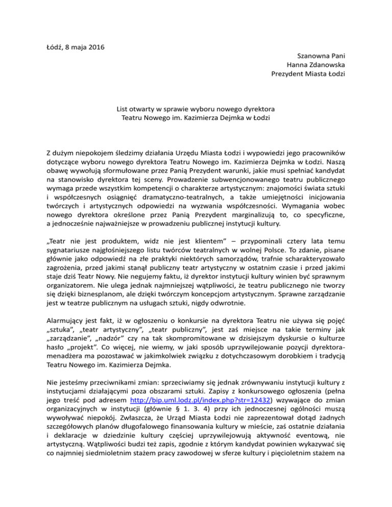 Łódź, 8 maja 2016 Szanowna Pani Hanna Zdanowska Prezydent Miasta Łodzi List otwarty w sprawie wyboru nowego dyrektora Teatru Nowego im. Kazimierza Dejmka w Łodzi Z dużym niepokojem śledzimy działania Urzędu Miasta Łodzi i wypowiedzi jego pracowników dotyczące wyboru nowego dyrektora Teatru Nowego im. Kazimierza Dejmka w Łodzi. Naszą obawę wywołują sformułowane przez Panią Prezydent warunki, jakie musi spełniać kandydat na stanowisko dyrektora tej sceny. Prowadzenie subwencjonowanego teatru publicznego wymaga przede wszystkim kompetencji o charakterze artystycznym: znajomości świata sztuki i współczesnych osiągnięć dramatyczno-teatralnych, a także umiejętności inicjowania twórczych i artystycznych odpowiedzi na wyzwania współczesności. Wymagania wobec nowego dyrektora określone przez Panią Prezydent marginalizują to, co specyficzne, a jednocześnie najważniejsze w prowadzeniu publicznej instytucji kultury. „Teatr nie jest produktem, widz nie jest klientem” – przypominali cztery lata temu sygnatariusze najgłośniejszego listu twórców teatralnych w wolnej Polsce. To zdanie, pisane głównie jako odpowiedź na złe praktyki niektórych samorządów, trafnie scharakteryzowało zagrożenia, przed jakimi stanął publiczny teatr artystyczny w ostatnim czasie i przed jakimi staje dziś Teatr Nowy. Nie negujemy faktu, iż dyrektor instytucji kultury winien być sprawnym organizatorem. Nie ulega jednak najmniejszej wątpliwości, że teatru publicznego nie tworzy się dzięki biznesplanom, ale dzięki twórczym koncepcjom artystycznym. Sprawne zarządzanie jest w teatrze publicznym na usługach sztuki, nigdy odwrotnie. Alarmujący jest fakt, iż w ogłoszeniu o konkursie na dyrektora Teatru nie używa się pojęć „sztuka”, „teatr artystyczny”, „teatr publiczny”, jest zaś miejsce na takie terminy jak „zarządzanie”, „nadzór” czy na tak skompromitowane w dzisiejszym dyskursie o kulturze hasło „projekt”. Co więcej, nie wiemy, w jaki sposób uprzywilejowanie pozycji dyrektoramenadżera ma pozostawać w jakimkolwiek związku z dotychczasowym dorobkiem i tradycją Teatru Nowego im. Kazimierza Dejmka. Nie jesteśmy przeciwnikami zmian: sprzeciwiamy się jednak zrównywaniu instytucji kultury z instytucjami działającymi poza obszarami sztuki. Zapisy z konkursowego ogłoszenia (pełna jego treść pod adresem http://bip.uml.lodz.pl/index.php?str=12432) wzywające do zmian organizacyjnych w instytucji (głównie § 1. 3. 4) przy ich jednoczesnej ogólności muszą wywoływać niepokój. Zwłaszcza, że Urząd Miasta Łodzi nie zaprezentował dotąd żadnych szczegółowych planów długofalowego finansowania kultury w mieście, zaś ostatnie działania i deklaracje w dziedzinie kultury częściej uprzywilejowują aktywność eventową, nie artystyczną. Wątpliwości budzi też zapis, zgodnie z którym kandydat powinien wykazywać się co najmniej siedmioletnim stażem pracy zawodowej w sferze kultury i pięcioletnim stażem na stanowisku kierowniczym. Kryterium to uniemożliwia przedstawienie programu szerszemu gronu kandydatów i zaskakuje szczególnie w perspektywie historii tej właśnie instytucji – Kazimierz Dejmek w dniu inauguracji Teatru Nowego miał 25 lat! Nie marginalizujmy pozycji Łodzi na mapie sztuki w naszym kraju, nie zastępujmy działań artystycznych marketingowymi, nie doprowadzajmy do zmiany publicznej instytucji kultury w przedsiębiorstwo prowadzące działalność parakulturalną. Wzywamy do ponownego przemyślenia wymogów konkursowych na stanowisko dyrektora Teatru Nowego w Łodzi. Od nowego dyrektora wymagajmy przede wszystkim nieschematycznego myślenia człowieka sztuki, nie zaś marketingowej nowomowy i braku zrozumienia dla specyfiki publicznego teatru artystycznego. Dorota Buchwald – dyrektor Instytutu Teatralnego prof. dr hab. Małgorzata Leyko – Dyrektor Instytutu Kultury Współczesnej Uniwersytetu Łódzkiego Joanna Szymajda – zastępca dyrektora Instytutu Muzyki i Tańca Jacek Kopciński – redaktor naczelny miesięcznika „Teatr” Jacek Sieradzki – redaktor naczelny miesięcznika „Dialog” Katarzyna Knychalska – redaktor naczelna portalu „teatralny.pl” Jan Buchwald – reżyser, prezes Fundacji Teatru Myśli Obywatelskiej im. Zygmunta Hübnera Bartosz Frąckowiak – reżyser, zastępca dyrektora Teatru Polskiego im. Hieronima Konieczki w Bydgoszczy Jacek Głomb – reżyser, dyrektor Teatru im. Heleny Modrzejewskiej w Legnicy Magda Grudzińska – dyrektor naczelny i artystyczny Teatru im. Wojciecha Bogusławskiego w Kaliszu Dorota Ignatjew – zastępca dyrektora do spraw artystycznych Teatru Zagłębia w Sosnowcu Tomasz Kireńczuk – dyrektor programowy Teatru Nowego w Krakowie, kierownik programowy Festiwalu Dialog-Wroclaw Krzysztof Mieszkowski – dyrektor Teatru Polskiego we Wrocławiu / Poseł na Sejm RP Maciej Nowak – zastępca dyrektora Teatru Polskiego w Poznaniu Karolina Ochab – dyrektor Nowego Teatru w Warszawie Paweł Sztarbowski – zastępca dyrektora Teatru Powszechnego im. Zygmunta Hübnera w Warszawie Krzysztof Warlikowski – reżyser, twórca i dyrektor artystyczny Nowego Teatru w Warszawie Magdalena Cielecka – aktorka, Nowy Teatr w Warszawie Remigiusz Brzyk – reżyser Bartosz Gelner – aktor, Nowy Teatr w Warszawie Piotr Gruszczyński – dramaturg, Nowy Teatr w Warszawie Małgorzata Hajewska – aktorka Michał Kmiecik – reżyser Zygmunt Malanowicz – aktor, Nowy Teatr w Warszawie Maja Ostaszewska – aktorka, Nowy Teatr w Warszawie Piotr Polak – aktor, Nowy Teatr w Warszawie Jacek Poniedziałek – aktor, tłumacz, reżyser, Nowy Teatr w Warszawie Katarzyna Raduszyńska – reżyserka Małgorzata Szczęśniak – scenograf, Nowy Teatr w Warszawie Cezary Tomaszewski – reżyser, choreograf Irena Jajte-Lewkowicz – Katedra Dramatu i Teatru Uniwersytetu Łódzkiego Dariusz Leśnikowski – Katedra Dramatu i Teatru Uniwersytetu Łód