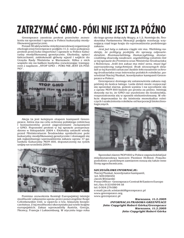 ZATRZYMAÆ GMO - PÓKI NIE JEST ZA PÓNO Greenpeace zaostrza protest przeciwko zezwoleniu na sprzeda¿ i uprawê w Polsce kukurydzy modyfikowanej genetycznie. Ponad 30 aktywistów miêdzynarodowej organizacji ekologicznej Greenpeace podjê³o 11.2. rano pokojowy protest przeciwko importowi i uprawie w Polsce kukurydzy modyfikowanej genetycznie. Ekolodzy, spiêci ³añcuchami, zablokowali g³ówny wjazd i wejœcie do Urzêdu Rady Ministrów w Warszawie. Kilku z nich wspiê³o siê na balkon budynku rozwieszaj¹c transparent z napisem ,,STOP GMO – PÓKI NIE JEST ZA PÓNO”. do tego grona do³¹czy³y Wêgry, a 1.2. Komisja ds. Œrodowiska Parlamentu S³owacji podjê³a rezolucjê wzywaj¹c¹ rz¹d tego kraju do wprowadzenia podobnego zakazu. Jest ju¿ luty a zakazu ci¹gle nie ma. Mieliœmy nadziejê, ¿e politycy podejd¹ do sprawy odpowiedzialnie. Rozmawialiœmy, t³umaczyliœmy, dostarczaliœmy dowody naukowe, wys³aliœmy ostatnio list w tej sprawie do Premiera oraz Ministrów Œrodowiska i Rolnictwa. Jeœli ten zakaz ma mieæ sens, musi byæ wprowadzony natychmiast. Brak stosownych dzia³añ w tej kwestii oznaczaæ bêdzie lekcewa¿enie ochrony œrodowiska oraz interesów polskich rolników, powiedzia³ Maciej Muskat, koordynator kampanii Greenpeace w Polsce. Greenpeace domaga siê ustanowienia zakazu najpóŸniej do koñca lutego. Lada dzieñ mo¿e rozpocz¹æ siê sprzeda¿ ziarna, potem wysiew i na wycofanie siê z upraw MON 810 bêdzie po prostu za póŸno. Istniej¹ dowody na to, ¿e GMO raz uwolnione do œrodowiska, rozprzestrzenia siê w sposób niekontrolowany. W efekcie doprowadza to do istnienia monokultur rolniczych i uzale¿nienia rolników od korporacji biotechnologicznych. Akcja ta jest kolejnym etapem kampanii Greenpeace, która ma na celu ochronê polskiego rolnictwa i konsumentów przed zagro¿eniami zwi¹zanymi z GMO. Poprzedni protest w tej sprawie przeprowadzono w listopadzie 2004 r. Ekolodzy ustawili wtedy przed Ministerstwem Œrodowiska symboliczne pole kukurydzy modyfikowanej genetycznie i domagali siê jak najszybszego wprowadzenia zakazu upraw 17 gatunków kukurydzy MON 810, dopuszczonej na rynek unijny we wrzeœniu 2004 r. Sprzeda¿ ziaren MON 810 w Polsce zapowiedzia³ ju¿ miêdzynarodowy koncern Pionieer Hi-Bred. Prawdopodobnie z podobnym zamiarem nosz¹ siê tak¿e inne firmy agrochemiczne. Pomimo zezwolenia Komisji Europejskiej istnieje mo¿liwoœæ zakazania upraw przez poszczególne Kraje Cz³onkowskie Unii, w oparciu o tzw. klauzulê bezpieczeñstwa. Z tej mo¿liwoœci skorzysta³o ju¿ wiele krajów europejskich. Zakaz wprowadzi³y Austria, Grecja, Niemcy, Francja i Luksemburg. W styczniu tego roku SZCZEGÓ£OWE INFORMACJE: Maciej Muskat, koordynator kampanii, tel. 509 058 651 Jacek Winiarski Press Officer - Greenpeace Central & Eastern Europe tel./fax: 0-22 659 94 18 tel. 0-504 274 080 e-mail: [email protected] www.greenpeace.org www.greenpeace.pl Warszawa, 11.2.2005 INFORMACJA PRASOWA GREENPEACE foto: Copyright Robert Górka/Greenpeace Warszawa, 11.2.2005 foto: Copyright Robert Górka Pan Premier Rz¹du Rzeczypospolitej Polski Prof. Marek Belka Sekretariat Prezesa Rady Ministrów fax 0-22 621 88 27 DOT. WPROWADZENIA ZAKAZU IMPORTU I UPRAWY KUKURYDZY GENETYCZNIE MODYFIKOWANEJ MON810 NA TERYTORIUM POLSKI Szanowny Panie Premierze, Piszemy do Pana w zwi¹zku z decyzj¹ Komisji Europejskiej z 8.9.2004 w sprawie wprowadzenia 17 odmian genetycznie zmodyfikowanej kukurydzy – MON810 – do Wspólnotowego Katalogu nasion. Decyzja o umieszczeniu tych odmian w Katalogu Wspólnotowym pozwoli rolnikom w naszym kraju na kupowanie i uprawê genetycznie modyfikowanej kukurydzy ju¿ wiosn¹ tego roku. W zwi¹zku z tym istnieje bardzo du¿e prawdopodobieñstwo wyst¹pienia zanieczyszczenia œrodowiska, co zagrozi zarówno wolnoœci wyboru konsumenta, jak i rolnika. Kukurydza MON810, zawieraj¹ca toksynê przeciw owadom oznaczan¹ jako Bt, zosta³a dopuszczona na podstawie starej Dyrektywy GMO 90/220, która wymaga³a bardzo ograniczonej oceny oddzia³ywania na œrodowisko. Co wiêcej, Polska nie mia³a mo¿liwoœci uczestniczenia w procesie autoryzacji i nie znany jest wp³yw tej roœliny na nasze œrodowisko naturalne. Z miesi¹ca na miesi¹c zwiêksza siê liczba danych naukowych œwiadcz¹cych o potencjalnych negatywnych skutkach wprowadzenia na pola MON810 (wytwarzanie odpornoœci na Bt przez owady, wp³yw na owady po¿yteczne; wp³yw na zrównowa¿one modele uprawy ziemi). Najnowsze informacje potwierdzaj¹ nasze obawy, ¿e Komisja Europejska dopuœci³a siê zaniedbania i nie istnieje ¿aden sensowny plan monitorowania skutków wprowadzenia MON810 do uprawy. Wiele organizacji i osób prywatnych wys³a³o listy do Ministra Rolnictwa oraz Ministra Œrodowiska domagaj¹c siê wprowadzenia zakazu importu i uprawy kukurydzy genetycznie modyfikowanej MON810 na terytorium Polski, co jest mo¿liwe w oparciu o prawodawstwo europejskie (art. 23 Dyrektywy 2001/18). W zesz³ym miesi¹cu decyzjê o wprowadzeniu wspomnianego zakazu wyda³ rz¹d Wêgier, natomiast 1.2.2005 Komisja ds. Œrodowiska Parlamentu Republiki S³owacji jednog³oœnie podjê³a rezolucjê domagaj¹c¹ siê od rz¹du tego kraju wprowadzenia podobnego zakazu. 24.11.2004 Komisja Rolnictwa i Rozwoju Wsi Senatu RP og³osi³a stanowisko, w którym twierdzi: W obecnej sytuacji zgoda na dopuszczenie do obrotu handlowego ziarna i nasion oraz zezwolenie na hodowlê roœlin zmodyfikowanych genetycznie mo¿e przynieœæ negatywne skutki zarówno dla œrodowiska naturalnego, jak i dla kondycji zdrowotnej obywateli RP. Pomimo istnienia realnego zagro¿enia dla polskiego rolnictwa i przyrody zwi¹zanego z zanieczyszczeniem przez GMO, Rz¹d RP jak dot¹d nie wprowadzi³ zakazu oraz nie zapewni³ spo³eczeñstwa, ¿e zamierza to zrobiæ. Zdajemy sobie sprawê z tego, ¿e ostatecznie decyzja o wprowadzeniu zakazu bêdzie musia³a byæ zaakceptowana na posiedzeniu Rady Ministrów. W zwi¹zku z tym apelujê do Pana, 