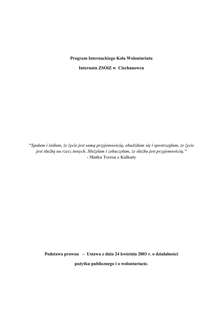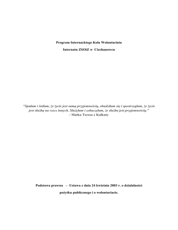 Program Internackiego Koła Wolontariatu Internatu ZSOiZ w Ciechanowcu "Spałam i śniłam, że życie jest samą przyjemnością, obudziłam się i spostrzegłam, że życie jest służbą na rzecz innych. Służyłam i zobaczyłam, że służba jest przyjemnością." - Matka Teresa z Kalkuty Podstawa prawna – Ustawa z dnia 24 kwietnia 2003 r. o działalności pożytku publicznego i o wolontariacie. WSTĘP Dzisiejszy świat nie oferuje wszystkim tego samego. Nie obdarowano nas równo. Niektórzy rodzą się chorzy, innym choroba się przytrafia. Jeszcze inni cieszą się pełnią życia. I właśnie na nich spoczywa nie obowiązek, ale chęć niesienia pomocy. Dlaczego dobrze jest pomagać? Dlaczego pomagając czujemy się wspaniale, jesteśmy z siebie dumni? Odpowiedź jest prosta. Tylko wtedy możemy siebie samych nazywać ludźmi. W codziennym życiu jesteśmy skupieni na sobie. Nie zawsze zauważymy innych, ich problemów i ograniczeń. Wówczas to, co nas dotyka, odbieramy jako ogromne problemy, z którymi nie możemy sobie dać rady. Musimy starać się zawsze patrzeć na tych, którzy mają gorzej – to pomaga docenić to, co się samemu posiada, i wyzwala chęć niesienia pomocy w miarę swoich możliwości. Bezinteresowna pomoc drugiej osobie to najlepsza nauka drugiego człowieka, nauka człowieczeństwa. To też nauka udzielania pomocy i proszenia o nią. Choroba, bieda, ograniczenia – nie są wstydliwymi sprawami. To część życia i trzeba pamiętać, że w każdej chwili mogą one dotknąć każdego. Jak my i nasi wychowankowie możemy uczyć i uczyć się takiej postawy? Wolontariat to bezinteresowne zaangażowanie wychowawców i młodzieży na rzecz potrzebujących. Chcemy kierować się pasją i zaangażowaniem, a przede wszystkim wrażliwością i troską o drugiego człowieka. Wolontariat również rozwija postawę alternatywną dla konsumpcyjnego stylu życia i uzależnień. Stwarza okazję do wyszukiwania autorytetów i budowania świata wartości, pomaga w rozwijaniu zainteresowań, w szukaniu pożytecznej formy spędzania czasu wolnego. CECHY NASZYCH WOLONTARIUSZY: Wrażliwość-wnikliwa obserwacja świata i otoczenia pozwala dostrzec wokół nas ludzi samotnych, opuszczonych, potrzebujących, bądź chorych. Empatia - umiejętność wczuwania się w sytuację i doznania drugiego człowieka, rozumienia i przeżywania jego cierpienia. Takie osobiste odbieranie drugiego człowieka skłania nas do zatrzymania się nad jego niedolą, wyzwala w nas potrzebę ochraniania go, udzielania mu pomocy. Wtedy pomagamy najbardziej skutecznie. Dajmy z siebie jak najwięcej, a to z kolei daje nam ogromną satysfakcję i zadowolenie z dobrze wypełnionego moralnego obowiązku. Odpowiedzialność - cecha która jest dowodem naszej dojrzałości emocjonalnej. Musimy zdawać sobie sprawę tego , że podejmując różne zobowiązania trzeba się z nich wywiązać. Dlatego, też lepiej wziąć na swe barki mniej, ale wykonać to lepiej, aniżeli dużo i byle jak. Optymizm i chęć działania - pozytywne nastawienie do świata i do tego czym się zajmujemy ma wpływ na naszą pracę. Uśmiechnięty wolontariusz zdziała dużo więcej. Odwaga i bark barier psychicznych- to cechy bardzo potrzebne w pracy wolontariusza. Pochylając się nad chorym czy potrzebującym często musimy przełamywać swoje bariery. To bardzo trudne zadanie by umieć zaakceptować inność. Widać to w kontaktach z ludźmi chorymi jak i starszymi gdzie nie jest łatwo odnaleźć w tej niepełnosprawnej osobie pełnowartościowego człowieka. Umiejętne gospodarowanie czasem - wolontariusz musi tak gospodarować swoim czasem, aby pogodzić wszystkie obowiązki. Punktualność - cecha, którą należy w sobie wypracować, by nie zawieźć siebie i innych. KODEKS ETYCZNY WOLONTARIUSZA Być pewnym Zastanów się, dlaczego chcesz pomagać innym ludziom. Być przekonanym do tego czym się zajmujesz Nie oferuj swej pomocy, jeżeli nie jesteś przekonany o wartości tego, co robisz. Być lojalnym Zgłaszaj sugestie, nie „uderzaj” w innych. Przestrzegać zasad Nie krytykuj rzeczy, których nie rozumiesz. Może okazać się, że mają swoje uzasadnienie. Mówić otwarcie Pytaj o rzeczy, których nie rozumiesz. Nie pozwól, by tłumione wątpliwości i frustracje odciągnęły Cię od tego, co najważniejsze, bądź zmieniły w osobę stwarzającą problem. Chętnie uczyć się Rozszerzaj swoją wiedzę. Stale się rozwijać Staraj się wiedzieć jak najwięcej o Twojej organizacji i pracy. Nie sprzeciwiać się kontroli nad sobą Będziesz pracował lepiej i z większą satysfakcją, wykonując to, czego od Ciebie się oczekuje. Być osobą, na której można polegać Praca jest zobowiązaniem. Wykonuj to, co zgodziłeś się zrobić. Nie składaj obietnic, których nie jesteś w stanie spełnić. Działać w zespole Znajdź dla siebie miejsce w grupie. Samotnik działający na własną rękę jest mało skuteczny. PRAWA WOLONTARIUSZA Wolontariusz ma prawo do zgłaszania własnych propozycji i inicjatyw. Wolontariusz ma prawo do podejmowania pracy w wymiarze nie utrudniającym nauki w szkole i pomocy w domu. Wolontariusz ma prawo do wsparcia ze strony koordynatora lub innych pracowników Wolontariatu Internackiego. Wolontariusz nie powinien wykonywać prac objętych polityką etatową, czyli zastępować pracownika. Wolontariusz ma prawo do otrzymania pisemnego zaświadczenia o wykonanej pracy. Wolontariusz ma prawo być poinformowany o trudnościach, kosztach przejazdu związanych z wykonywaną pracą. Nie wolno wywierać na wolontariusza presji moralnej w związku z realizowanym zadaniem pozostającym w konflikcie z jego przekonaniami. Wolontariusz ma prawo do rezygnacji z pracy wolontarystycznej uprzedzając odpowiednio wcześniej koordynatora Wolontariatu Internackiego. OBOWIĄZKI WOLONTARIUSZA Niepełnoletni członkowie Wolontariatu Szkolnego muszą przedstawić pisemną zgodę rodziców lub opiekunów na dz