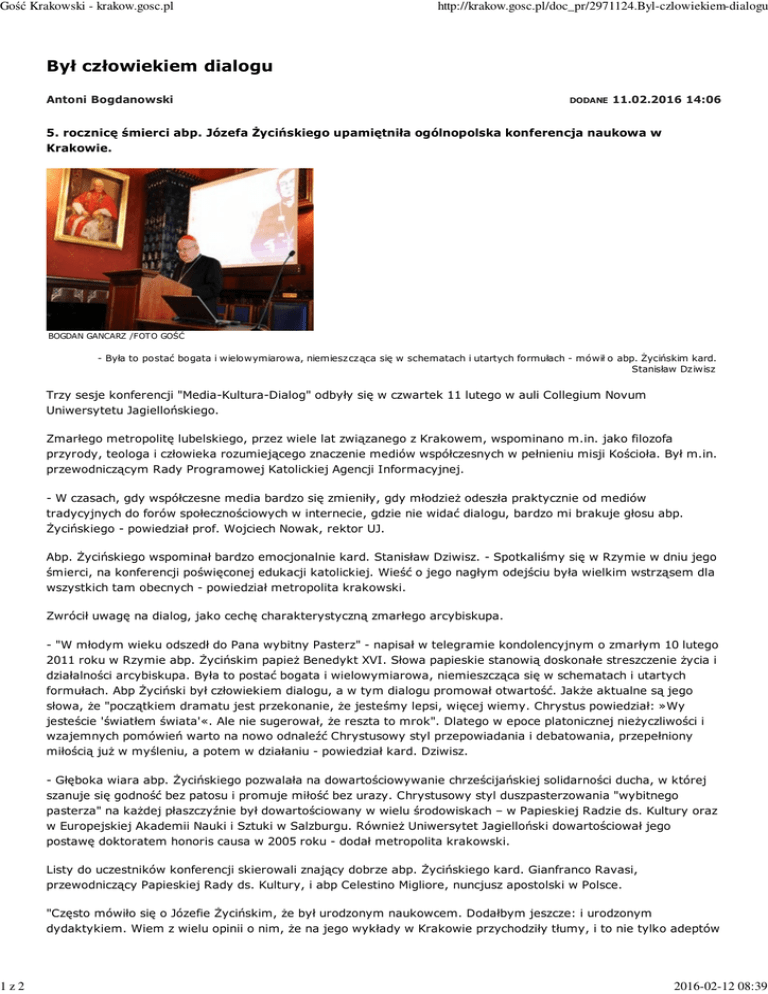 Gość Krakowski - krakow.gosc.pl 1z2 http://krakow.gosc.pl/doc_pr/2971124.Byl-czlowiekiem-dialogu Był człowiekiem dialogu Antoni Bogdanowski DODANE 11.02.2016 14:06 5. rocznicę śmierci abp. Józefa Życińskiego upamiętniła ogólnopolska konferencja naukowa w Krakowie. BOGDAN GANCARZ /FOTO GOŚĆ - Była to postać bogata i wielowymiarowa, niemieszcząca się w schematach i utartych formułach - mówił o abp. Życińskim kard. Stanisław Dziwisz Trzy sesje konferencji "Media-Kultura-Dialog" odbyły się w czwartek 11 lutego w auli Collegium Novum Uniwersytetu Jagiellońskiego. Zmarłego metropolitę lubelskiego, przez wiele lat związanego z Krakowem, wspominano m.in. jako filozofa przyrody, teologa i człowieka rozumiejącego znaczenie mediów współczesnych w pełnieniu misji Kościoła. Był m.in. przewodniczącym Rady Programowej Katolickiej Agencji Informacyjnej. - W czasach, gdy współczesne media bardzo się zmieniły, gdy młodzież odeszła praktycznie od mediów tradycyjnych do forów społecznościowych w internecie, gdzie nie widać dialogu, bardzo mi brakuje głosu abp. Życińskiego - powiedział prof. Wojciech Nowak, rektor UJ. Abp. Życińskiego wspominał bardzo emocjonalnie kard. Stanisław Dziwisz. - Spotkaliśmy się w Rzymie w dniu jego śmierci, na konferencji poświęconej edukacji katolickiej. Wieść o jego nagłym odejściu była wielkim wstrząsem dla wszystkich tam obecnych - powiedział metropolita krakowski. Zwrócił uwagę na dialog, jako cechę charakterystyczną zmarłego arcybiskupa. - "W młodym wieku odszedł do Pana wybitny Pasterz" - napisał w telegramie kondolencyjnym o zmarłym 10 lutego 2011 roku w Rzymie abp. Życińskim papież Benedykt XVI. Słowa papieskie stanowią doskonałe streszczenie życia i działalności arcybiskupa. Była to postać bogata i wielowymiarowa, niemieszcząca się w schematach i utartych formułach. Abp Życiński był człowiekiem dialogu, a w tym dialogu promował otwartość. Jakże aktualne są jego słowa, że "początkiem dramatu jest przekonanie, że jesteśmy lepsi, więcej wiemy. Chrystus powiedział: »Wy jesteście 'światłem świata'«. Ale nie sugerował, że reszta to mrok". Dlatego w epoce platonicznej nieżyczliwości i wzajemnych pomówień warto na nowo odnaleźć Chrystusowy styl przepowiadania i debatowania, przepełniony miłością już w myśleniu, a potem w działaniu - powiedział kard. Dziwisz. - Głęboka wiara abp. Życińskiego pozwalała na dowartościowywanie chrześcijańskiej solidarności ducha, w której szanuje się godność bez patosu i promuje miłość bez urazy. Chrystusowy styl duszpasterzowania "wybitnego pasterza" na każdej płaszczyźnie był dowartościowany w wielu środowiskach – w Papieskiej Radzie ds. Kultury oraz w Europejskiej Akademii Nauki i Sztuki w Salzburgu. Również Uniwersytet Jagielloński dowartościował jego postawę doktoratem honoris causa w 2005 roku - dodał metropolita krakowski. Listy do uczestników konferencji skierowali znający dobrze abp. Życińskiego kard. Gianfranco Ravasi, przewodniczący Papieskiej Rady ds. Kultury, i abp Celestino Migliore, nuncjusz apostolski w Polsce. "Często mówiło się o Józefie Życińskim, że był urodzonym naukowcem. Dodałbym jeszcze: i urodzonym dydaktykiem. Wiem z wielu opinii o nim, że na jego wykłady w Krakowie przychodziły tłumy, i to nie tylko adeptów 2016-02-12 08:39 Gość Krakowski - krakow.gosc.pl 2z2 http://krakow.gosc.pl/doc_pr/2971124.Byl-czlowiekiem-dialogu filozofii przyrody. Lubiano, gdy mówił, bo był jasny w przekazie, miał przystępny język, swoisty dowcip i błyskotliwość erudyty. A później - jak to możemy docenić lepiej dopiero po czasie - był urodzonym pasterzem i uczestnikiem życia społecznego" - napisał abp Migliore. Ważnym głosem w dyskusji o poglądach filozoficznych abp. Życińskiego było wystąpienie ks. prof. Michała Hellera, jego przyjaciela i następcy na stanowisku szefa Katedry Filozofii Przyrody obecnego UPJPII, kosmologa. Ks. prof. Heller wykazał w sposób klarowny, że widzenie świata przez abp. Życińskiego było platoniczne. Jego teorię pola racjonalności uznał za wciąż aktualną i dającą możność kontynuacji. - Jako platonik filozoficzny, Życiński wysunął tezę, że struktury matematyczne są ontycznie bardziej pierwotne niż konkretne obiekty fizyczne - powiedział ks. prof. Heller. O zmarłym arcybiskupie mówili również m.in. prof. Andrzej Zoll i prof. Franciszek Ziejka z UJ, księża profesorowie Michał Dróżdż, Wojciech Misztal i Robert Nęcek z UPJPII oraz prof. Ewa Kucharska z Akademii "Ignatianum". Rektor Nowak i kard. Dziwisz podkreślili, że konferencja zorganizowana przez UJ, IPJPII, Naczelną Radę Adwokacką, Okręgową Radę Adwokacką w Krakowie i Akademię "Ignatianum" nie mogłaby się odbyć w tak bogatym kształcie, gdyby nie wysiłki organizacyjne ks. prof. Nęcka, rzecznika prasowego archidiecezji krakowskiej, kierownika Katedry Edukacji Medialnej w Instytucie Dziennikarstwa i Komunikacji Społecznej Uniwersytetu Papieskiego Jana Pawła II w Krakowie. - Miałem szczęście być jednym z uczniów abp. Życińskiego. Zapamiętałem go nie tylko jako świetnego wykładowcę, objaśniającego klarownie problematykę relacji między naukami przyrodniczymi a wiarą chrześcijańską i czynnie uczestniczącego w dialogu chrześcijaństwa z kulturą współczesną. Mam go w pamięci również jako człowieka dobrego, stroniącego od intryg. Mało kto wiedział, że wspierał ubogich i potrzebujących. Niezamożnym studentom darowywał często swoje książki, w których znajdowali potem koperty z pieniędzmi. Zdarzało się, że osobiście pomagał samotnym matkom w poszukiwaniu mieszkania - wspominał ks. prof. Nęcek. Uczniem abp. Życińskiego był w Krakowie również prof. Grzegorz Przebinda, wybitny rusycysta z UJ, rektor PWSZ im. Stanisława Pigonia w Krośnie. - Słuchałem w pierwszych latac