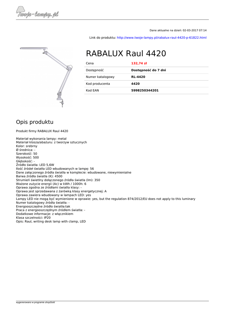 Dane aktualne na dzień: 02-03-2017 07:14 Link do produktu: http://www.twoje-lampy.pl/rabalux-raul-4420-p-61822.html RABALUX Raul 4420 Cena 132,74 zł Dostępność Dostępność do 7 dni Numer katalogowy RL-4420 Kod producenta 4420 Kod EAN 5998250344201 Opis produktu Produkt firmy RABALUX Raul 4420 Materiał wykonania lampy: metal Materiał klosza/abażuru: z tworzyw sztucznych Kolor: srebrny Ø średnica: Szerokość: 50 Wysokość: 500 Głębokość: Źródło światła: LED 5,6W Ilość źródeł światła LED wbudowanych w lampę: 56 Dane załączonego źródła światła w komplecie: wbudowane, niewymienialne Barwa źródła światła (K): 4500 Strumień świetlny dołączonego źródła światła (lm): 350 Ważone zużycie energii (Ac) w kWh / 1000h: 6 Oprawa zgodna ze źródłami światła klasy: Oprawa jest sprzedawana z żarówką klasy energetycznej: A Oprawa zawiera wbudowany w lampach LED: yes Lampy LED nie mogą być wymienione w oprawie: yes, but the regulation 874/2012/EU does not apply to this luminary Numer katalogowy źródła światła: Energooszczędne źródło światła:tak Praca z energooszczędnym źródłem światła: Dodatkowe informacje: z włącznikiem Klasa szczelności: IP20 Opis: Raul, writing desk lamp with clamp, LED wygenerowano w programie shopGold Powered by TCPDF (www.tcpdf.org)