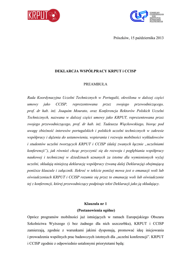 Prószków, 15 października 2013 DEKLARCJA WSPÓŁPRACY KRPUT i CCISP PREAMBUŁA Rada Koordynacyjna Uczelni Technicznych w Portugalii, określona w dalszej części umowy jako CCISP, reprezentowana przez swojego przewodniczącego, prof. dr hab. inż. Joaquim Mourato, oraz Konferencja Rektorów Polskich Uczelni Technicznych, nazwana w dalszej części umowy jako KRPUT, reprezentowana przez swojego przewodniczącego, prof. dr hab. inż. Tadeusza Więckowskiego, biorąc pod uwagę zbieżność interesów portugalskich i polskich uczelni technicznych w zakresie współpracy i dążenia do ustanowienia, wspierania i rozwoju mobilności wykładowców i studentów uczelni tworzących KRPUT i CCISP (dalej zwanych łącznie „uczelniami konferencji”), jak również chcąc przyczynić się do rozwoju i pogłębiania współpracy naukowej i technicznej w dziedzinach uznanych za istotne dla wymienionych wyżej uczelni, składają niniejszą deklarację współpracy (zwaną dalej Deklaracją) obejmującą poniższe klauzule i załącznik. Ilekroć w tekście poniżej mowa jest o emanacji woli lub oświadczeniach KRPUT i CCISP rozumie się przez to emanację woli lub oświadczenie tej z konferencji, której przewodniczący podpisuje tekst Deklaracji jako ją składający. Klauzula nr 1 (Postanowienia ogólne) Oprócz programów mobilności już istniejących w ramach Europejskiego Obszaru Szkolnictwa Wyższego (i bez żadnego dla nich uszczerbku), KRPUT i CCISP zamierzają, zgodnie z warunkami jakimi dysponują, promować ideę inicjowania i prowadzenia wspólnych prac badawczych istotnych dla „uczelni konferencji”. KRPUT i CCISP zgodnie z odpowiednio ustalonymi priorytetami będą: 1. stwarzać platformę do nawiązywania różnych form współpracy „uczelni konferencji” i wspierać je przy tym organizacyjnie 2. promować i dążyć do ułatwienia mobilności pracowników dydaktycznych i naukowców; 3. działać na rzecz wzmocnienia mobilności studentów studiów wszystkich stopni i studiów podyplomowych, a ponadto 4. w ujęciu ogólnym i stosownie do ich potrzeb oraz uwarunkowań krajowych - określać inne wspólne cele obu konferencji (które uznają za stosowne i następnie doprecyzują w drodze odrębnych porozumień). Klauzula nr 2 (Roczny Plan Działań) W celu urzeczywistnienia tych postanowień, przedstawiciele KRPUT i CCISP podejmą się stworzenia rocznych planów działań, w których określą wspólne obszary badań, nauczania i mobilności, w których to poszczególne „uczelnie „konferencji będą następnie podejmować współpracę – powołując się na niniejszą deklarację – pod warunkiem jednak zawarcia szczegółowych porozumień uprawnionych do tego stron, określających szczegółowo ich prawa i obowiązki (z uwzględnieniem uwarunkowań krajowych). Plany działań, o których mowa powyżej, po ich pozytywnym zaopiniowaniu (w stosowny dla każdej z konferencji sposób) będą uznawane przez KRPUT i CCISP za integralną część niniejszej Deklaracji. Klauzula nr 3 (Zakres i formy współpracy) W zgodnej ocenie KRPUT i CCISP w zakresie niniejszej Deklaracji leży udzielanie wsparcia uczelniom konferencji - wspieranie mobilności wykładowców, studentów i naukowców z Portugalii i z Polski, którzy, na mocy tej Deklaracji, chcą rozwijać projekty badawcze lub inne związane z tymi krajami, w szczególności w dziedzinach akademickich i naukowych. Szczegółowe metody wsparcia uczelnie konferencji powinny ustalać w porozumieniach zawieranych stosownie do przedmiotu współpracy i z uwzględnieniem uwarunkowań krajowych Umawiających się Stron oraz z uwzględnieniem zasad określonych niniejszą Deklaracją. Poszczególne przedsięwzięcia mające za przedmiot współpracę „uczelni konferencji” – po ich niezbędnym doprecyzowaniu i zawarciu pisemnych porozumień szczegółowych będą mogły mieć za przedmiot m.in.: 1. Wzajemny udział we wspólnych programach, włącznie z wymianą informacji i danych, w ważnych dziedzinach. 2. Zapewnienie i wymianę kontaktów dla podejmowania aktywnych interwencji wspierających rozwój stosunków między środowisk akademickich Portugalii, Polski oraz innych krajów, które zostaną uznane za istotne dla tej współpracy. 3. Wymianę naukowców i pracowników, której celem jest promowanie nauczania, szkoleń i prac badawczych. 4. Promowanie mobilności pracowników dydaktycznych w celach szkoleniowych oraz dla podejmowania prac badawczych w dziedzinach istotnych dla obu stron. 5. Promowanie mobilności studentów z poziomu studiów licencjackich, inżynierskich, magisterskich i równoważnych. 6. Realizację konferencji, seminariów i szkoleń dla wzajemnego pożytku. 7. Wymianę materiałów techniczno-naukowych, publikacji i bibliografii uznanych za istotne. KRPUT i CCISP bedą zachęcały “uczelnie konferencji” do podejmowania współpracy, która opierać się będzie na wspólnym zrozumieniu i poszanowaniu celów każdej ze stron, uwględniać będzie warunki prawne obowiązujace odpowiednio w krajach macierzystych oraz prawo wspólnotowe dotyczące stron i ich współpracy. KRPUT i CCISP zalecają aby “uczelnie konferencji”, które zechcą podjąć współpracę z powołaniem się na niniejszą Deklarację najdalej z nawiązaniem tej współpracy przyjęły do stosowania “Zasady współpracy uczelni współtworzących KRPUT i CCISP”, które zostały określone w załączniku do niniejszej Deklaracji. Klauzula nr 4 (Procedury) Specyficzne formy współpracy, w szczególności takie jak: plany wspólnych studiów, programy realizacji projektów, warunki realizacji innych wspólnych przedsięwzięć uczelni konferencji, o których wprost nie mówi niniejsza Deklaracja powinny być ustalane bez jakiegokolwiek uszczerbku dla współpracy KRPUT i CCISP po uprzedniej ich notyfikacji obu konferencjom w drodze zwykłej wymiany korespondencji i za pośrednictwem konferencji właściwej dla uczelni