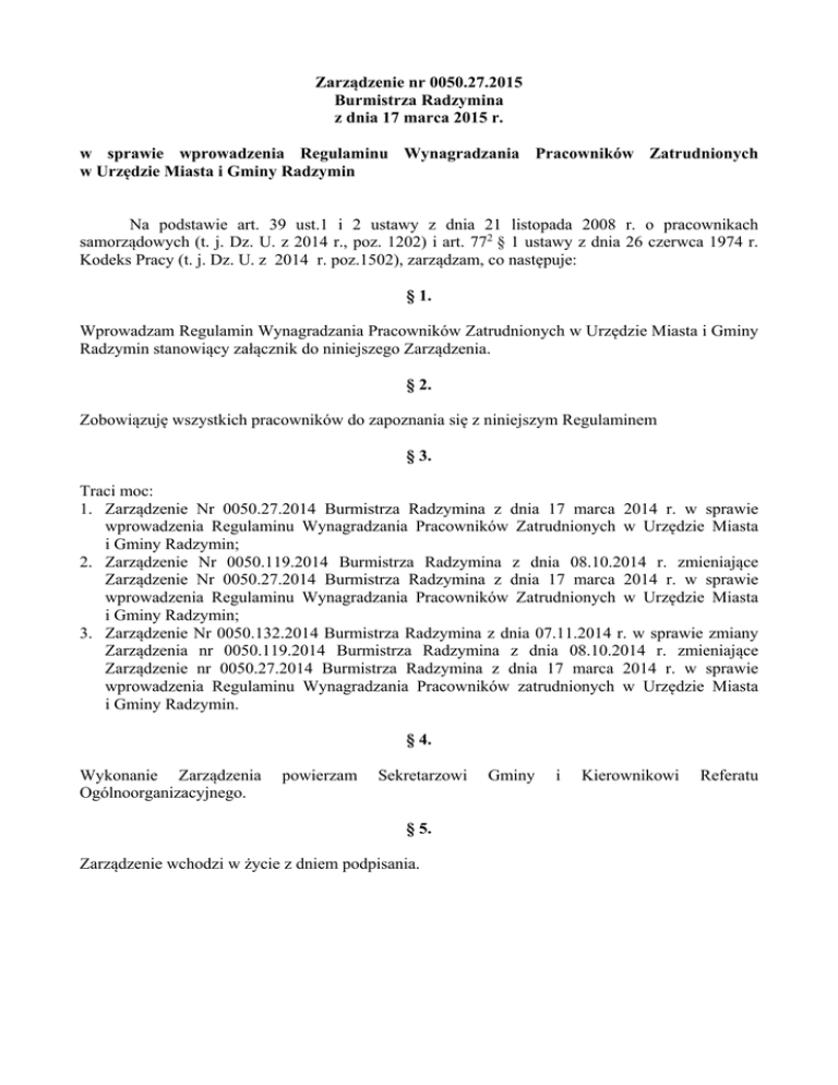 Zarządzenie nr 0050.27.2015 Burmistrza Radzymina z dnia 17 marca 2015 r. w sprawie wprowadzenia Regulaminu Wynagradzania Pracowników Zatrudnionych w Urzędzie Miasta i Gminy Radzymin Na podstawie art. 39 ust.1 i 2 ustawy z dnia 21 listopada 2008 r. o pracownikach samorządowych (t. j. Dz. U. z 2014 r., poz. 1202) i art. 772 § 1 ustawy z dnia 26 czerwca 1974 r. Kodeks Pracy (t. j. Dz. U. z 2014 r. poz.1502), zarządzam, co następuje: § 1. Wprowadzam Regulamin Wynagradzania Pracowników Zatrudnionych w Urzędzie Miasta i Gminy Radzymin stanowiący załącznik do niniejszego Zarządzenia. § 2. Zobowiązuję wszystkich pracowników do zapoznania się z niniejszym Regulaminem § 3. Traci moc: 1. Zarządzenie Nr 0050.27.2014 Burmistrza Radzymina z dnia 17 marca 2014 r. w sprawie wprowadzenia Regulaminu Wynagradzania Pracowników Zatrudnionych w Urzędzie Miasta i Gminy Radzymin; 2. Zarządzenie Nr 0050.119.2014 Burmistrza Radzymina z dnia 08.10.2014 r. zmieniające Zarządzenie Nr 0050.27.2014 Burmistrza Radzymina z dnia 17 marca 2014 r. w sprawie wprowadzenia Regulaminu Wynagradzania Pracowników Zatrudnionych w Urzędzie Miasta i Gminy Radzymin; 3. Zarządzenie Nr 0050.132.2014 Burmistrza Radzymina z dnia 07.11.2014 r. w sprawie zmiany Zarządzenia nr 0050.119.2014 Burmistrza Radzymina z dnia 08.10.2014 r. zmieniające Zarządzenie nr 0050.27.2014 Burmistrza Radzymina z dnia 17 marca 2014 r. w sprawie wprowadzenia Regulaminu Wynagradzania Pracowników zatrudnionych w Urzędzie Miasta i Gminy Radzymin. § 4. Wykonanie Zarządzenia Ogólnoorganizacyjnego. powierzam Sekretarzowi § 5. Zarządzenie wchodzi w życie z dniem podpisania. Gminy i Kierownikowi Referatu Załącznik do Zarządzenia Nr 0050.27.2015 Burmistrza Radzymina z dnia 17 marca 2015 r. REGULAMIN WYNAGRADZANIA PRACOWNIKÓW ZATRUDNIONYCH W URZĘDZIE MIASTA I GMINY RADZYMIN Radzymin, marzec 2015 rok. 1 REGULAMIN WYNAGRADZANIA PRACOWNIKÓW ZATRUDNIONYCH W URZĘDZIE MIASTA I GMINY RADZYMIN ROZDZIAŁ I PRZEPISY OGÓLNE § 1. Regulamin określa zasady i warunki wynagradzania za pracę oraz świadczenia związane z pracą wraz z warunkami ich przyznawania. § 2. Postanowienia Regulaminu dotyczą pracowników zatrudnionych w Urzędzie Miasta i Gminy Radzymin na podstawie umowy o pracę. § 3. Przed dopuszczeniem do pracy, nowozatrudniony pracownik zapoznaje się z treścią niniejszego Regulaminu i składa pisemne oświadczenie o zapoznaniu się z jego treścią. Oświadczenie dołącza się do akt osobowych pracownika. § 4. Ilekroć w Regulaminie jest mowa o: 1) burmistrzu - rozumie się przez to Burmistrza Radzymina; 2) zastępcy Burmistrza - rozumie się przez to Zastępcę Burmistrza Radzymina; 3) skarbniku - rozumie się przez to Skarbnika Gminy Radzymin; 4) sekretarzu - rozumie się przez to Sekretarza Gminy Radzymin; 5) kierowniku - rozumie się przez to kierownika wyodrębnionej komórki organizacyjnej Urzędu referatu lub biura; 6) pracowniku – rozumie się przez to osobę zatrudnioną w Urzędzie Miasta i Gminy Radzymin na podstawie umowy o pracę, bez względu na rodzaj umowy o pracę i wymiar czasu pracy; 7) pracodawcy – rozumie się przez to Burmistrza Radzymina; 8) urzędzie – rozumie się przez to Urząd Miasta i Gminy Radzymin; 9) rozporządzeniu w sprawie wynagradzania pracowników samorządowych – rozumie się przez to rozporządzenie Rady Ministrów z dnia 18 marca 2009 r. w sprawie wynagradzania pracowników samorządowych (t. j. Dz. U. z 2014 r. poz. 1876); 10) ustawie o pracownikach samorządowych - rozumie się przez to ustawę z dnia 21 listopada 2008 r. o pracownikach samorządowych (t. j. Dz. U. z 2014 r., poz. 1202); 11) Kodeksie pracy – rozumie się przez to ustawę z dnia 26 czerwca 1974 r. Kodeks pracy (t. j. z 2014 r., poz. 1502 ); 12) Najniższym wynagrodzeniu zasadniczym – rozumie się przez to najniższe wynagrodzenie zasadnicze w I kategorii zaszeregowania, określone w Załączniku Nr 1 do rozporządzenia w sprawie wynagradzania pracowników samorządowych; 13) minimalnym wynagrodzenie za pracę – rozumie się przez to minimalne wynagrodzenie szacowane w sposób określony w ustawie z 10 października 2002 r. o minimalnym wynagrodzeniu za pracę (Dz. U. Nr 200, poz. 1679 z późn. zm.); 14) Regulaminie – rozumie się przez to niniejszy Regulamin Wynagradzania Pracowników Zatrudnionych w Urzędzie Miasta i Gminy Radzymin; 2 ROZDZIAŁ II WYMAGANIA KWALIFIKACYJNE § 5. 1. Pracownikom Urzędu przysługuje wynagrodzenie stosowne do zajmowanego stanowiska oraz posiadanych kwalifikacji zawodowych. 2. Wymagania kwalifikacyjne niezbędne do wykonywania pracy na poszczególnych stanowiskach ustala się na poziomie minimalnych wymagań kwalifikacyjnych określonych w rozporządzeniu w sprawie wynagradzania pracowników samorządowych. ROZDZIAŁ III WYNAGRODZENIE ZA PRACĘ § 6. Wynagrodzenie zasadnicze 1. W Urzędzie obowiązuje czasowy system wynagradzania, polegający na ustaleniu dla poszczególnych pracowników kategorii zaszeregowania, stawek wynagrodzenia zasadniczego, dodatku stażowego oraz dodatku funkcyjnego. 2. Podstawą ustalania zaszeregowania pracownika jest Tabela III stanowiąca załącznik Nr 3 do niniejszego Regulaminu. 3. Tabela ujmująca minimalny i maksymalny poziom miesięcznych kwot wynagrodzenia zasadniczego w poszczególnych kategoriach zaszeregowania stanowi załącznik Nr 1 do niniejszego Regulaminu. § 7. 1. Decyzję o zastosowaniu dla danego pracownika stawki osobistego zaszeregowania podejmuje pracodawca. 2. W uzasadnionych przypadkach pracodawca może skrócić pracownikowi okres pracy zawodowej wymagany na danym stanowisku, z wyłączeniem stanowisk, dla których wymagany okres pracy zawodowej określają odrębne przepisy oraz art. 5 ust. 2 i art. 6 ust. 4 ustawy o pracownikach samorządowych. § 8. Dodatek funkcyjny 1. Pracownikom zatrudnionym na stanowiskach związanych z kierowaniem zespołem, radcy prawnemu oraz kierownikowi urzędu stanu cywilnego przys