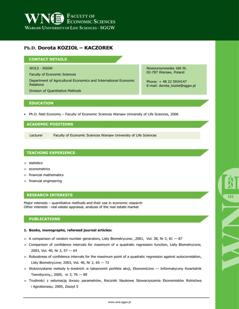 Ph.D. Dorota KOZIOŁ – KACZOREK CONTACT DETAILS WULS - SGGW Nowoursynowska 166 St. 02-787 Warsaw, Poland Faculty of Economic Sciences Department of Agricultural Economics and International Economic Relations Phone: + 48 22 5934147 E-mail: [email protected] Division of Quantitative Methods EDUCATION • Ph.D. field Economy – Faculty of Economic Sciences Warsaw University of Life Sciences, 2006 ACADEMIC POSITIONS Lecturer Faculty of Economic Sciences Warsaw University of Life Sciences TEACHING EXPERIENCE • statistics • econometrics • financial mathematics • financial engineering RESEARCH INTERESTS Major interests – quantitative methods and their use in economic research Other interests - real estate appraisal, analysis of the real estate market PUBLICATIONS 1. Books, monographs, refereed journal articles: • A comparison of random number generators, Listy Biometryczne; ,2001, Vol. 38, Nr 2, 81 — 87 • Comparison of confidence intervals for maximum of a quadratic regression function, Listy Biometryczne; 2003, Vol. 40, Nr 2, 57 — 64 • Robustness of confidence intervals for the maximum point of a quadratic regression against autocorrelation, Listy Biometryczne; 2003, Vol. 40, Nr 2, 65 — 72 • Wykorzystanie metody k–średnich w taksonomii portfela akcji, Ekonomiczno — Informatyczny Kwartalnik Teoretyczny,; 2005, nr 3, 76 — 89 • Trudności z estymacją ilorazu parametrów, Roczniki Naukowe Stowarzyszenia Ekonomistów Rolnictwa i Agrobiznesu; 2005, Zeszyt 5 www.wne.sggw.pl • ,,Screening telediagnostics of spinal deformities based on optical 3D shape measurement system and automatem data analysis – preliminary report” Informatics & Technology Ed.: Piętka E., Łęski J., Franiel S. Medical Informatics and Technologies 2006 • Postępy Międzynarodowej Telemedycyny i eZdrowia (Telemedycyna i eZdrowie na świecie) – monografia t.1; MediaPage; 2006 – przekład • „Robustification of confidence intervals for the maximum point of a quadratic regression against autocorrelation”; Listy Biometryczne; 2008, Vol. 45(2), 1 – 8 • Prognoza optymalnego terminu sadzenia sałaty w uprawach szklarniowych; Zeszyty Naukowe Szkoły Głównej Gospodarstwa Wiejskiego w Warszawie Problemy Rolnictwa Światowego; 2009, t. 9 (XXIV), s. 83-88 • Czynniki wpływające na wartość nieruchomości rolnej; Roczniki Naukowe Stowarzyszenia Ekonomistów Rolnictwa i Agrobiznesu; 2009, t. 11, z. 2, s. 120 – 125 • Czynniki kształtujące efektywność przedsiębiorstw wielkoobszarowych; Roczniki Naukowe Stowarzyszenia Ekonomistów Rolnictwa i Agrobiznesu; 2010, t. 12, z. 3, s. 136 – 140 • Zmienne decydujące o wartości rynkowej nieruchomości rolnej z zastosowaniem AHP; Roczniki Naukowe Stowarzyszenia Ekonomistów Rolnictwa i Agrobiznesu; 2011, T. 13, z. 2, s. 236-239 • Analiza cen nieruchomości z wykorzystaniem statystyki Morana; Studia i Materiały Towarzystwa Naukowego Nieruchomości; 2011, Vol. 19, nr 3, s. 182-191 • Statystyka Morana w analizie rozkładu cen nieruchomości; Metody ilościowe w badaniach ekonomicznych;2011, t. XII (2), s. 222-232 • Zastosowanie adaptacyjnego przedziału ufności do oszacowania różnicy dwóch średnich w badaniach ekonomicznych; Zeszyty Naukowe Szkoły Głównej Gospodarstwa Wiejskiego w Warszawie Problemy Rolnictwa Światowego; 2011, t. 11 (26), z. 4, s. 118-124 • Matematyka, matematyka finansowa i inżynieria finansowa realizowane na kierunkach ekonomicznych w świetle obowiązujących standardów nauczania; Didactics of mathematics; 2011, t. 8 (12), s. 31 – 37 • Hierarchizacja cech nieruchomości z zastosowaniem analitycznego procesu hierarchicznego; Studia i Materiały Towarzystwa Naukowego Nieruchomości; 2012, t. 20 (nr 1), s. 165-175 2. Handbooks, teaching materials: • Zbiór zadań z podstaw statystyki i ekonometrii, WSEI, 2001, Warszawa • Zbiór zadań z podstaw ekonometrii, WSEI, 2005, Warszawa www.wne.sggw.pl