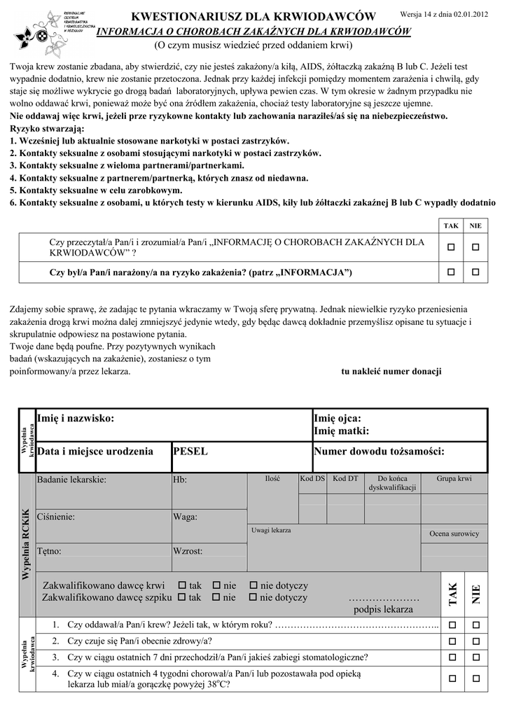 KWESTIONARIUSZ DLA KRWIODAWCÓW Wersja 14 z dnia 02.01.2012 INFORMACJA O CHOROBACH ZAKAŹNYCH DLA KRWIODAWCÓW (O czym musisz wiedzieć przed oddaniem krwi) Twoja krew zostanie zbadana, aby stwierdzić, czy nie jesteś zakażony/a kiłą, AIDS, żółtaczką zakaźną B lub C. Jeżeli test wypadnie dodatnio, krew nie zostanie przetoczona. Jednak przy każdej infekcji pomiędzy momentem zarażenia i chwilą, gdy staje się możliwe wykrycie go drogą badań laboratoryjnych, upływa pewien czas. W tym okresie w żadnym przypadku nie wolno oddawać krwi, ponieważ może być ona źródłem zakażenia, chociaż testy laboratoryjne są jeszcze ujemne. Nie oddawaj więc krwi, jeżeli prze ryzykowne kontakty lub zachowania naraziłeś/aś się na niebezpieczeństwo. Ryzyko stwarzają: 1. Wcześniej lub aktualnie stosowane narkotyki w postaci zastrzyków. 2. Kontakty seksualne z osobami stosującymi narkotyki w postaci zastrzyków. 3. Kontakty seksualne z wieloma partnerami/partnerkami. 4. Kontakty seksualne z partnerem/partnerką, których znasz od niedawna. 5. Kontakty seksualne w celu zarobkowym. 6. Kontakty seksualne z osobami, u których testy w kierunku AIDS, kiły lub żółtaczki zakaźnej B lub C wypadły dodatnio TAK NIE Czy przeczytał/a Pan/i i zrozumiał/a Pan/i „INFORMACJĘ O CHOROBACH ZAKAŹNYCH DLA KRWIODAWCÓW” ? Czy był/a Pan/i narażony/a na ryzyko zakażenia? (patrz „INFORMACJA”) Wypełnia RCKiK Wypełnia krwiodawca Zdajemy sobie sprawę, że zadając te pytania wkraczamy w Twoją sferę prywatną. Jednak niewielkie ryzyko przeniesienia zakażenia drogą krwi można dalej zmniejszyć jedynie wtedy, gdy będąc dawcą dokładnie przemyślisz opisane tu sytuacje i skrupulatnie odpowiesz na postawione pytania. Twoje dane będą poufne. Przy pozytywnych wynikach badań (wskazujących na zakażenie), zostaniesz o tym poinformowany/a przez lekarza. tu nakleić numer donacji Imię i nazwisko: Imię ojca: Imię matki: Data i miejsce urodzenia PESEL Badanie lekarskie: Hb: Ciśnienie: Waga: Ilość Kod DS Kod DT Do końca dyskwalifikacji Uwagi lekarza Tętno: Grupa krwi Ocena surowicy Wzrost: NIE nie dotyczy nie dotyczy TAK Zakwalifikowano dawcę krwi tak nie Zakwalifikowano dawcę szpiku tak nie Wypełnia krwiodawca Numer dowodu tożsamości: 1. Czy oddawał/a Pan/i krew? Jeżeli tak, w którym roku? …………………………………………….. 2. Czy czuje się Pan/i obecnie zdrowy/a? 3. Czy w ciągu ostatnich 7 dni przechodził/a Pan/i jakieś zabiegi stomatologiczne? 4. Czy w ciągu ostatnich 4 tygodni chorował/a Pan/i lub pozostawała pod opieką lekarza lub miał/a gorączkę powyżej 38oC? ………………… podpis lekarza TAK NIE 5. a) Czy w ciągu ostatnich 4 tygodni przyjmował/a Pan/i jakiekolwiek lekarstwa (tabletki, zastrzyki, czopki). Dotyczy także leków Proscar ® przeciw przerostowi prostaty i Roaccutan® przeciw trądzikowi. Jeżeli tak, to jakie? ……………………………………………………………………… Wypełnia krwiodawca Wypełnia krwiodawca Wypełnia krwiodawca b) Czy w ciągu ostatnich 3 dni przyjmował/a Pan/i leki przeciwzapalne lub przeciwbólowe, np. Piroxicam (Felden), aspirynę, paracetamol, ibuprofen? 6. Czy w ciągu ostatnich 4 tygodni przechodził/a Pan/i szczepienia? Jeśli tak, to jakie? ……………………………………………………………………………………. Kiedy? ……………………………………………………………………………………………….. 7. Czy zauważył/a Pan/i u siebie następujące objawy: a) nieuzasadniony spadek ciężaru ciała b) nieuzasadnioną gorączkę c) powiększenie węzłów chłonnych 8. Czy choruje Pan/i bądź chorowała na jedno z niżej wymienionych schorzeń, ewentualnie odczuwa lub odczuwał/a Pan/i niżej wymienione dolegliwości? a) choroby układu krążenia (nadciśnienie), dolegliwości ze stron serca zawał serca, duszność, udar mózgu Jeżeli tak, to kiedy ? ………………………………………………………………… b) choroby skóry, wypryski/wysypka, uczulenia, b) katar sienny, astma, łuszczyca, inne …………………….. Jeżeli tak, to kiedy ? …………………………………………………………………. c) cukrzyca, choroby krwi, przedłużone krwawienie, nowotwór choroby naczyń krwionośnych, choroby nerek, padaczka choroby przewodu pokarmowego, choroby tarczycy, choroby nerwowe choroby płuc, zapalenie szpiku, inne ……………………………………….. d) kiła, rzeżączka, toksoplazma, bruceloza, gruźlica mononukleoza zakaźna, gorączka Q, Wirus Zachodniego Nilu, inne ………… Jeżeli tak, to kiedy ? …………………………………………………………………. 9. Czy w ciągu ostatnich 6 miesięcy miał/a Pan/i wykonywaną gastroskopię, biopsję lub inne badania diagnostyczne? Jeżeli tak, to kiedy? …………………………………………………………………………………. 10. Czy w ciągu ostatnich 6 miesięcy lub od czasu ostatniego oddania krwi chorował/a Pan/i ciężko albo przebył/a zabieg operacyjny lub wypadek? Jeżeli tak, to kiedy ? ………………………………………………………………………………… 11. Czy kiedykolwiek otrzymał/a Pan/i transfuzję krwi lub jej składników? Jeżeli tak, to jakie, kiedy i gdzie (w Polsce czy za granicą) ? ………………………………………. 12. Czy kiedykolwiek był/a Pan/i biorcą przeszczepu (np. rogówki lub innych tkanek)? Jeżeli tak, to jakich? …………………………………………………………………………………. 13. Czy kiedykolwiek otrzymała/a Pan/i hormon wzrostu? 14. Czy ktokolwiek z Pan/i rodziny ciepi/cierpiał na chorobę Creutzfelda-Jakoba? 15. Czy Pan/i w okresie od 01.01.1980r. do 31.12.1996r. przebywał/a łącznie przez okres 6 miesięcy lub dłużej w Wielkiej Brytanii, Francji lub Irl