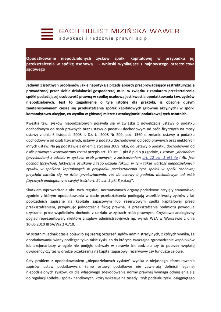 Opodatkowanie niepodzielonych zysków spółki kapitałowej w przypadku jej przekształcenia w spółkę osobową - wnioski wynikające z najnowszego orzecznictwa sądowego Jednym z istotnych problemów jakie napotykają przedsiębiorcy przeprowadzający restrukturyzację prowadzonej przez siebie działalności gospodarczej m.in. w związku z zamiarem przekształcenia spółki posiadającej osobowość prawną w spółkę osobową jest kwestia opodatkowania tzw. zysków niepodzielonych. Jest to zagadnienie o tyle istotne dla praktyki, iż obecnie dużym zainteresowaniem cieszą się przekształcenia spółek kapitałowych (głownie akcyjnych) w spółki komandytowo-akcyjne, co wynika w głównej mierze z atrakcyjności podatkowej tych ostatnich. Kwestia tzw. zysków niepodzielonych pojawiła się w związku z nowelizacją ustawy o podatku dochodowym od osób prawnych oraz ustawy o podatku dochodowym od osób fizycznych na mocy ustawy z dnia 6 listopada 2008 r. Dz. U. 2008 Nr 209, poz. 1360 o zmianie ustawy o podatku dochodowym od osób fizycznych, ustawy o podatku dochodowym od osób prawnych oraz niektórych innych ustaw. Na jej podstawie z dniem 1 stycznia 2009 roku, do ustawy o podatku dochodowym od osób prawnych wprowadzony został przepis art. 10 ust. 1 pkt 8 p.d.o.p zgodnie, z którym „dochodem (przychodem) z udziału w zyskach osób prawnych, z zastrzeżeniem art. 12 ust. 1 pkt 4a i 4b, jest dochód (przychód) faktycznie uzyskany z tego udziału (akcji), w tym także wartość niepodzielonych zysków w spółkach kapitałowych w przypadku przekształcenia tych spółek w spółki osobowe; przychód określa się na dzień przekształcenia, zaś do ustawy o podatku dochodowym od osób fizycznych analogiczny w swojej treści art. 24 ust. 5 pkt 8 p.d.o.f”. Skutkiem wprowadzenia obu tych regulacji normatywnych organy podatkowe przyjęły stanowisko, zgodnie z którym opodatkowaniu w dacie przekształcenia podlegają wszelkie kwoty zysków z lat poprzednich zapisane na kapitale zapasowym lub rezerwowym spółki kapitałowej przed przekształceniem, przyjmując jednocześnie fikcję prawną, iż przekształcenie podmiotu powoduje uzyskanie przez wspólników dochodu z udziału w zyskach osób prawnych. Częściowo analogiczny pogląd reprezentowały niektóre z sądów administracyjnych np. wyrok WSA w Warszawie z dnia 10.06.2010 III SA/Wa 270/10. W ostatnim jednak czasie pojawiło się szereg orzeczeń sądów administracyjnych, z których wynika, że opodatkowaniu winny podlegać tylko takie zyski, co do których zwyczajne zgromadzenie wspólników lub akcjonariuszy w ogóle nie podjęło uchwały w sprawie ich podziału czy to poprzez wypłatę dywidendy czy też w drodze przekazania na kapitał zapasowy, rezerwowy czy fundusze celowe. Cały problem z opodatkowaniem „niepodzielonych zysków" wynika z niejasnego sformułowania zapisów ustaw podatkowych. Same ustawy podatkowe nie zawierają definicji legalnej niepodzielonych zysków, co dla właściwego zdekodowania normy prawnej wymaga odniesienia się do regulacji Kodeksu spółek handlowych, który wskazuje na zasady i tryb podziału zysku osiągniętego GACH, HULIST, MIZIŃSKA, WAWER – ADWOKACI I RADCOWIE PRAWNI SP.P. przez spółkę w poprzednim roku obrotowym. Zasadą na gruncie tej ustawy jest podział zysków spółki pomiędzy jej wspólników w stosunku do posiadanych przez nich udziałów, chyba, że Zwyczajne zgromadzenie wspólników/akcjonariuszy bazując na postanowieniach umowy/statutu spółki postanowi o ich przekazaniu np. na inne fundusze lub kapitały podmiotu. W myśl art. 191 k.s.h. wspólnik spółki z ograniczona odpowiedzialnością ma prawo do udziału w zysku wynikającym z rocznego sprawozdania finansowego i przeznaczonym do podziału uchwałą zgromadzenia wspólników. Analogiczne regulacje w odniesieniu do spółki akcyjnej formułuje art. 347 k.s.h. Natomiast zgodnie z art. 192 k.s.h. (odpowiednio art. 348 §1 k.s.h. w stosunku do spółki akcyjnej) kwota przeznaczona do podziału pomiędzy wspólników nie może przekroczyć zysku za ostatni rok obrotowy spółki z ograniczoną odpowiedzialnością, powiększonego o niepodzielone zyski z lat ubiegłych oraz o kwoty przeniesione z utworzonych z zysków kapitałów zapasowego i rezerwowych, które mogą być przeznaczone do podziału. Kwotę tę należy pomniejszyć o niepokryte straty, udziały własne oraz o kwoty, które zgodnie z ustawą lub umową spółki powinny być przekazane z zysku za ostatni rok obrotowy na kapitał zapasowy lub rezerwowy. W pełni dopuszczalne prawnie jest także dokonanie podziału, rozporządzenie zyskiem poprzez pozostawienie go w spółce i zapisanie na odpowiednich kapitałach lub funduszach podmiotu. W tym wypadku pojęcie zysku podzielonego nie sprowadza się do jego dystrybucji pomiędzy wspólników spółki, a oznacza wszelkie jego przeznaczenie na mocy podjętej w tym przedmiocie decyzji wspólników. Sformułowanie zawarte w ustawach o podatkach dochodowych dotyczące „zysków niepodzielonych" nie pozwala na jednoznaczne określenie, czy chodzi tutaj o zyski, które zostały pozostawione w spółce, a zatem niewypłacone na rzecz wspólników czy akcjonariuszy czy też dodatkowo także o zyski zapisane na kapitałach rezerwowych czy zapasowym lub innych funduszach podmiotu. W związku z tym uprawnione pozostaje przyjęcie, że chodzić może w tym przypadku wyłącznie o takie zyski, co do których pomimo ich zatwierdzenia Zgromadzenie Wspólników lub Akcjonariuszy nie podjęło żadnej decyzji. Przyjęcie stanowiska prezentowanego przez organy podatkowe, tj. iż opodatkowaniu podlega wartość kwot ujętych na kapitałach rezerwowych, kapitale zapasowym czy innych funduszach, które zostały utworzone w związku z przekazaniem zysków w latach poprzednich prowadziłoby - wobec braku jasno wyrażonej normy prawnej - do nałożenia na podatników obowiązku podatkowego w innej drodze niż ustawa, co 